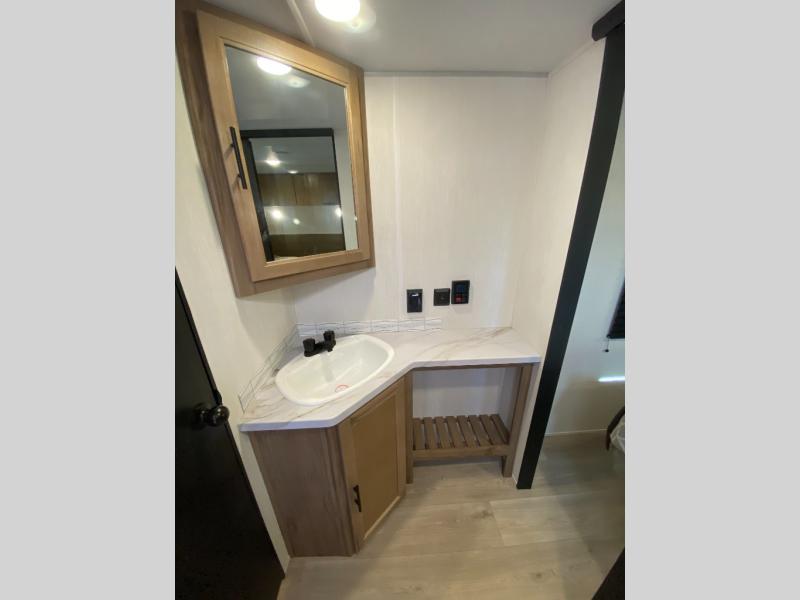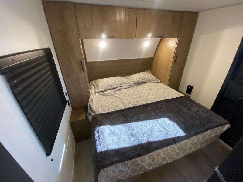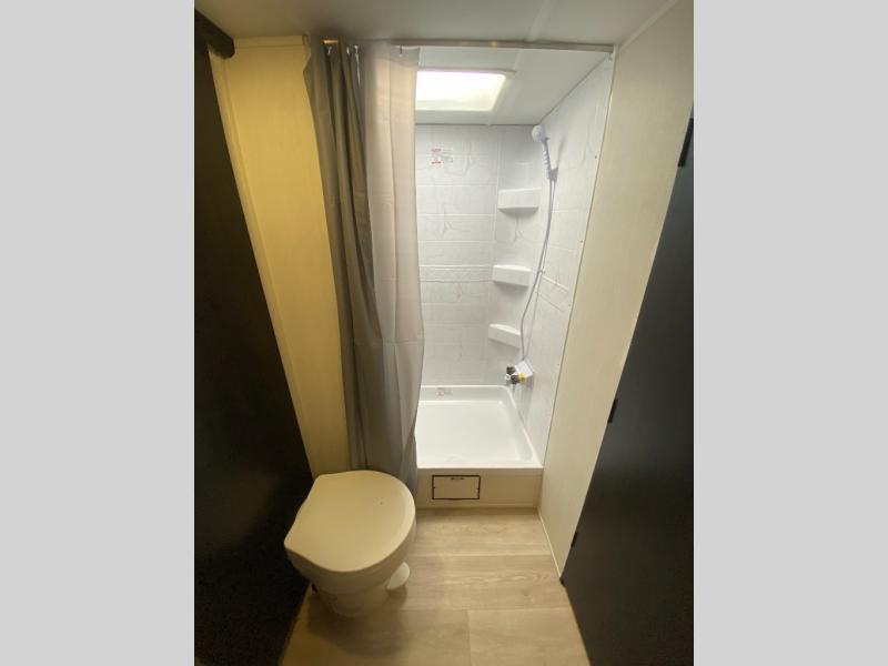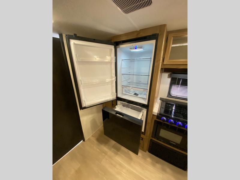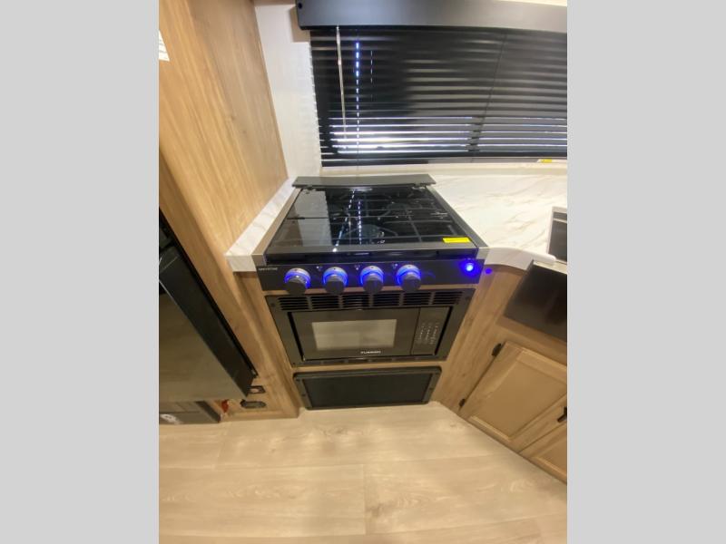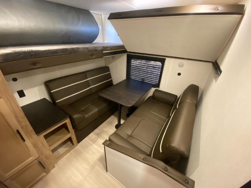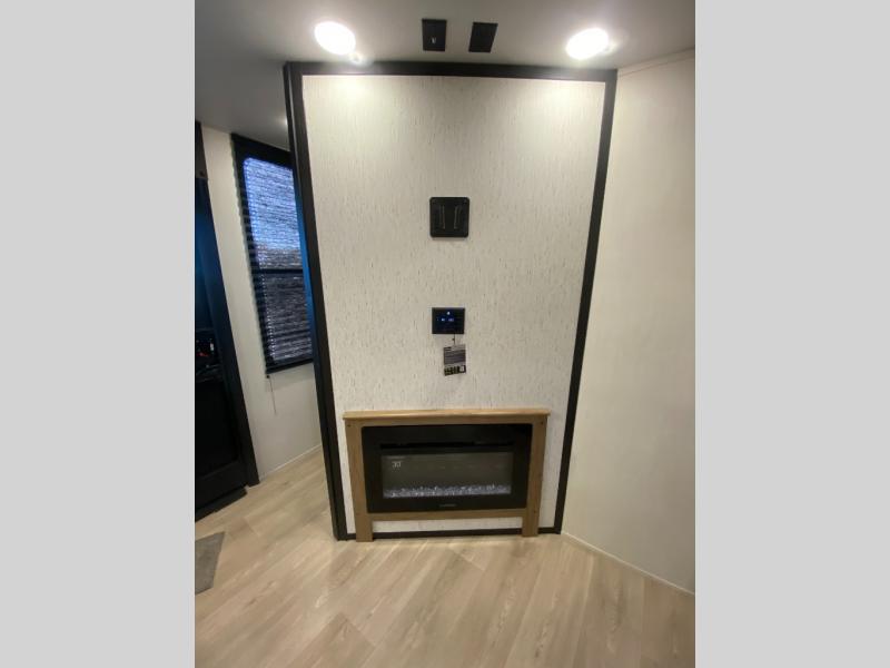 You will love how easy it is to enter/exit this travel trailer with dual entry doors! The rear door leads into the living/kitchen area where you will notice the large U-shaped dinette and the sofa which sit on the slide and create a spacious footprint for moving about, as well as great places to play games and socialize with your friends and family. Plus, there is an entertainment center with a fireplace and a fully equipped kitchen to keep everyone's bellies filled with delicious home cooked meals. At night, there is sleeping space for everyone between the bunks above the sofas with a table in the rear private bunkhouse and the queen-size bed in the front private bedroom, plus the furniture can convert into sleeping spaces. The walk-through bathroom leads directly into the bedroom too!