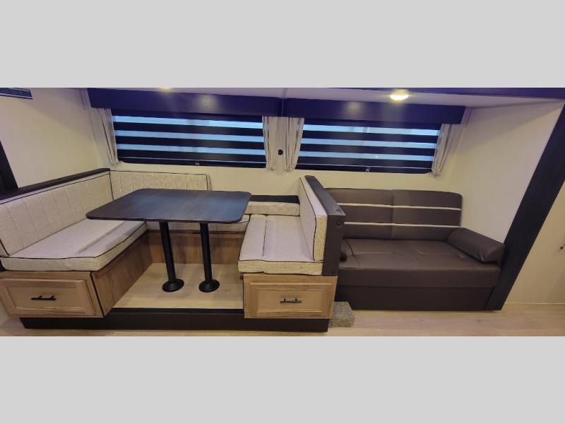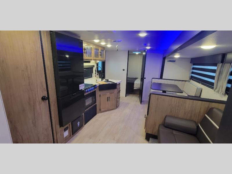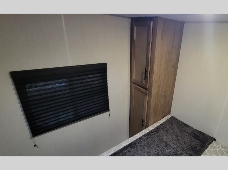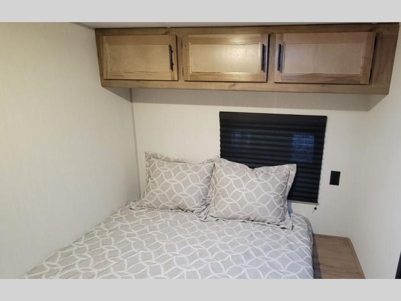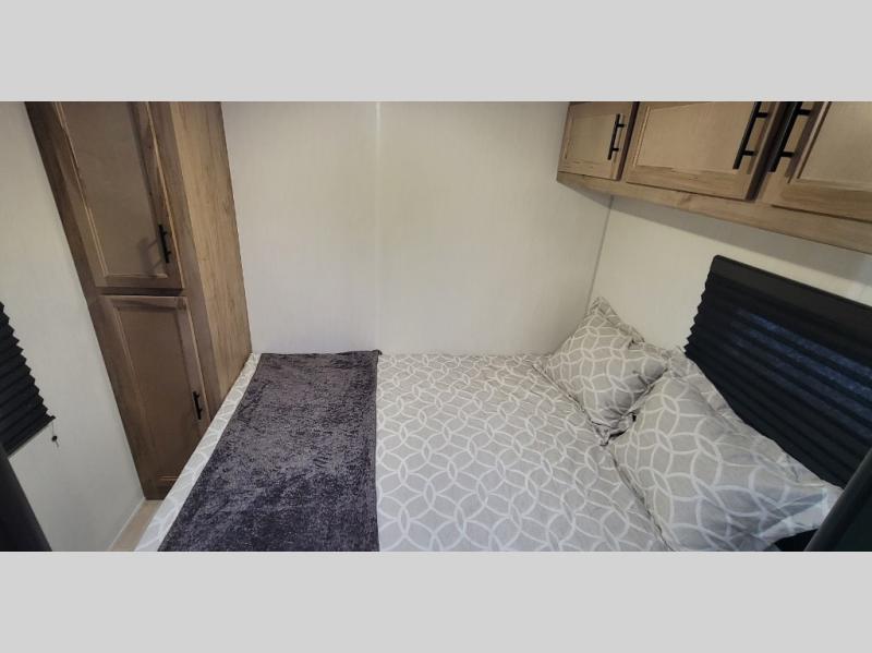 You will have such a great time making memories in this Cherokee Grey Wolf travel trailer! This amazing trailer not only has a master suite up front, but it also has another private bedroom in the back which means that both you and the rest of your fellow campers will sleep peacefully and privately. There is also a U-shaped dinette and sofa on the large slide in the main living area so that if you have anyone else traveling with you, they can also have a place to sleep. A full kitchen with a three-burner cooktop and oven will help you whip up a hearty meal to replenish your tired bodies, and a oversized pantry will hold onto your snacks and sweets for later.