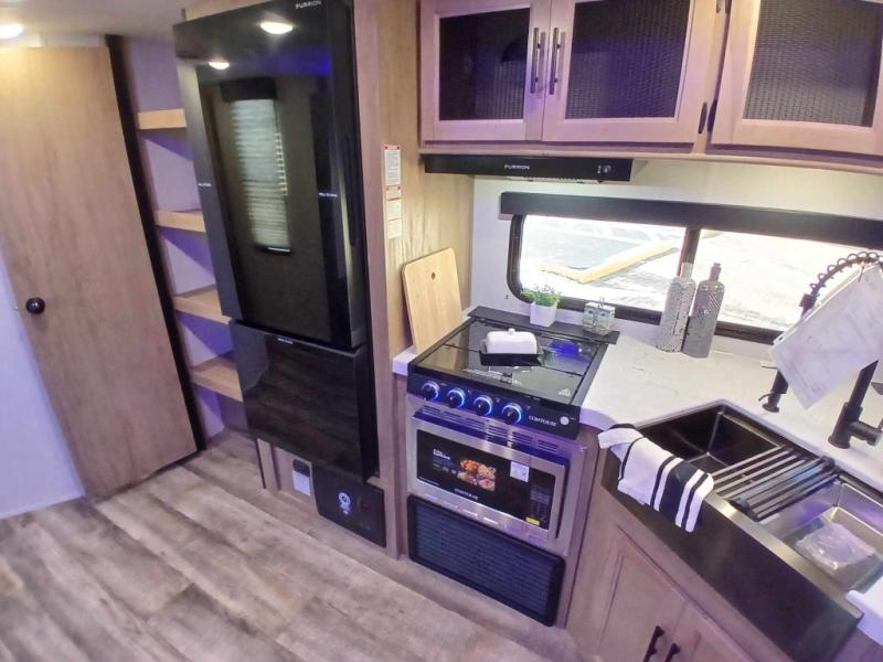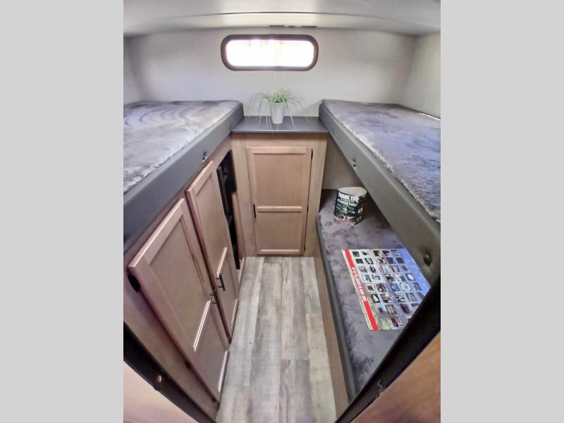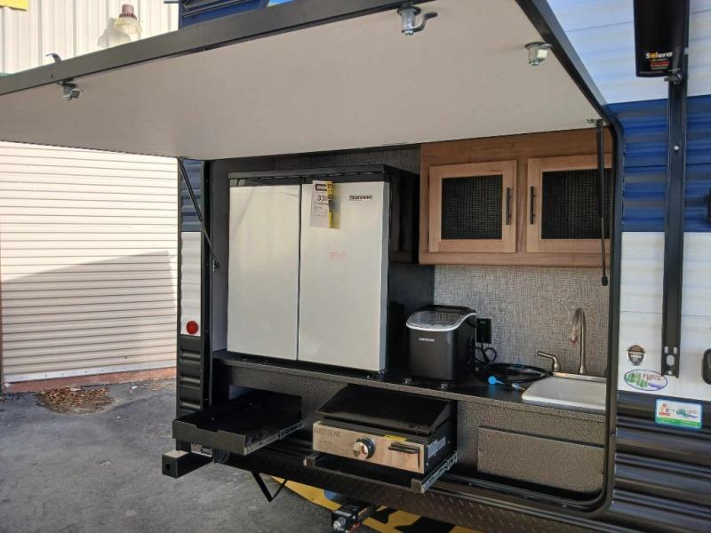 Your larger family will love spending weekends away with this Cherokee Grey Wolf travel trailer as their home away from home. This model offers lots of sleeping space with three bunk beds in the rear private bunkhouse. In the front, there is a master suite with wardrobes and nightstands on either side of the RV king bed, and it even has private access to the dual-entry bath. The two entry doors will make accessing the trailer easy for everyone, and you will appreciate the abundant storage throughout this unit including large overhead cabinets, a spacious pantry, and numerous outside storage compartments for all of your outdoor gear. There's even an outside bar & grill!