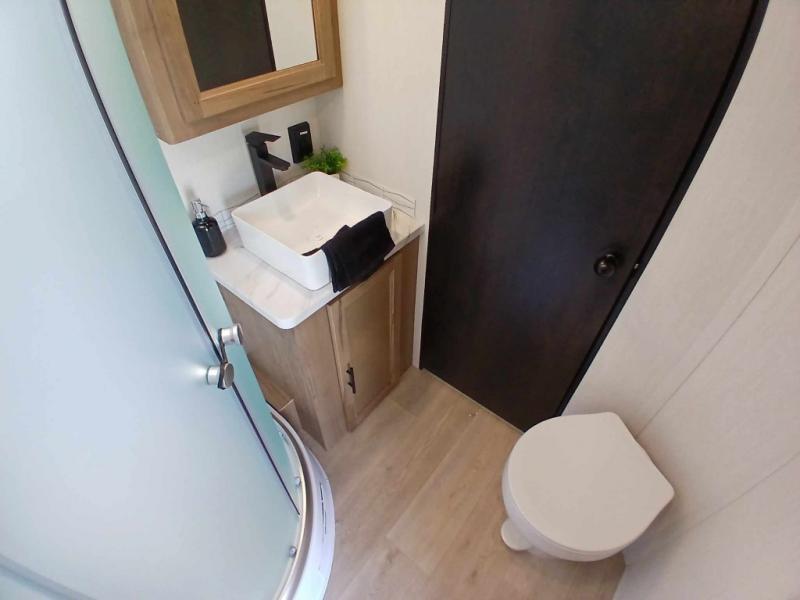 You will love this Cherokee Grey Wolf Black Label toy hauler with a rear ramp door for loading and unloading your toys and gear. If you position the fold-down sofas up against the wall, you will have even more room for extra gear when you are moving down the road. Set up camp and easily create a great dining area with the table between each fold-down sofa. You can also create your best meals in a breeze with the air fryer, and a large pantry allows you to pack all of the snacks and canned goods you need for your adventure. You will appreciate the master suite up front for a great night's rest on the RV king bed along with easy access into the dual-entry bath.