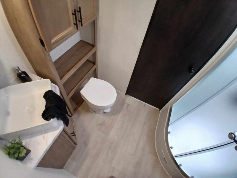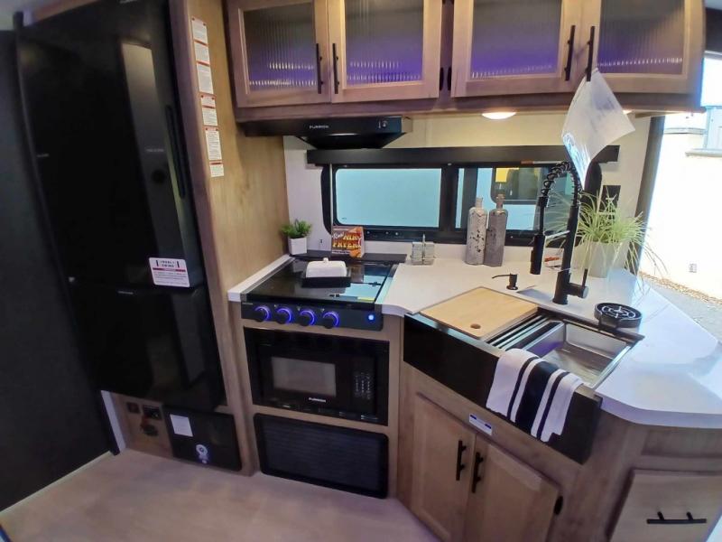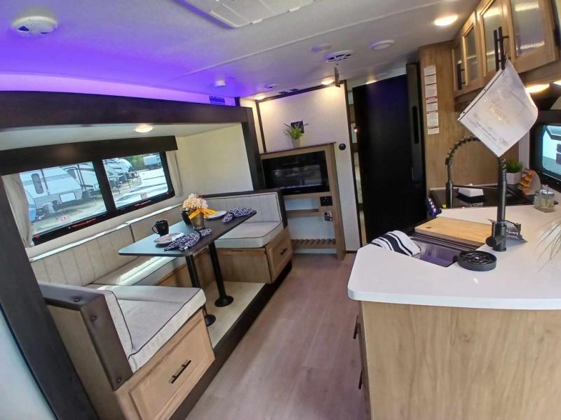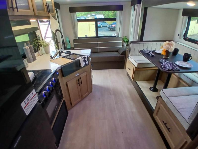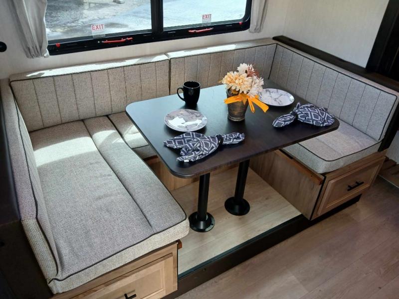 This Cherokee Grey Wolf Black Label travel trailer is perfect for your small family and will leave you planning your next outing before you are back from your current weekend away! You will find all of the comforts you need with plenty of livable space including a U-shaped dinette slide. There is also a sofa for more seating when company arrives, and there are end tables on either side to prevent spills. A spacious walk-through bath leads to a front private bedroom where you will enjoy a great night's rest on a comfortable RV king bed. You will find ample storage for clothing in the wardrobes that are above handy nightstands for your personal things. There are even lights mounted above the bed on each side which makes it easy to read a couple of chapters before drifting off to sleep.