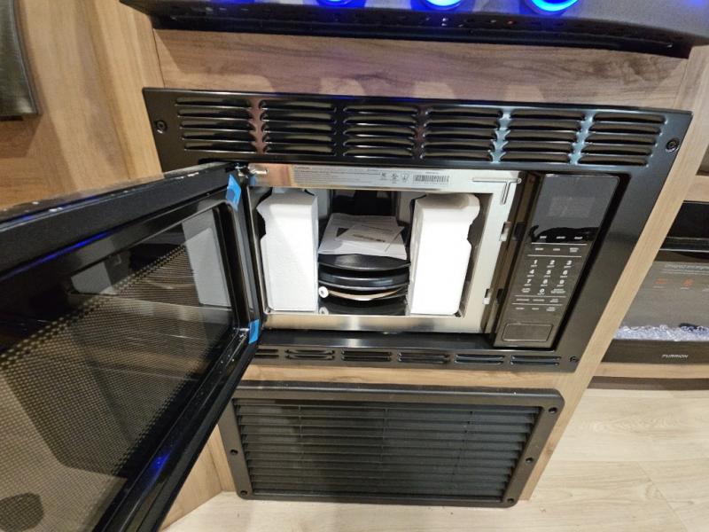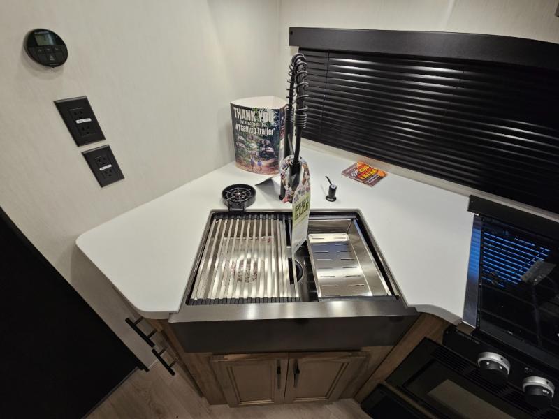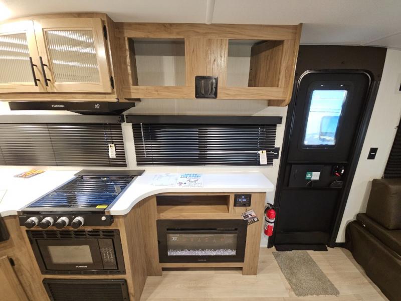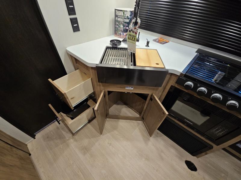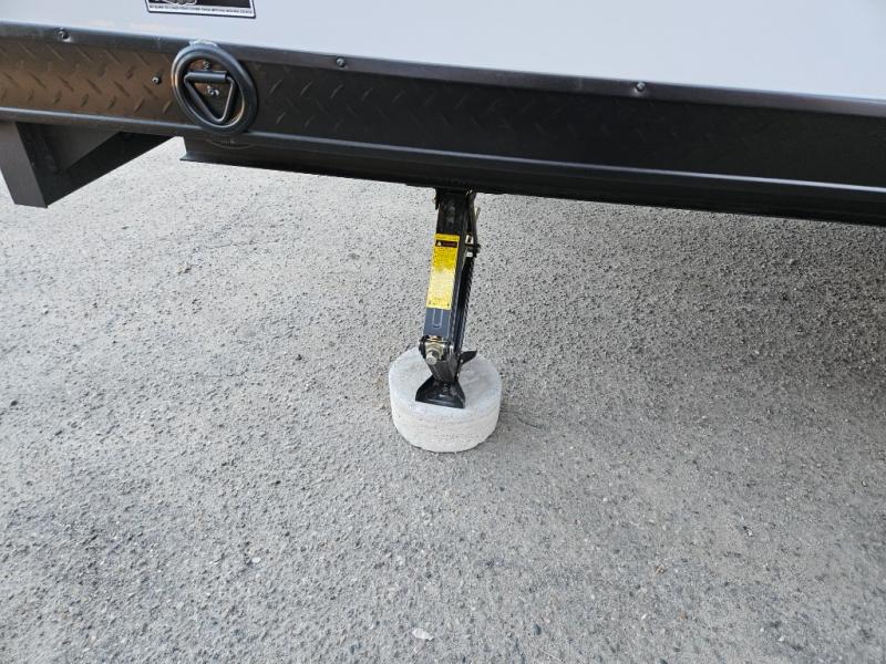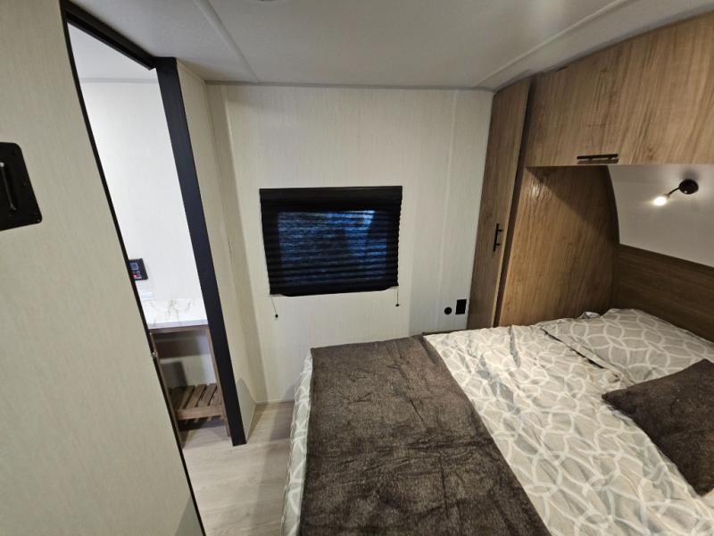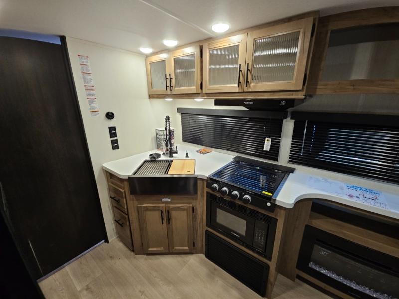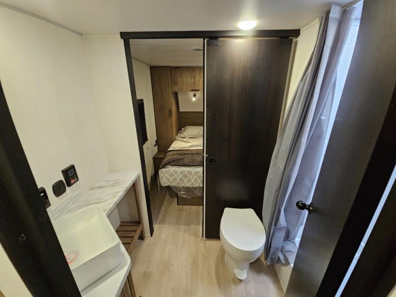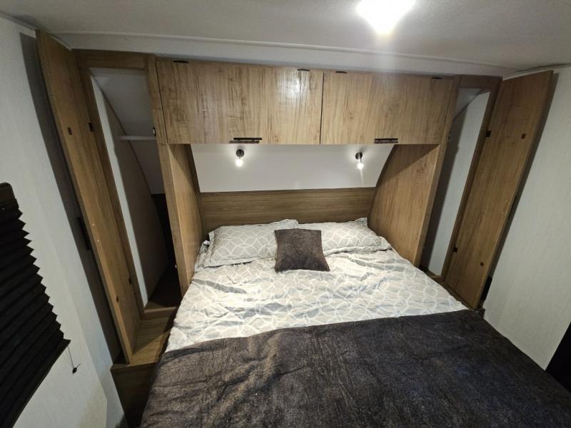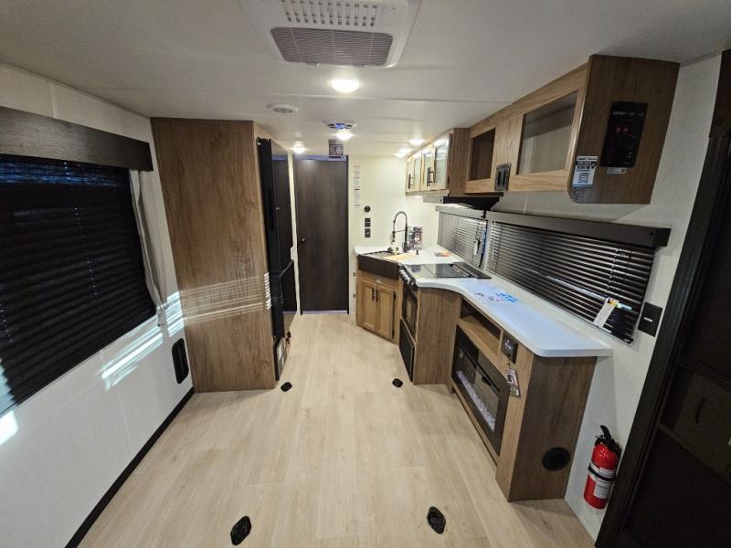 This dual entry toy hauler will allow you to enter in through the main living area or the front master bedroom for convenience! There is a walk-through bath that will be easily accessible for everyone, and there is plenty of storage space for personal belongings. Head to the full kitchen to prepare a home cooked meal, or head outdoors to enjoy the mini kitchen. There is also an outside TV mount if you brought a TV along, and a 15' power awning to provide shade. You can easily unload your toys using the ramp door, then relax on the fold-down sofas with a removable tale.
