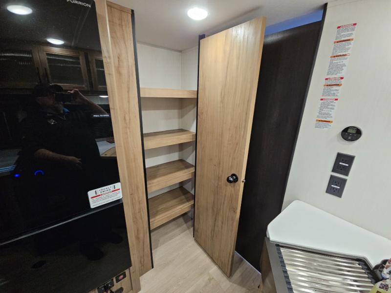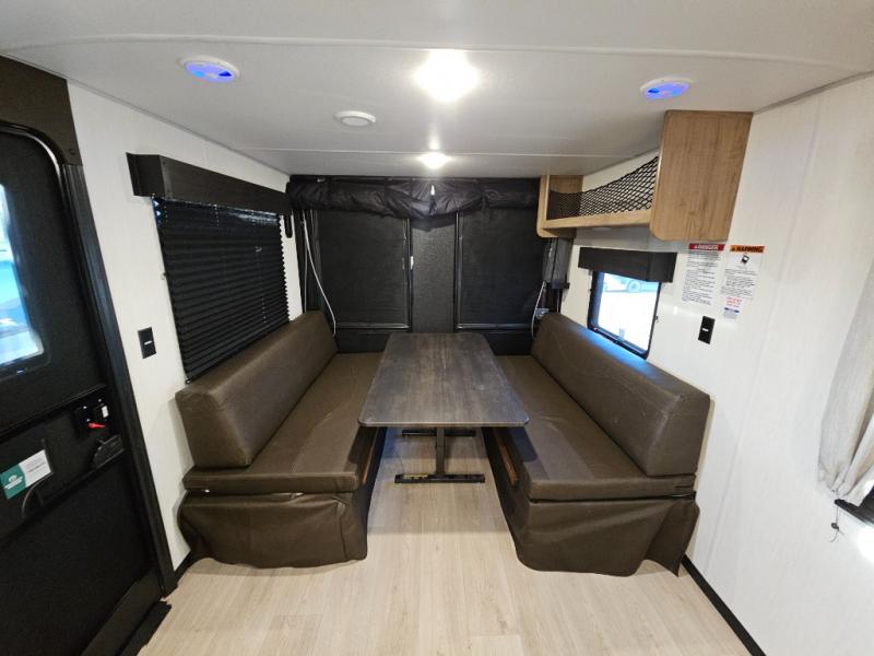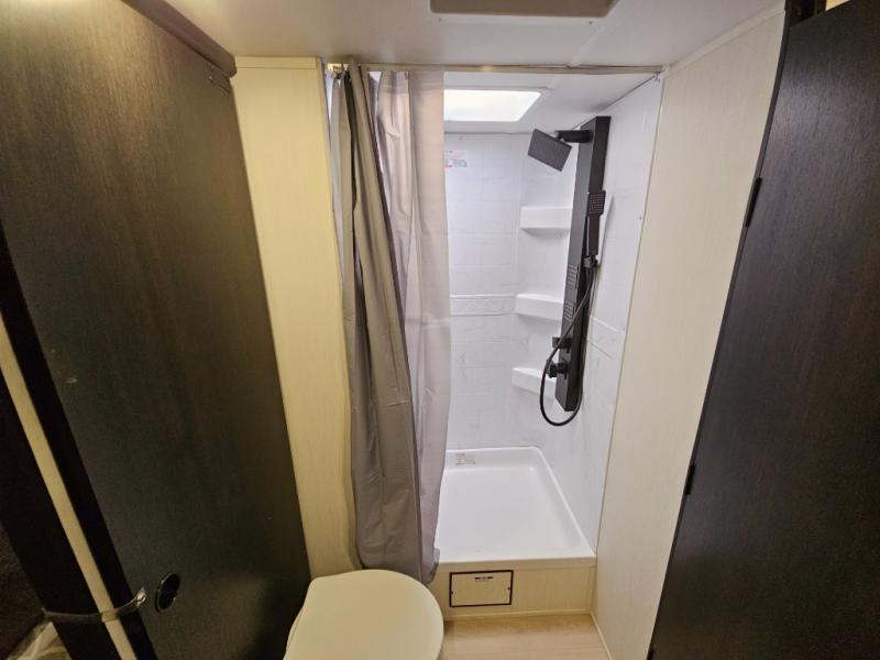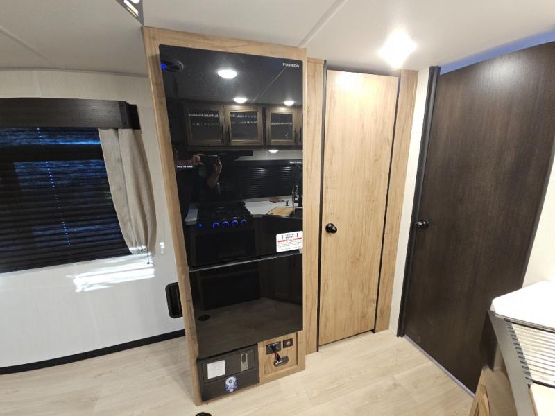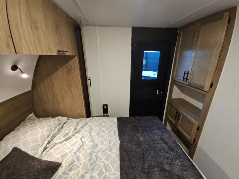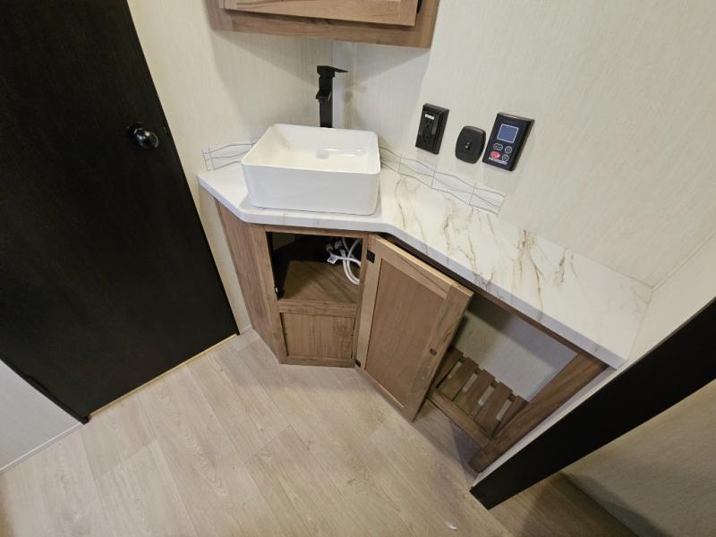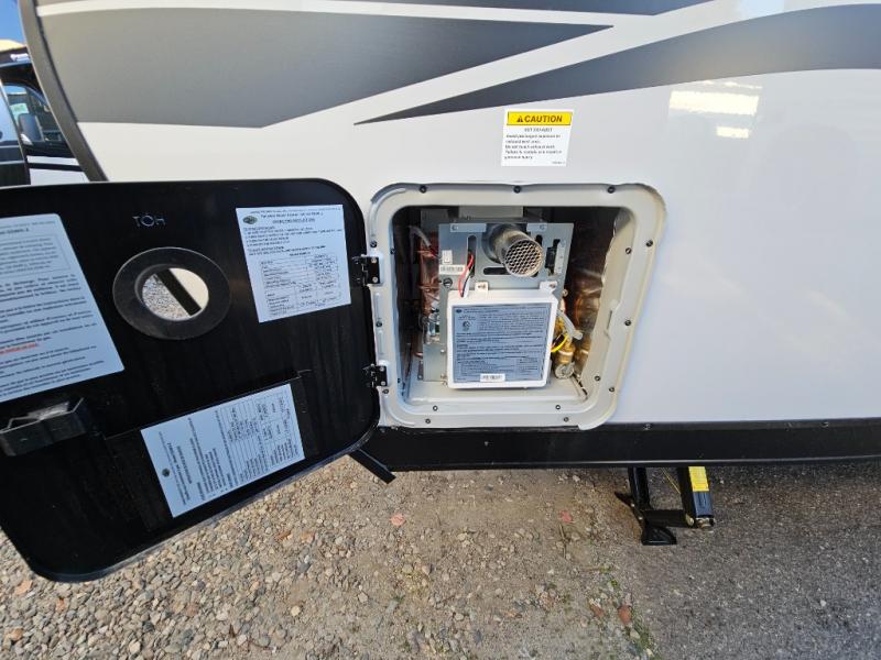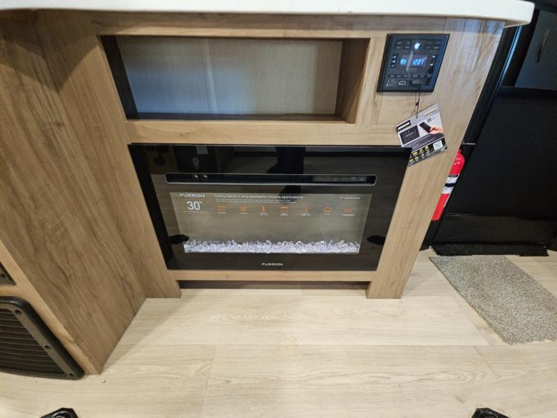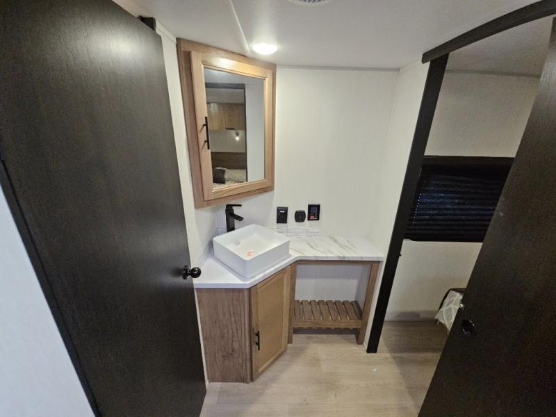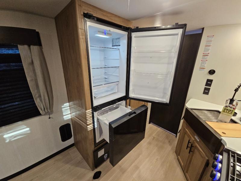 This dual entry toy hauler will allow you to enter in through the main living area or the front master bedroom for convenience! There is a walk-through bath that will be easily accessible for everyone, and there is plenty of storage space for personal belongings. Head to the full kitchen to prepare a home cooked meal, or head outdoors to enjoy the mini kitchen. There is also an outside TV mount if you brought a TV along, and a 15' power awning to provide shade. You can easily unload your toys using the ramp door, then relax on the fold-down sofas with a removable tale.