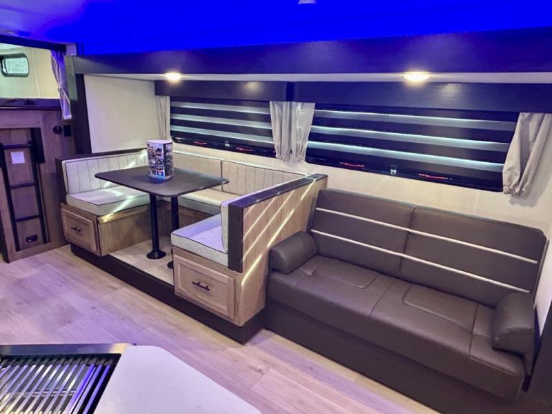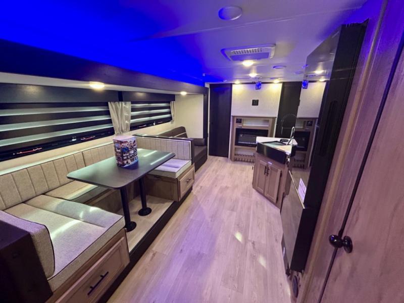 Come on inside this Cherokee Grey Wolf Black Label travel trailer and experience the convenience of a smooth flow of traffic in and out with two entry doors. The rear door leads into a full bath which is great for accessibility when outside and when you need to use the bathroom. Once inside, you will notice the large U-shaped dinette and the sofa which sit on the slide and create a spacious footprint for moving about, as well as great places to play games and socialize with your friends and family. A large pantry provides plenty of storage allowing you to stock up on your favorite snacks and dry goods for your family adventure. At night, there is sleeping space for everyone between the double-size bunks and the RV king bed, plus the furniture.