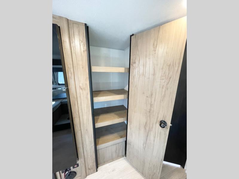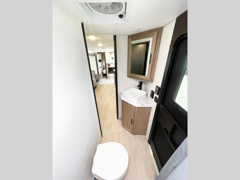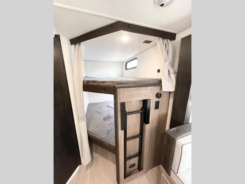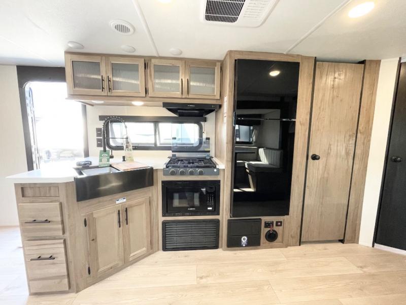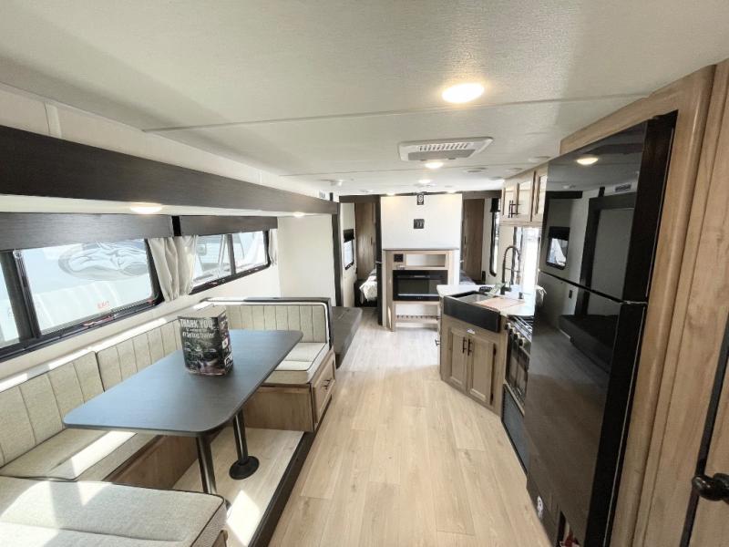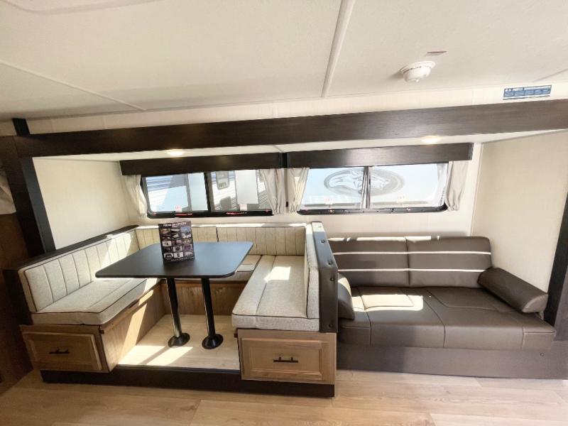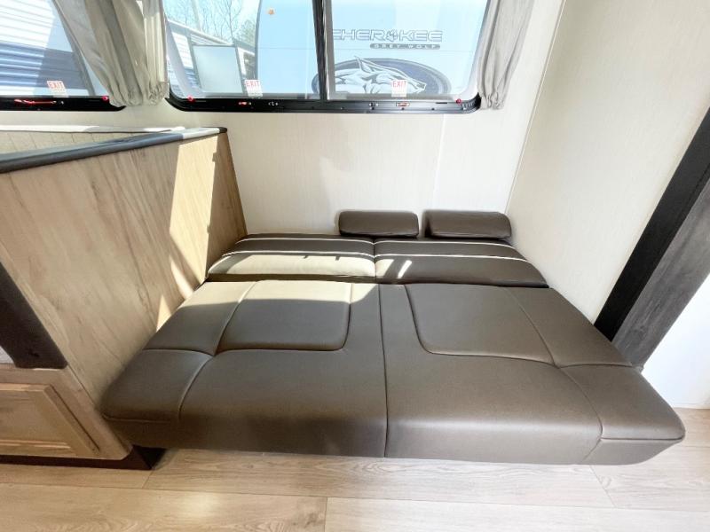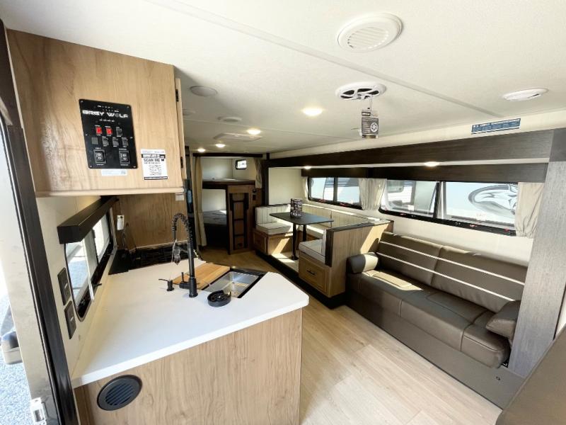Come on inside this Cherokee Grey Wolf Black Label travel trailer and experience the convenience of a smooth flow of traffic in and out with two entry doors. The rear door leads into a full bath which is great for accessibility when outside and when you need to use the bathroom. Once inside, you will notice the large U-shaped dinette and the sofa which sit on the slide and create a spacious footprint for moving about, as well as great places to play games and socialize with your friends and family. A large pantry provides plenty of storage allowing you to stock up on your favorite snacks and dry goods for your family adventure. At night, there is sleeping space for everyone between the double-size bunks and the RV king bed, plus the furniture.