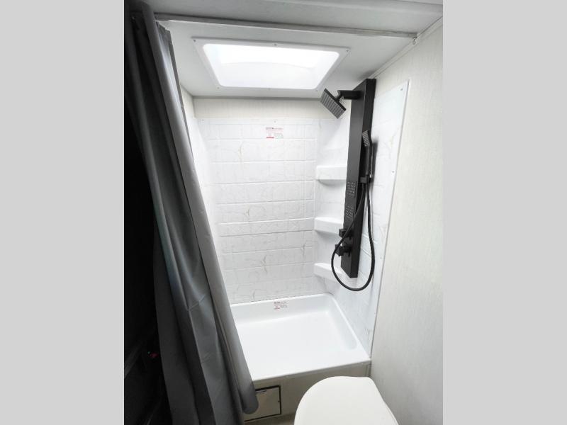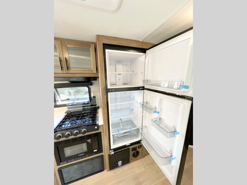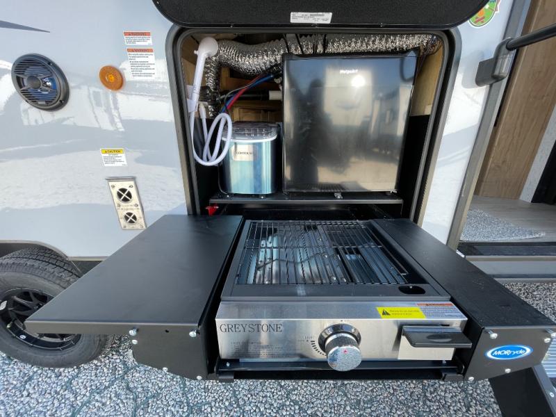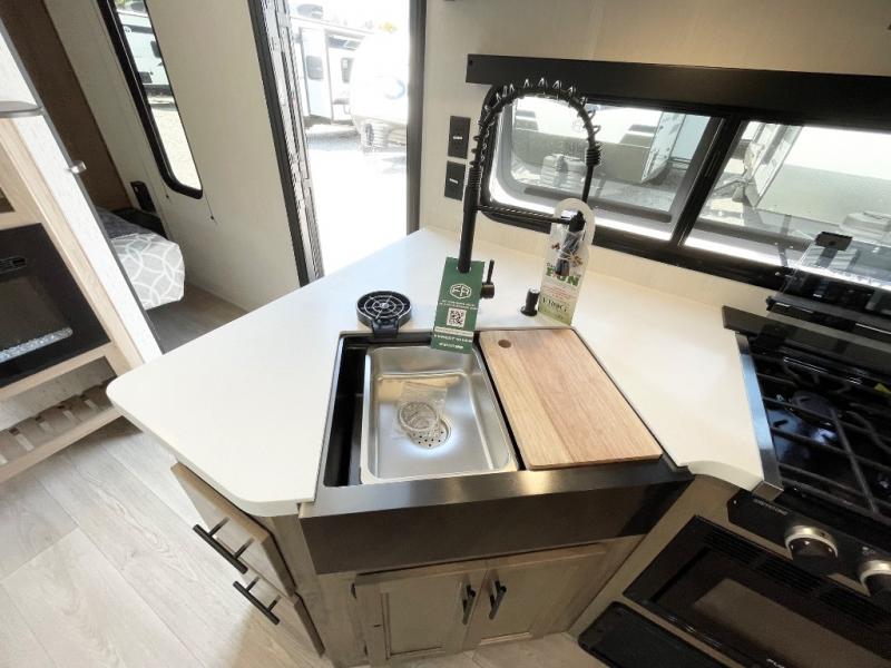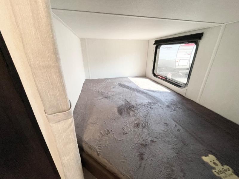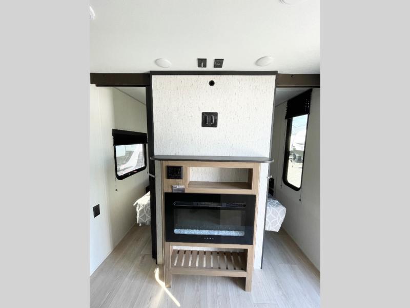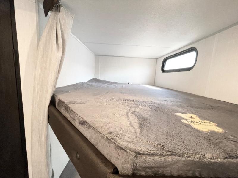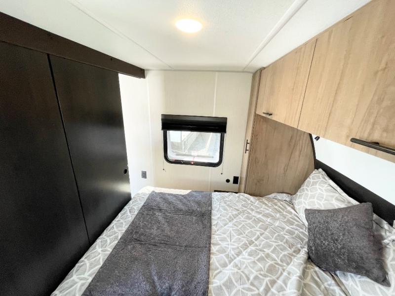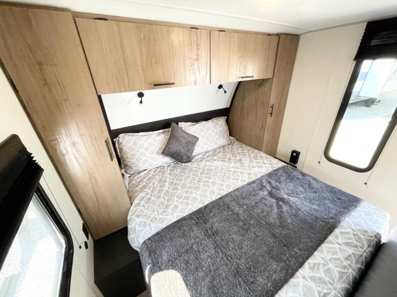 Come on inside this Cherokee Grey Wolf Black Label travel trailer and experience the convenience of a smooth flow of traffic in and out with two entry doors. The rear door leads into a full bath which is great for accessibility when outside and when you need to use the bathroom. Once inside, you will notice the large U-shaped dinette and the sofa which sit on the slide and create a spacious footprint for moving about, as well as great places to play games and socialize with your friends and family. A large pantry provides plenty of storage allowing you to stock up on your favorite snacks and dry goods for your family adventure. At night, there is sleeping space for everyone between the double-size bunks and the RV king bed, plus the furniture.