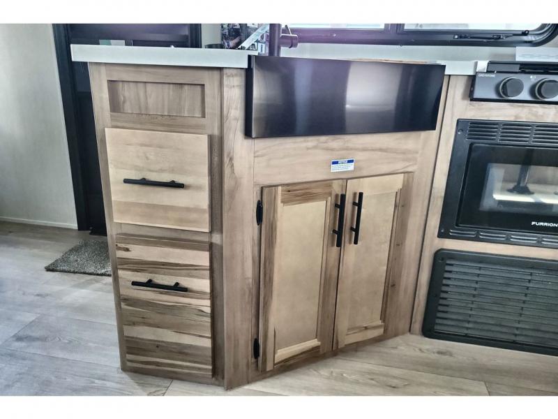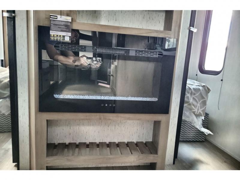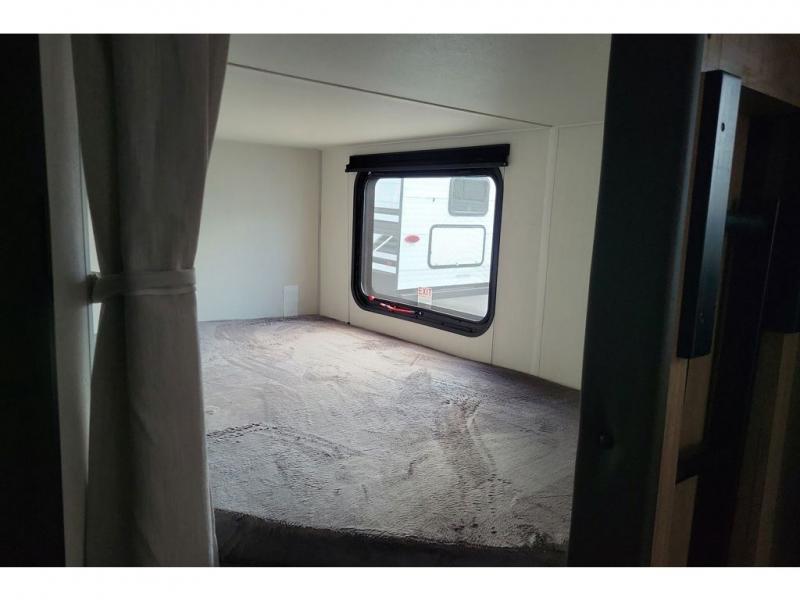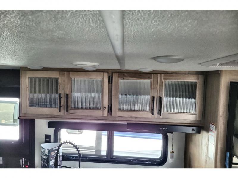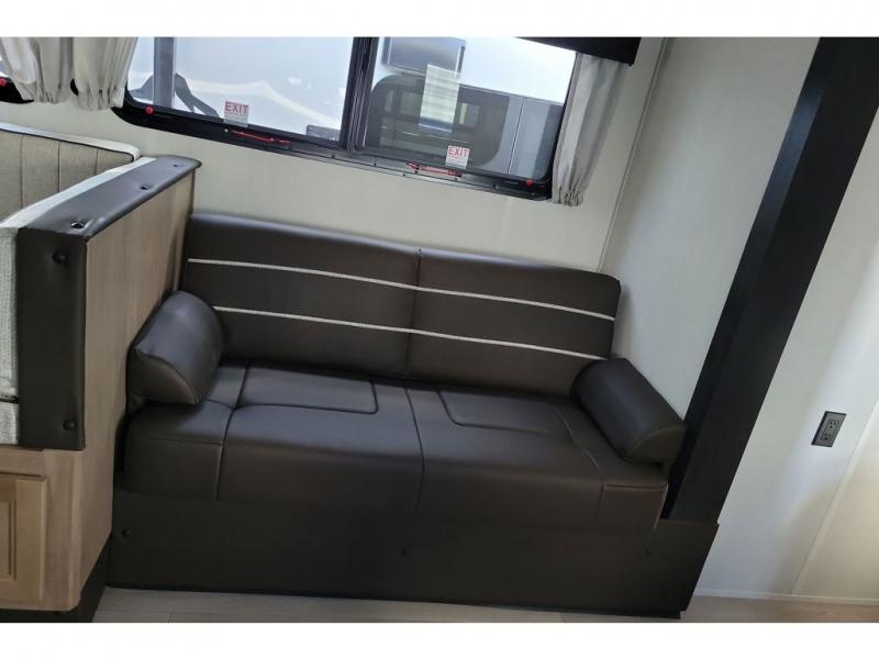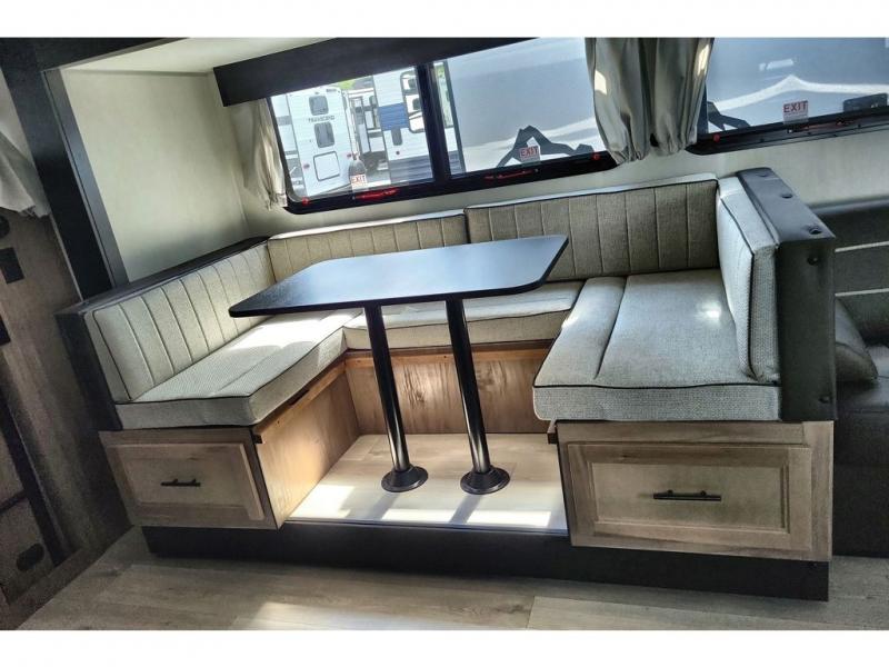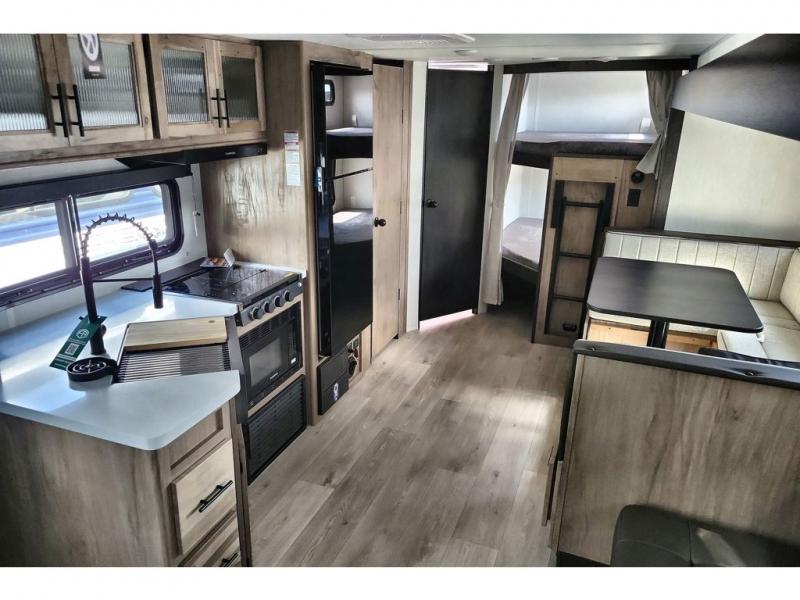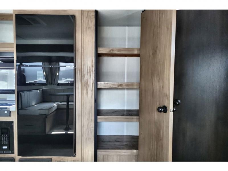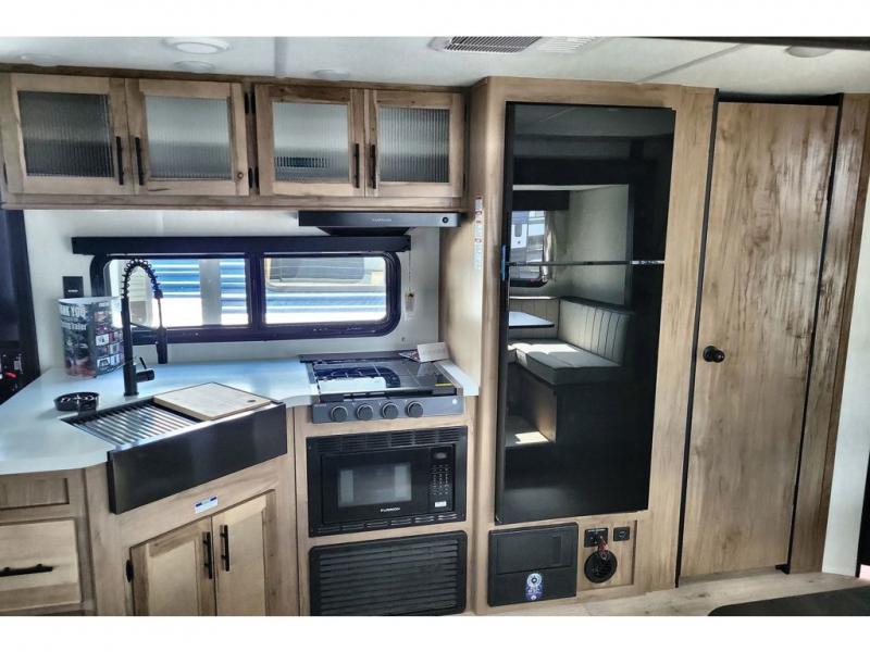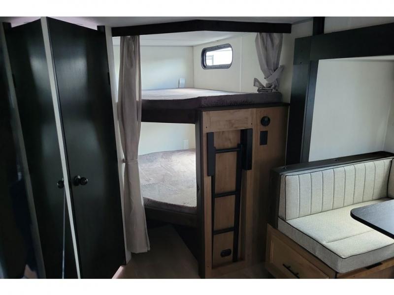 Come on inside this Cherokee Grey Wolf Black Label travel trailer and experience the convenience of a smooth flow of traffic in and out with two entry doors. The rear door leads into a full bath which is great for accessibility when outside and when you need to use the bathroom. Once inside, you will notice the large U-shaped dinette and the sofa which sit on the slide and create a spacious footprint for moving about, as well as great places to play games and socialize with your friends and family. A large pantry provides plenty of storage allowing you to stock up on your favorite snacks and dry goods for your family adventure. At night, there is sleeping space for everyone between the double-size bunks and the RV king bed, plus the furniture.