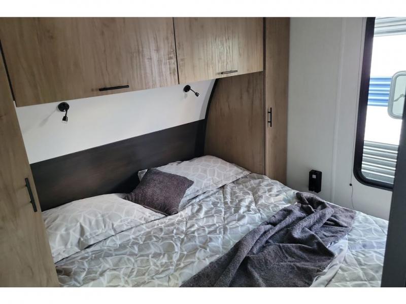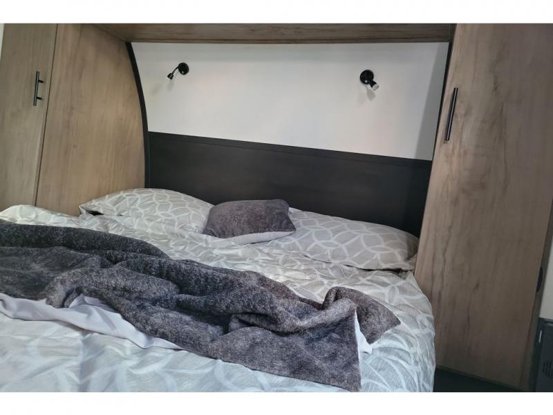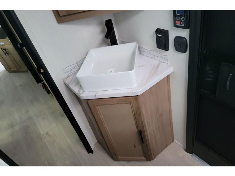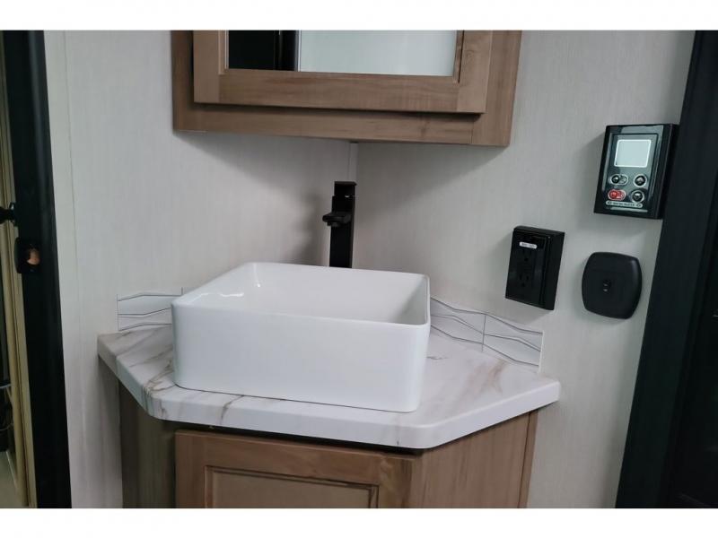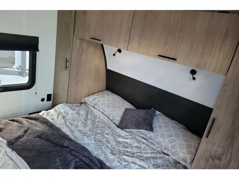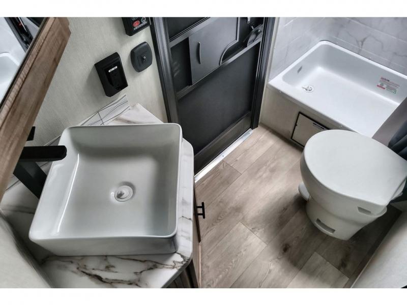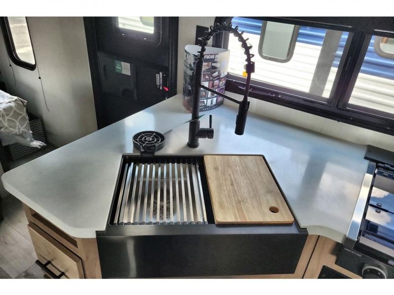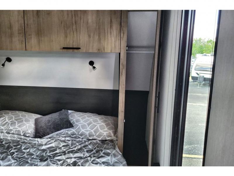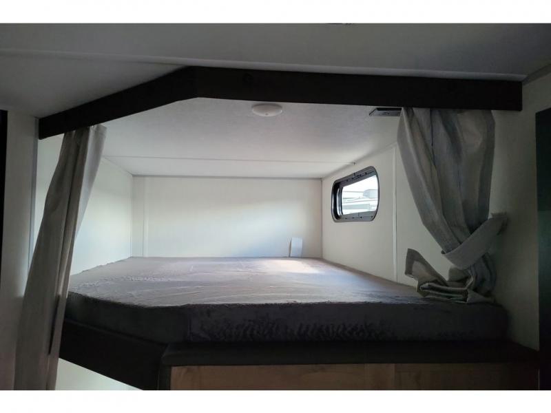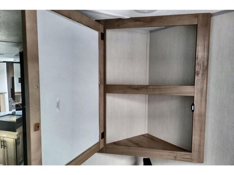 Come on inside this Cherokee Grey Wolf Black Label travel trailer and experience the convenience of a smooth flow of traffic in and out with two entry doors. The rear door leads into a full bath which is great for accessibility when outside and when you need to use the bathroom. Once inside, you will notice the large U-shaped dinette and the sofa which sit on the slide and create a spacious footprint for moving about, as well as great places to play games and socialize with your friends and family. A large pantry provides plenty of storage allowing you to stock up on your favorite snacks and dry goods for your family adventure. At night, there is sleeping space for everyone between the double-size bunks and the RV king bed, plus the furniture.