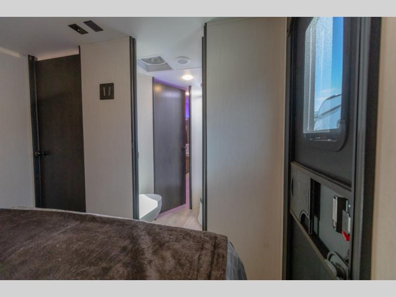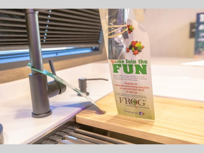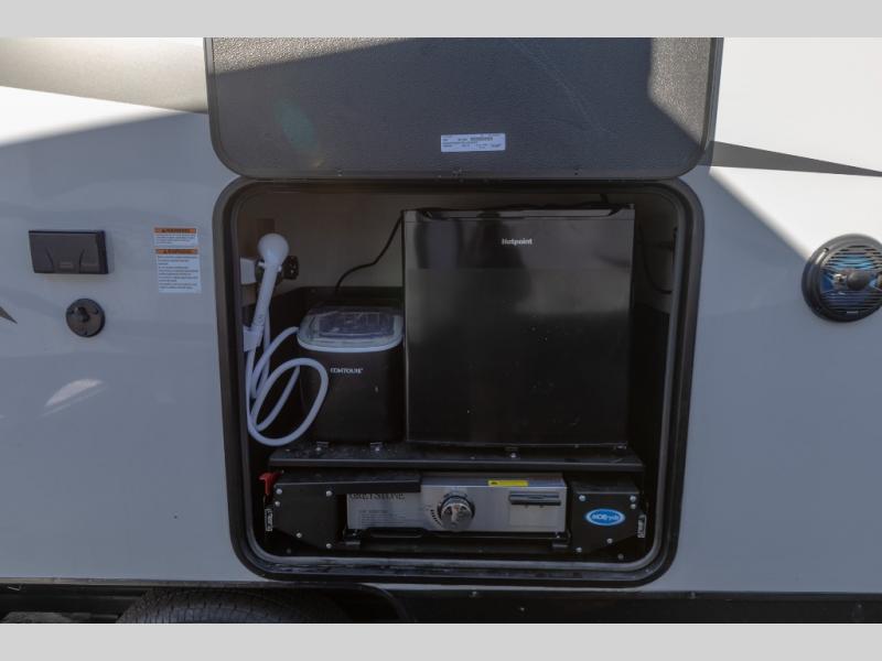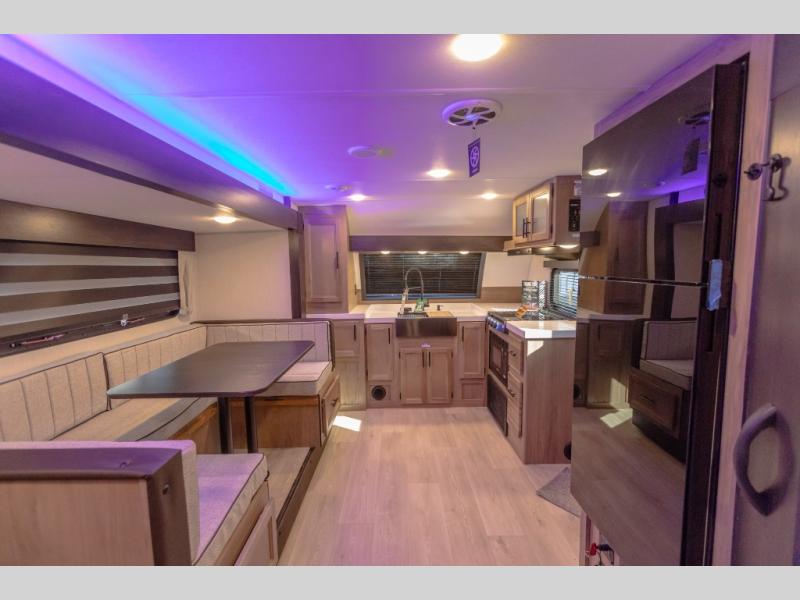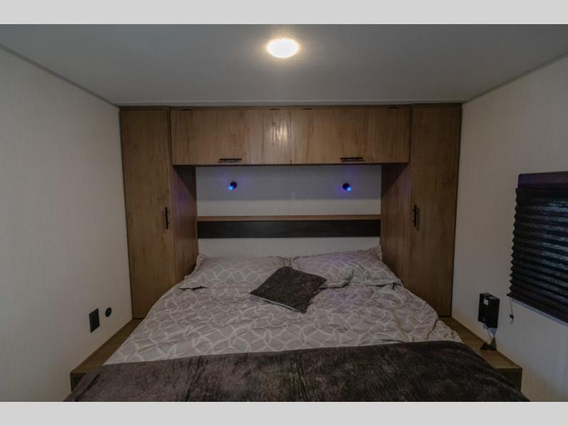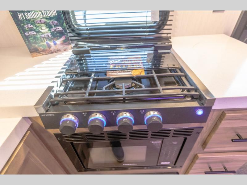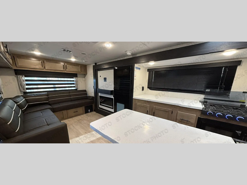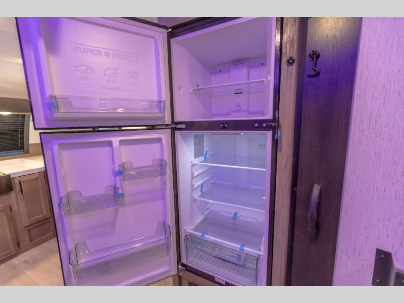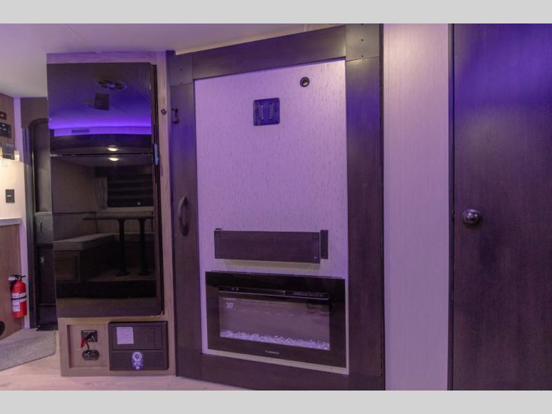 This travel trailer will feel just like home with its RV king bed in the front bedroom plus the full bath with a tub/shower, and there is a spacious living area thanks to the large slide out. Here, you'll find the air fryer and counter space, 12V refrigerator, and the fireplace with a hidden pantry behind it. Your crew can relax on the L-shaped sofa, or visit with the chef while they prep meals at the island peninsula. There are even two bar stools here for added convenience. Head outdoors to enjoy the power awning with LED lights in the evening!