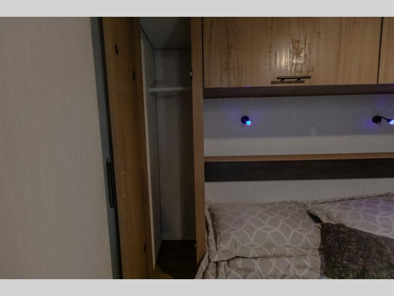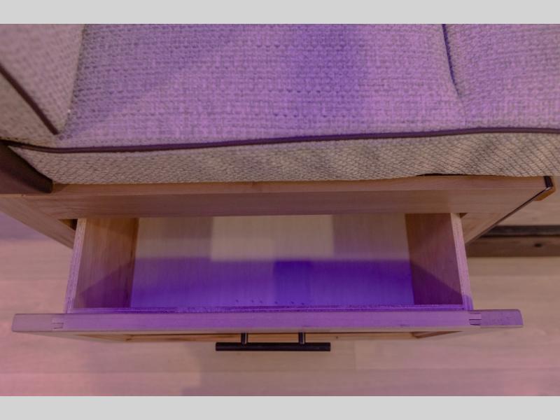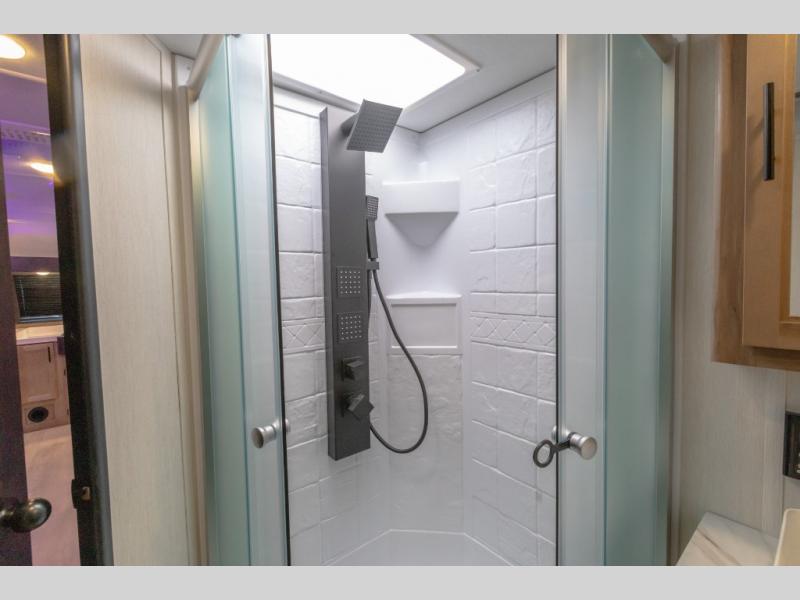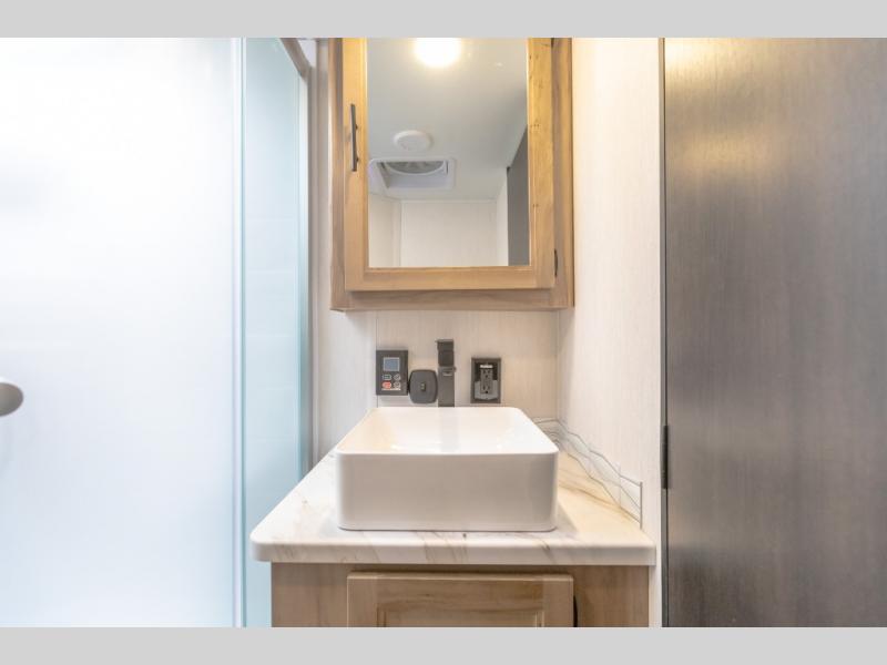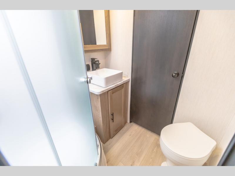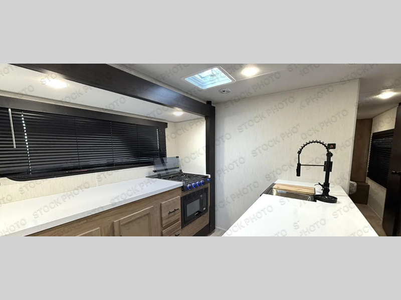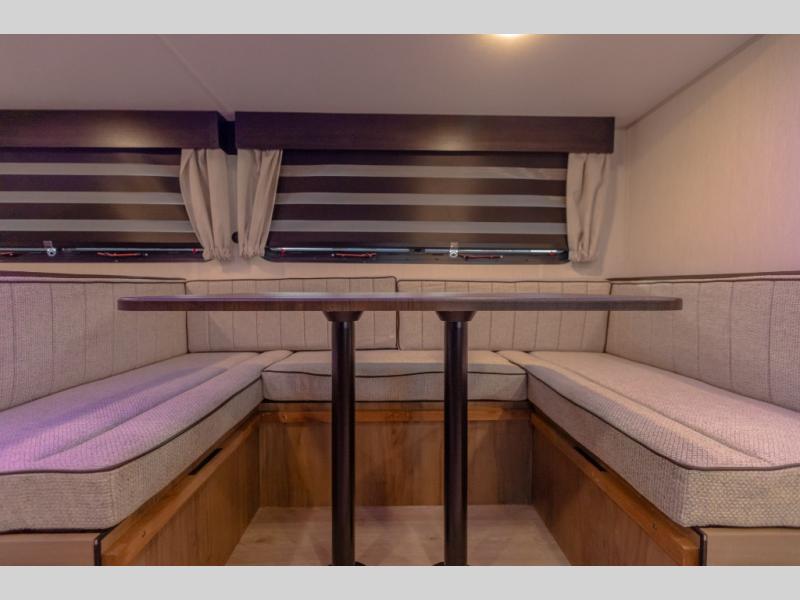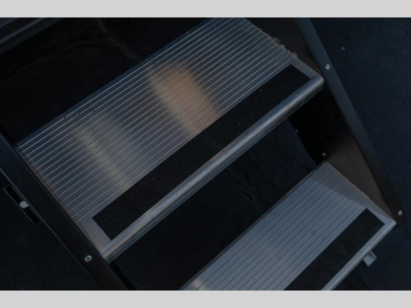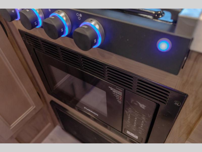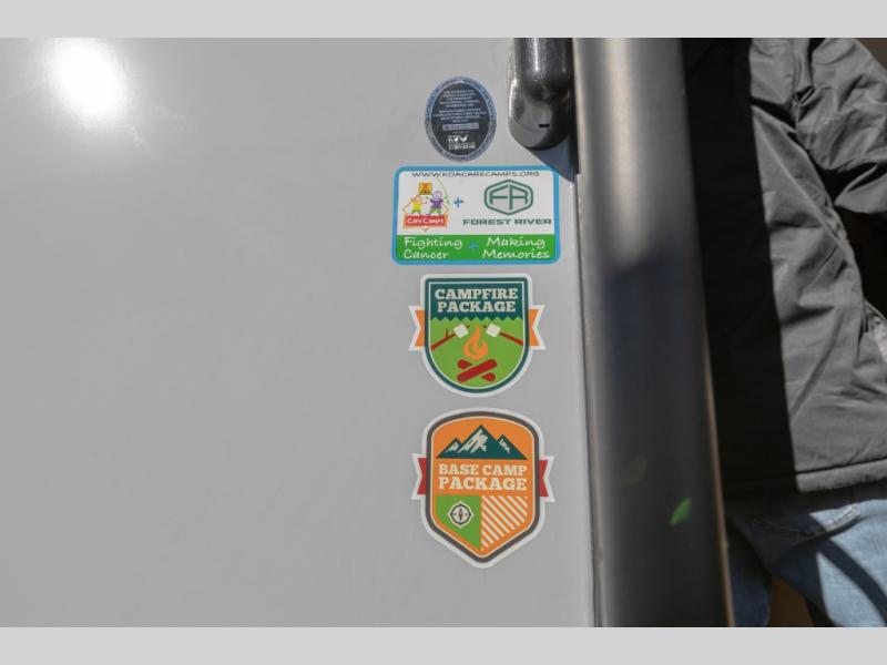 This travel trailer will feel just like home with its RV king bed in the front bedroom plus the full bath with a tub/shower, and there is a spacious living area thanks to the large slide out. Here, you'll find the air fryer and counter space, 12V refrigerator, and the fireplace with a hidden pantry behind it. Your crew can relax on the L-shaped sofa, or visit with the chef while they prep meals at the island peninsula. There are even two bar stools here for added convenience. Head outdoors to enjoy the power awning with LED lights in the evening!
