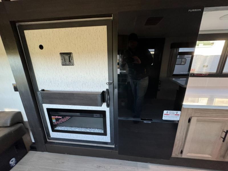 - Key Features: Front king bedroom; rear L-shaped sofa & fireplace; island peninsula with bar stools; 12V residential fridge; air-fryer microwave; Black Label upgrades—fiberglass exterior, frameless windows, arctic insulation, solid-surface counters, designer lighting & cushions