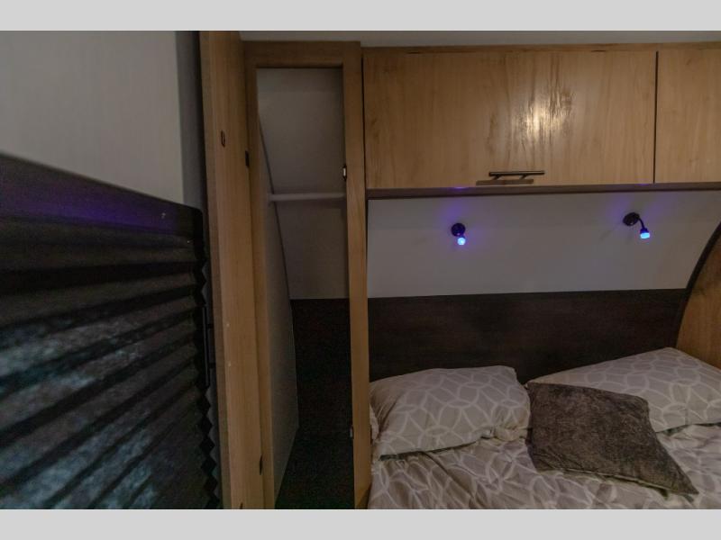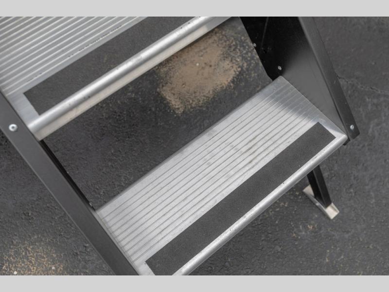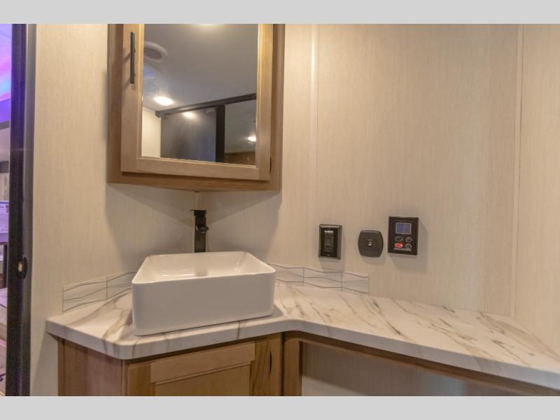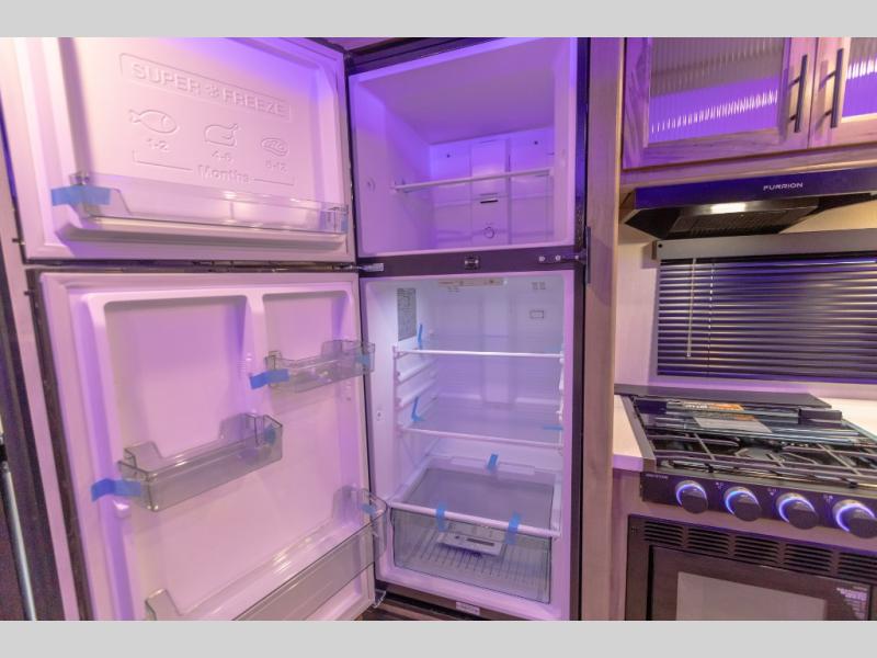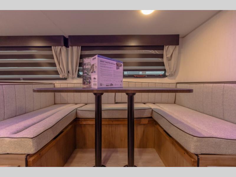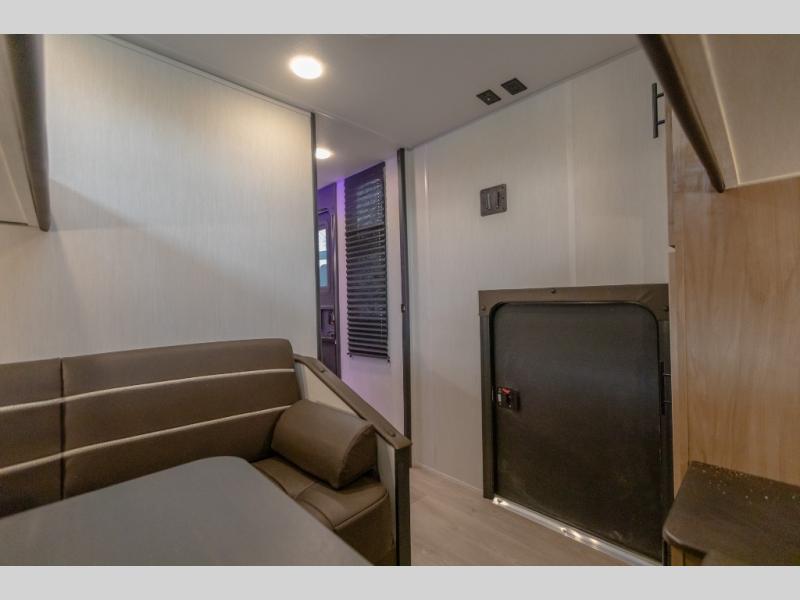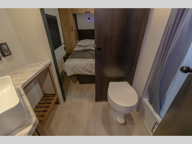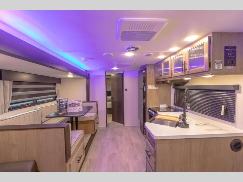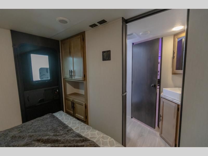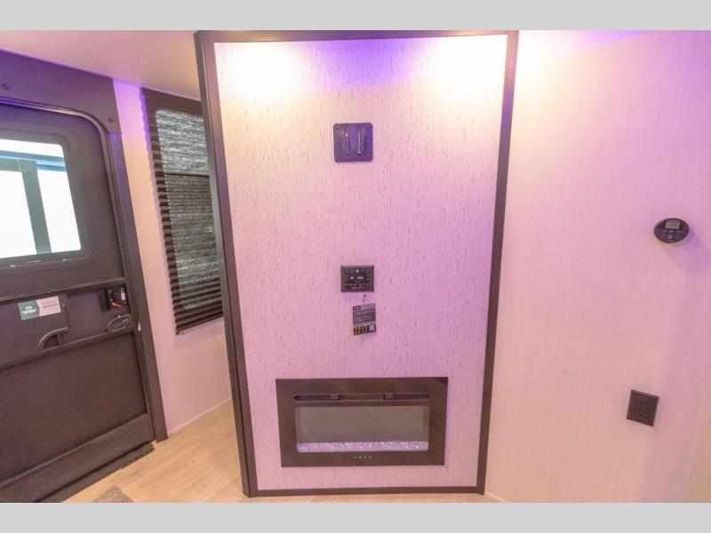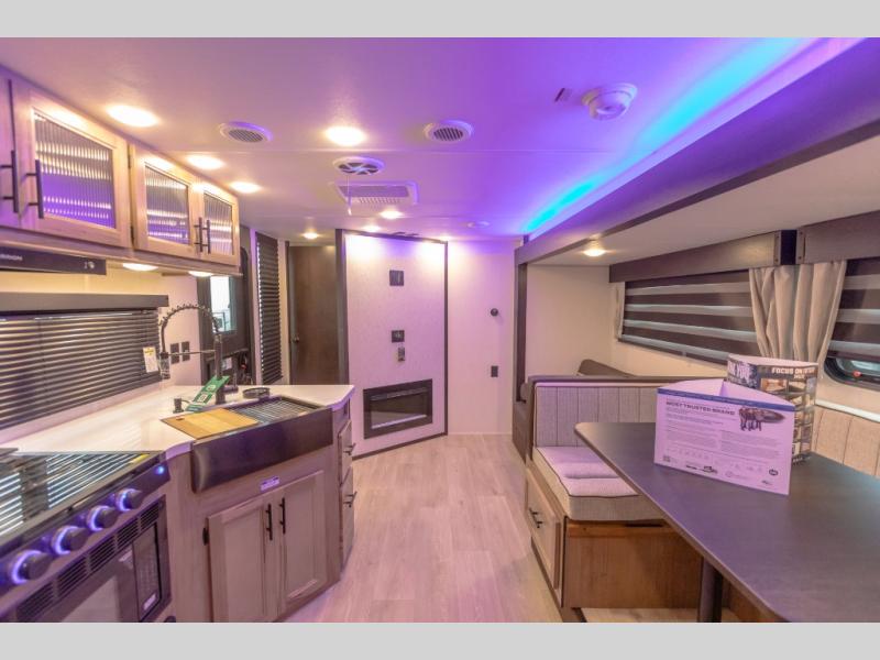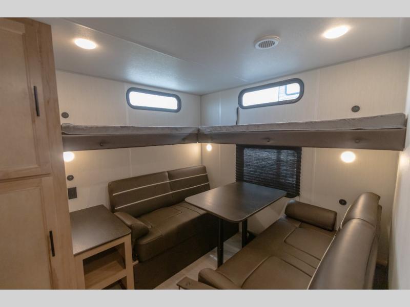 You will love how easy it is to enter/exit this travel trailer with dual entry doors! The rear door leads into the living/kitchen area where you will notice the large U-shaped dinette and the sofa which sit on the slide and create a spacious footprint for moving about, as well as great places to play games and socialize with your friends and family. Plus, there is an entertainment center with a fireplace and a fully equipped kitchen to keep everyone's bellies filled with delicious home cooked meals. At night, there is sleeping space for everyone between the bunks above the sofas with a table in the rear private bunkhouse and the RV king bed in the front private bedroom, plus the furniture can convert into sleeping spaces. The walk-through bathroom leads directly into the bedroom too!