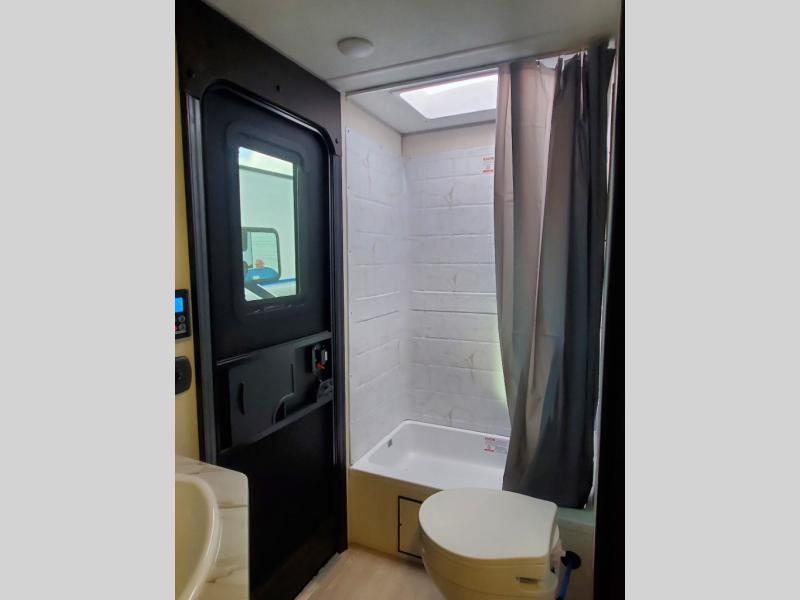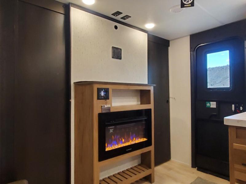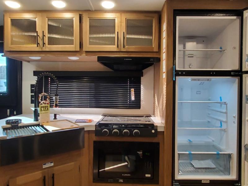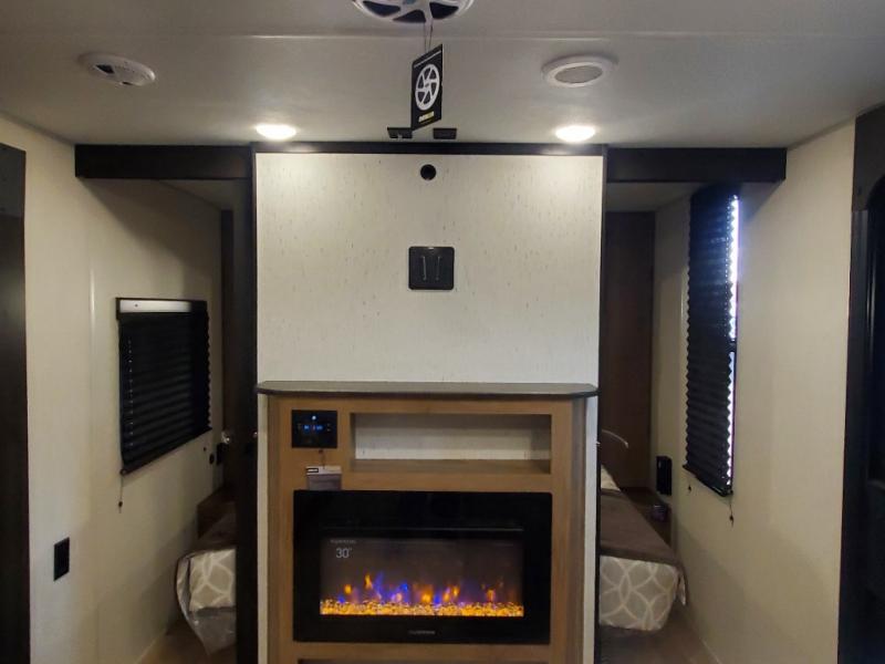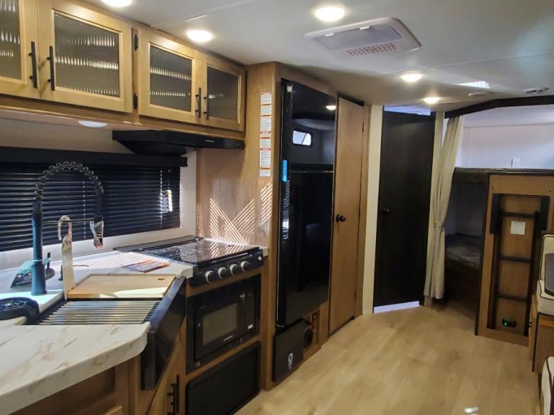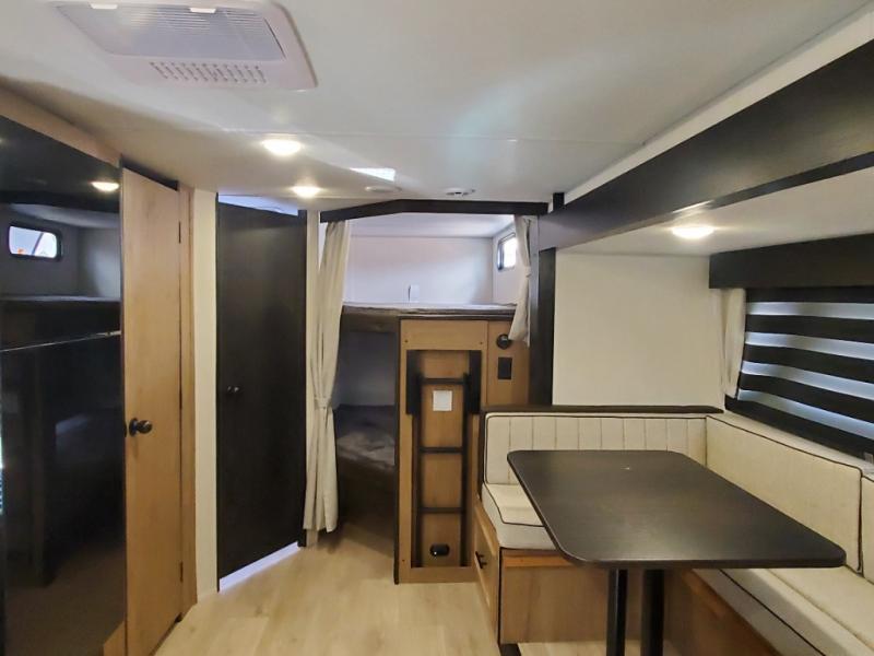 Come on inside this Cherokee Grey Wolf travel trailer and experience the convenience of a smooth flow of traffic in and out with two entry doors. The rear door leads into a full bath which is great for accessibility. Once inside, you will notice the large U-shaped dinette and the sofa which sit on the slide and create a spacious footprint for moving about, as well as great places to play games and socialize with your friends and family. A walk-in pantry provides plenty of storage allowing you to stock up on your favorite snacks and dry goods for your family adventure. At night, there is sleeping space for everyone between the double-size bunks and the RV king bed, plus the furniture.
