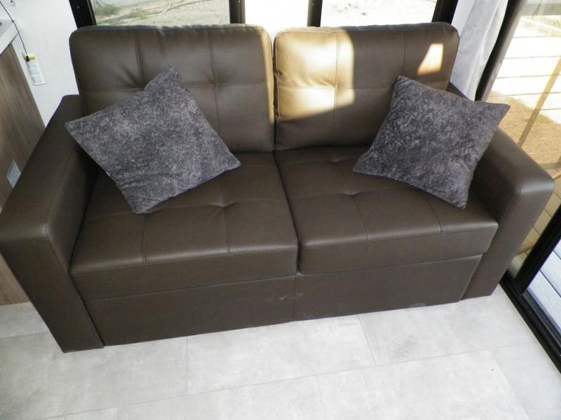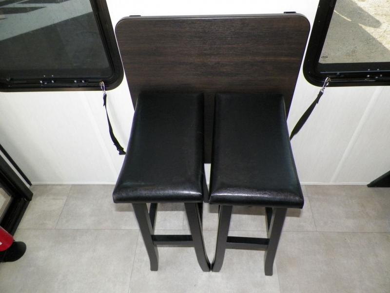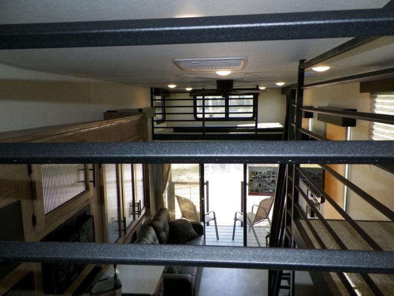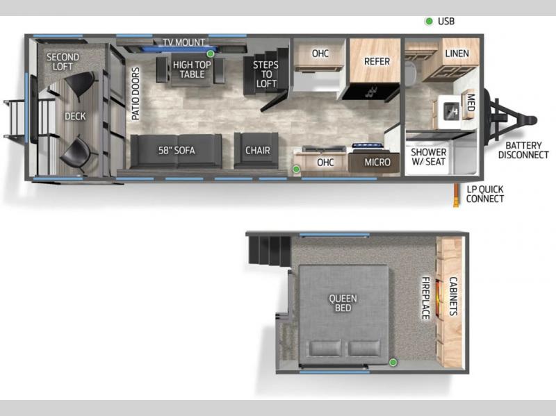 You will fall in love with this mini-loft destination trailer that will feel more like a tiny home. There are steps leading up to the loft with a queen bed, cabinets, and even a fireplace! The kitchen includes a cooktop and a microwave oven to prepare meals, plus a refrigerator to keep perishables fresh. You'll enjoy relaxing on the hide-a-bed sofa, dining at the high top table, or reading a book on the lounge chair. There is also a rear deck with patio doors where you can spend your evenings together, and there is even a second loft above the deck for added sleeping or storage space!