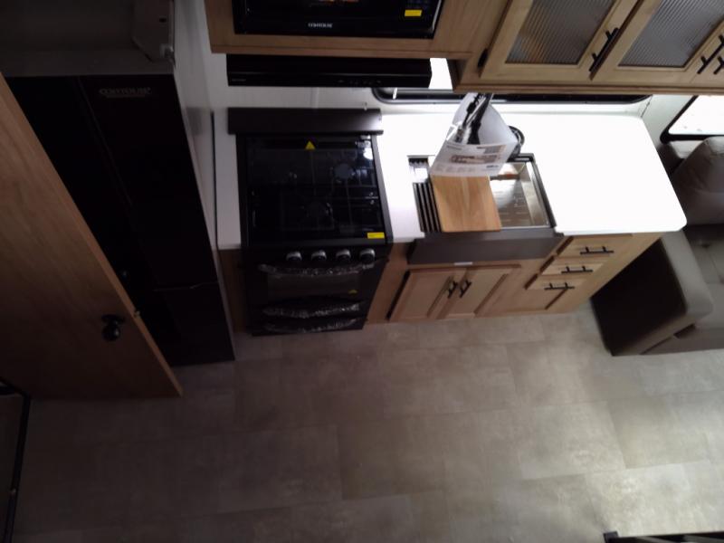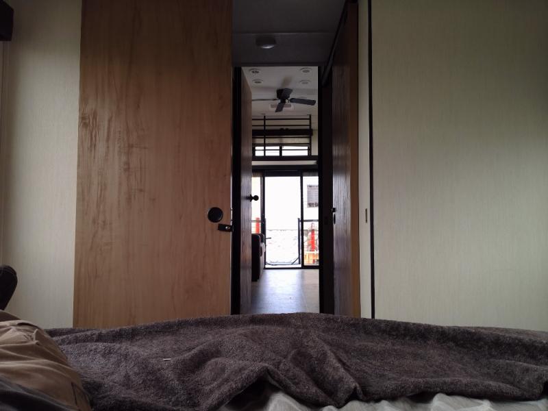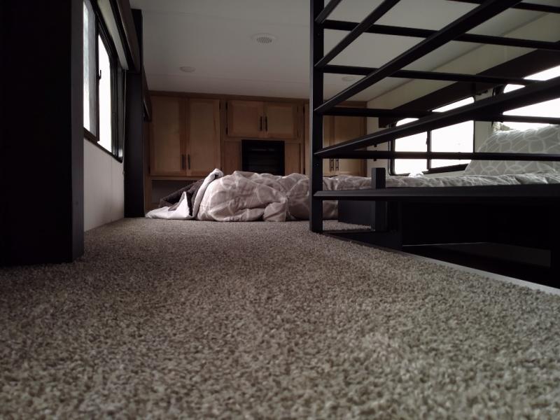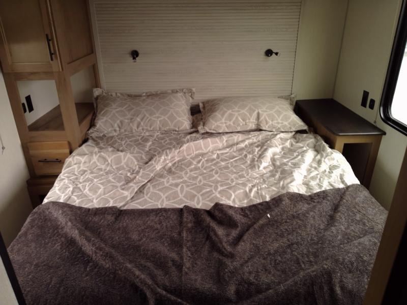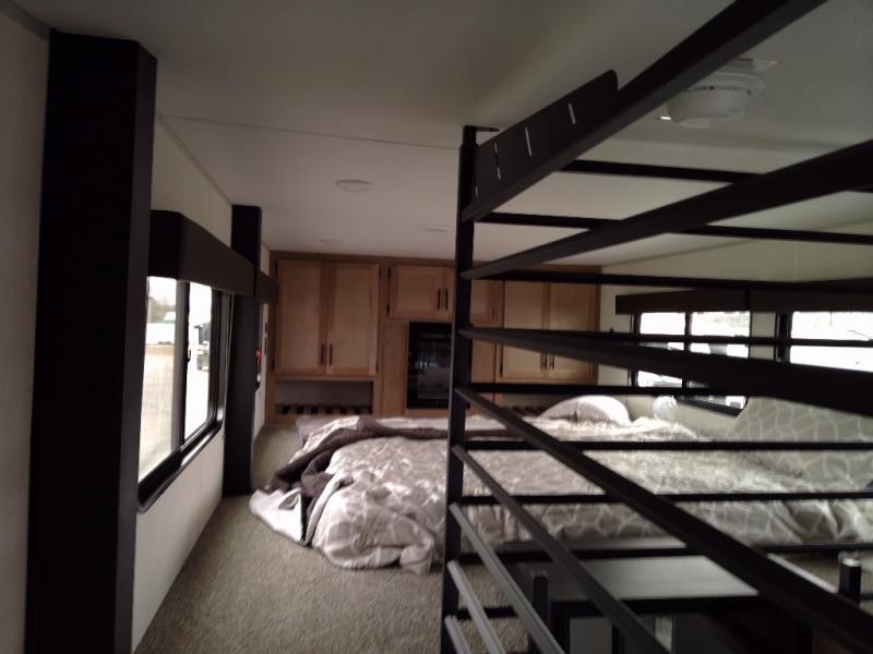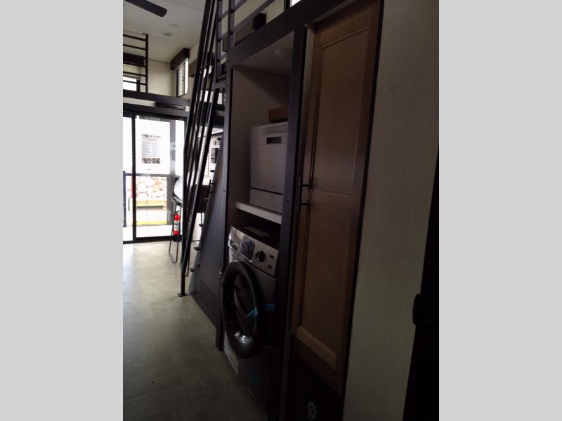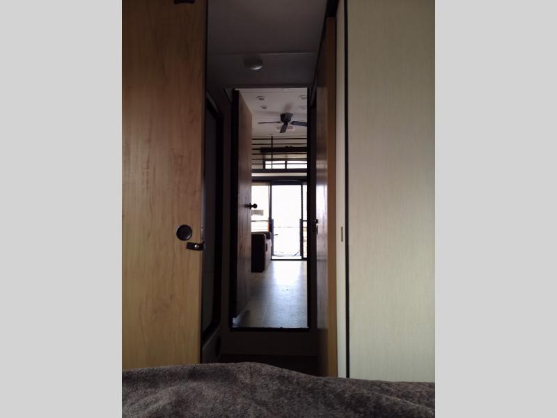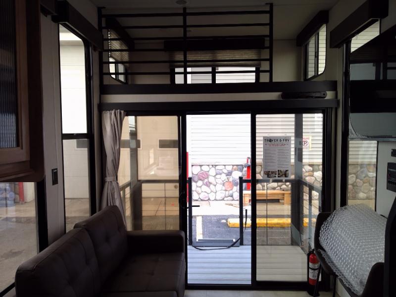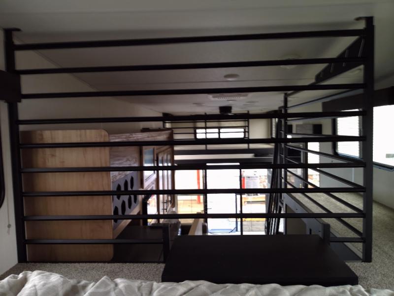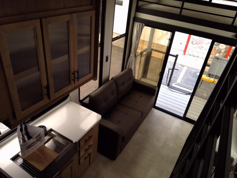 This model is similar to 16ML but larger! A bigger bathroom, king bed in the lower master, and a queen bed plus a twin bunk mat in the front loft. There is an 18 cu. ft. refrigerator so you can stock up for a week long vacation, a hide-a-bed sofa that can transform into added sleeping for guests, and a high top table with two stools to dine at. A ladder allows access into the upper front loft that is over the covered patio. The bathroom below is split with a shower on one side, and a private toilet area and sink opposite. And the view is amazing from just about anywhere inside.