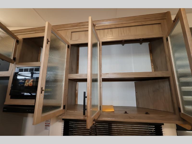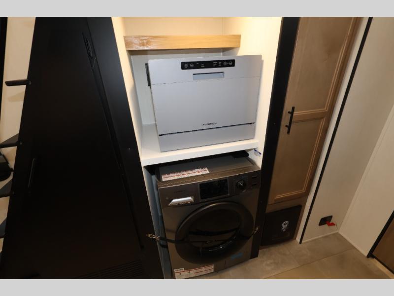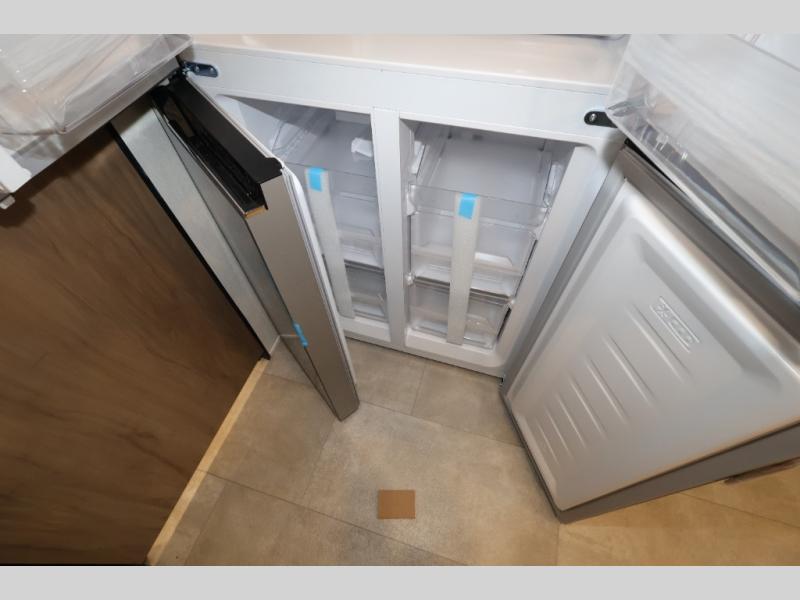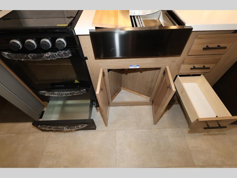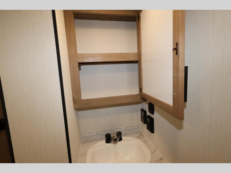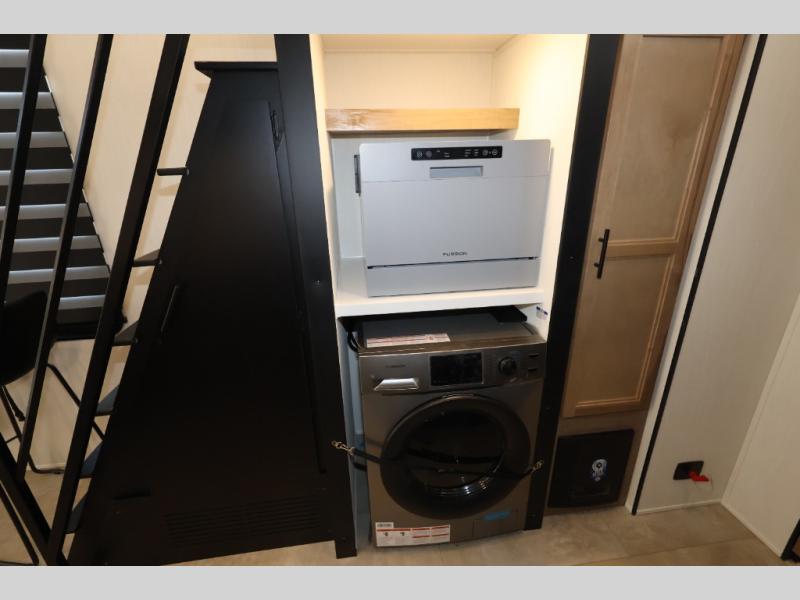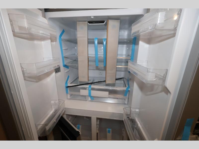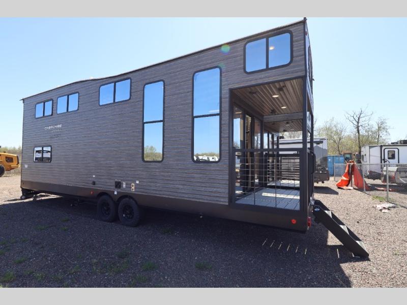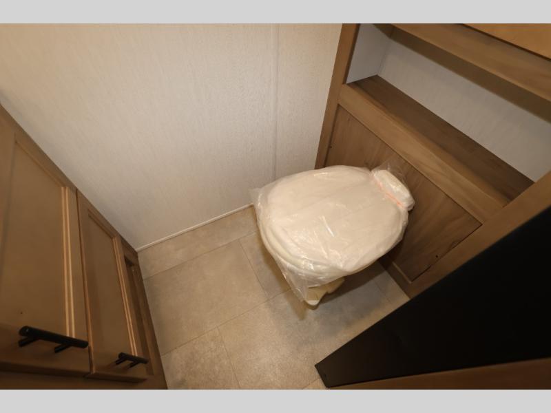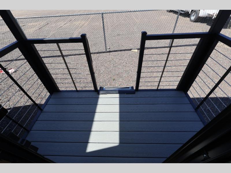 This model is similar to 16ML but larger! A bigger bathroom, king bed in the lower master, and a queen bed plus a twin bunk mat in the front loft. There is an 18 cu. ft. refrigerator so you can stock up for a week long vacation, a hide-a-bed sofa that can transform into added sleeping for guests, and a high top table with two stools to dine at. A ladder allows access into the upper front loft that is over the covered patio. The bathroom below is split with a shower on one side, and a private toilet area and sink opposite. And the view is amazing from just about anywhere inside.