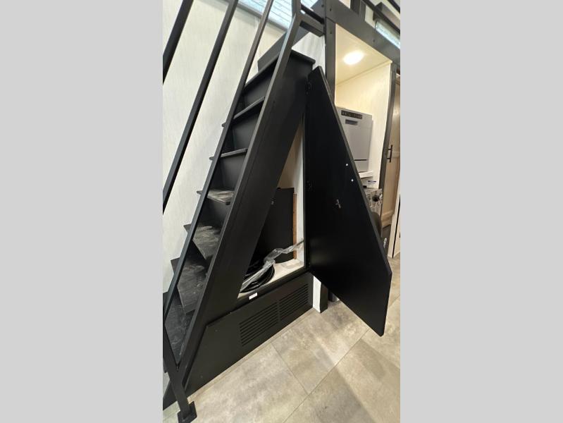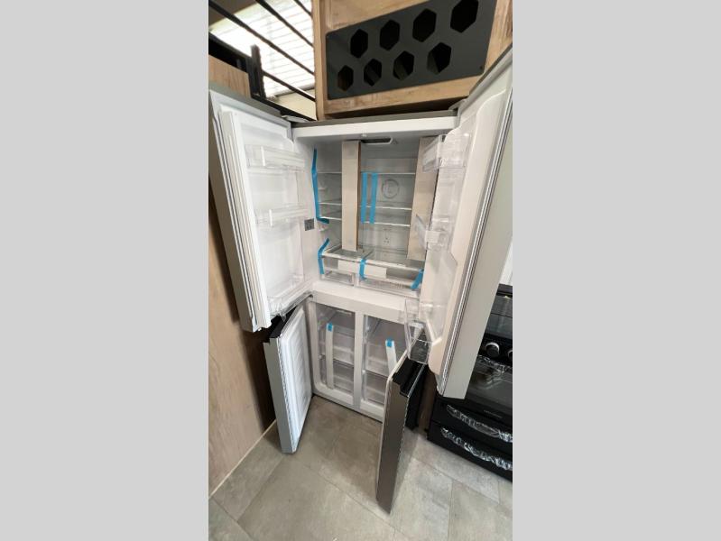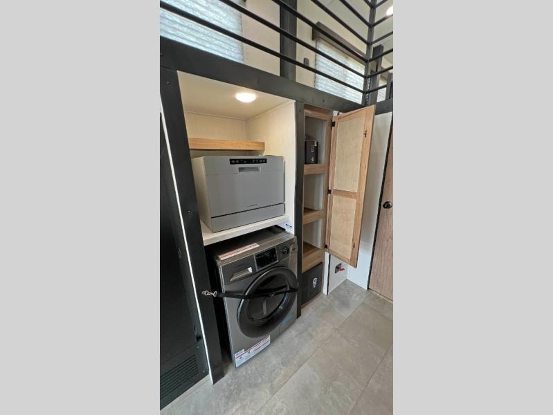 This model is similar to 16ML but larger! A bigger bathroom, king bed in the lower master, and a queen bed plus a twin bunk mat in the front loft. There is an 18 cu. ft. refrigerator so you can stock up for a week long vacation, a hide-a-bed sofa that can transform into added sleeping for guests, and a high top table with two stools to dine at. A ladder allows access into the upper front loft that is over the covered patio. The bathroom below is split with a shower on one side, and a private toilet area and sink opposite. And the view is amazing from just about anywhere inside.