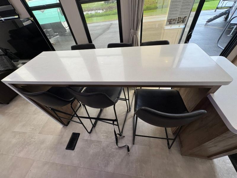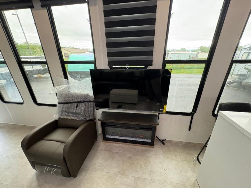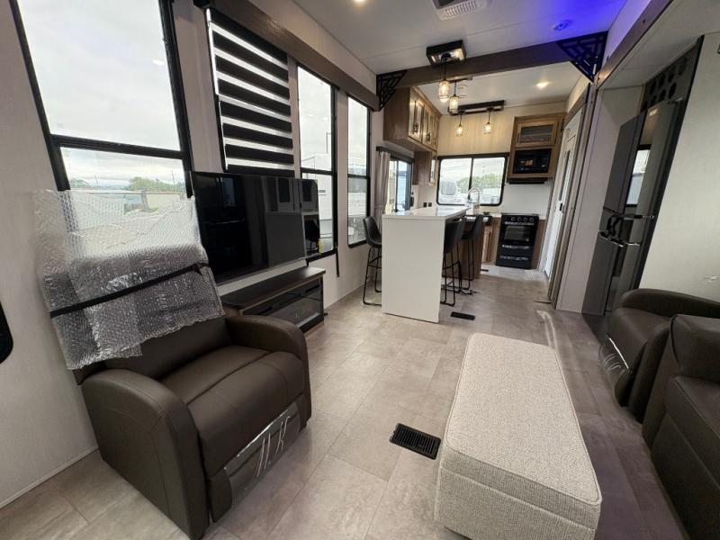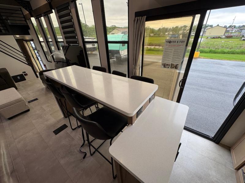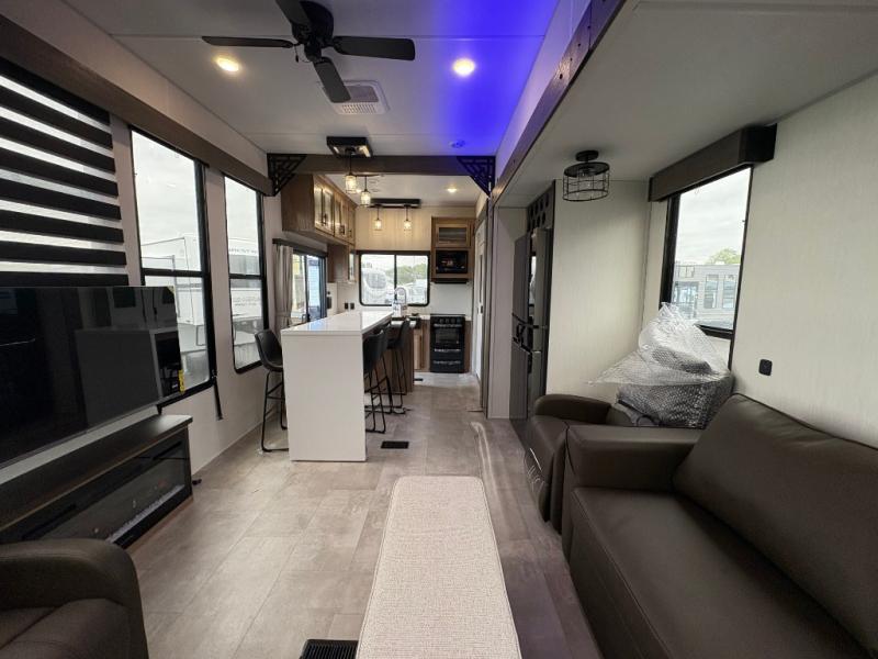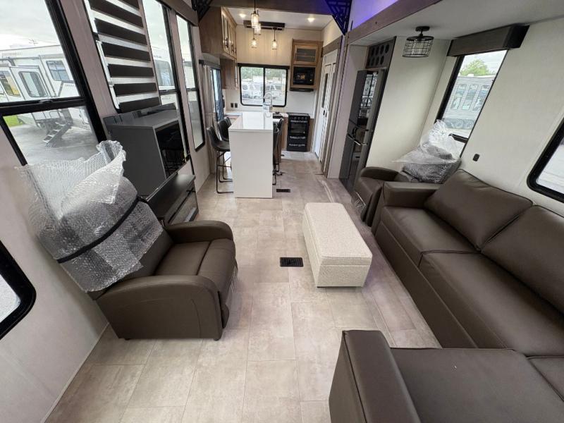 Time spent in this destination trailer will be time well spent! You will appreciate dual entry doors for maximum convenience, plus a spacious full bath that is close by the front private bedroom! Your crew can relax in the middle living area on the L-shaped sofa, and there are two lounge chairs for even more seating spaces. The rear kitchen will be any chef's dream with its island with six stools and all the appliances to create meals each day. This model also features triple slides so you can enjoy more space to relax!