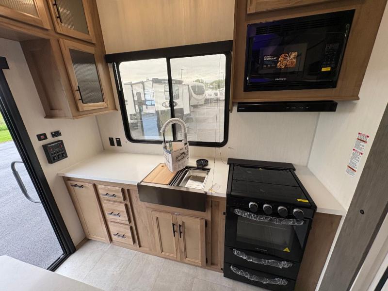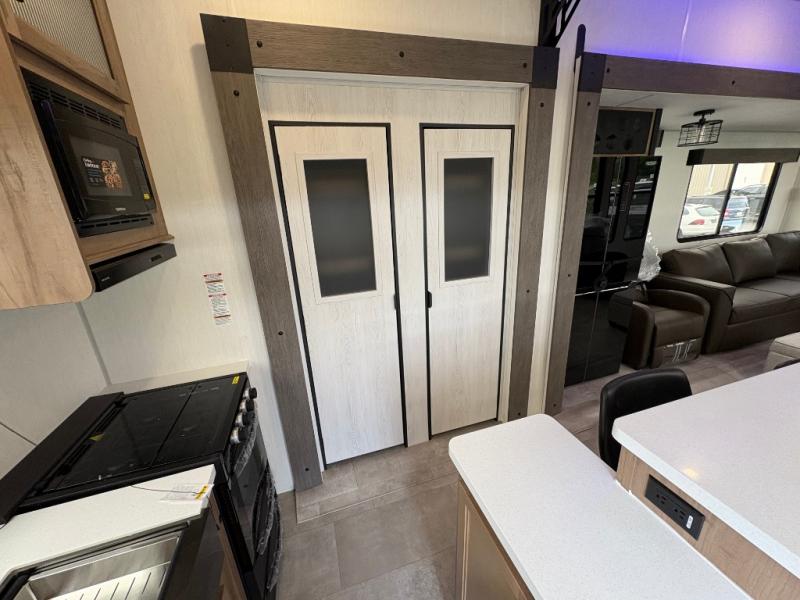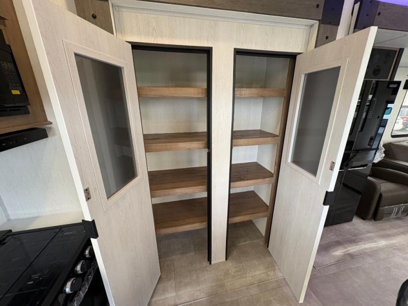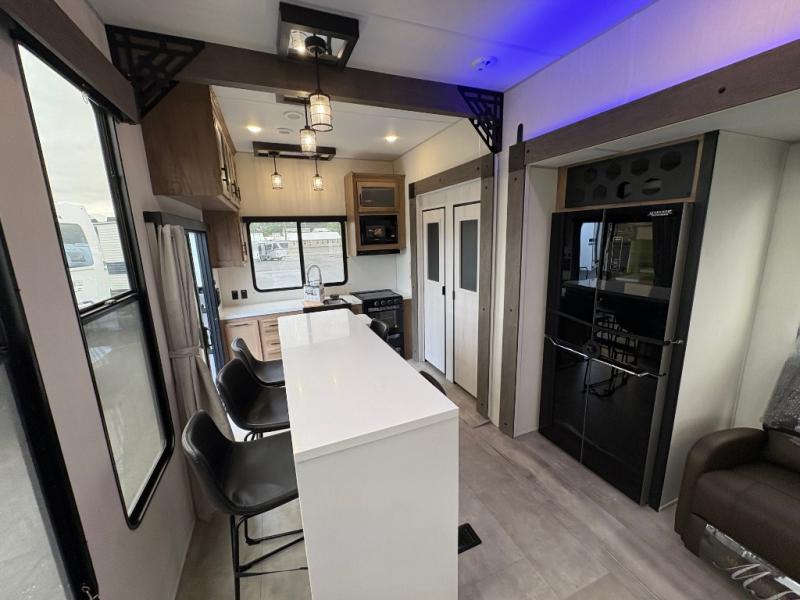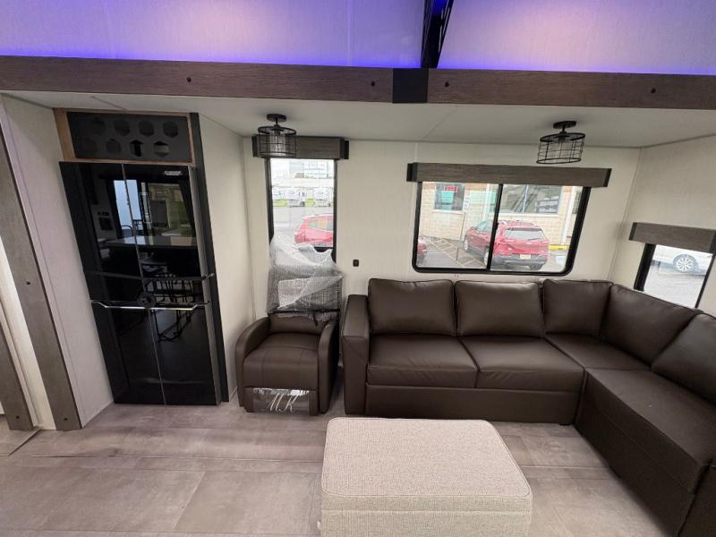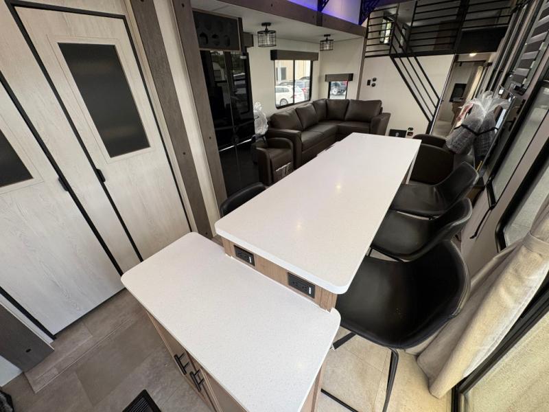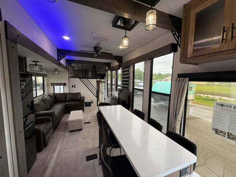 Time spent in this destination trailer will be time well spent! You will appreciate dual entry doors for maximum convenience, plus a spacious full bath that is close by the front private bedroom! Your crew can relax in the middle living area on the L-shaped sofa, and there are two lounge chairs for even more seating spaces. The rear kitchen will be any chef's dream with its island with six stools and all the appliances to create meals each day. This model also features triple slides so you can enjoy more space to relax!