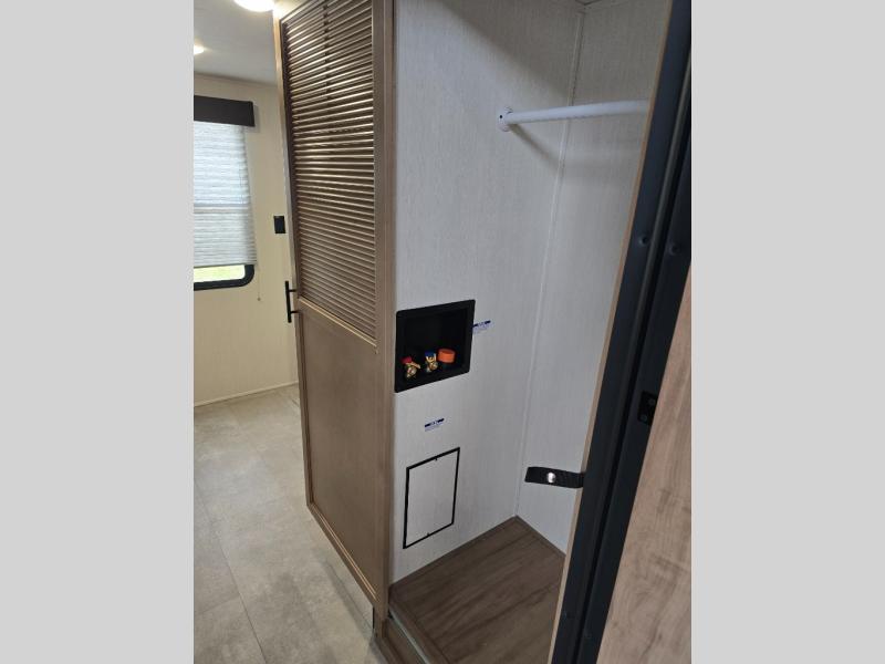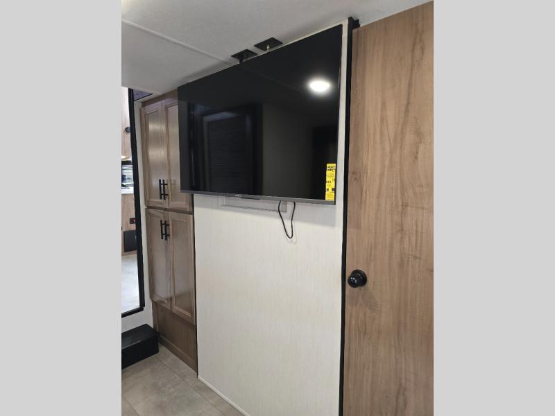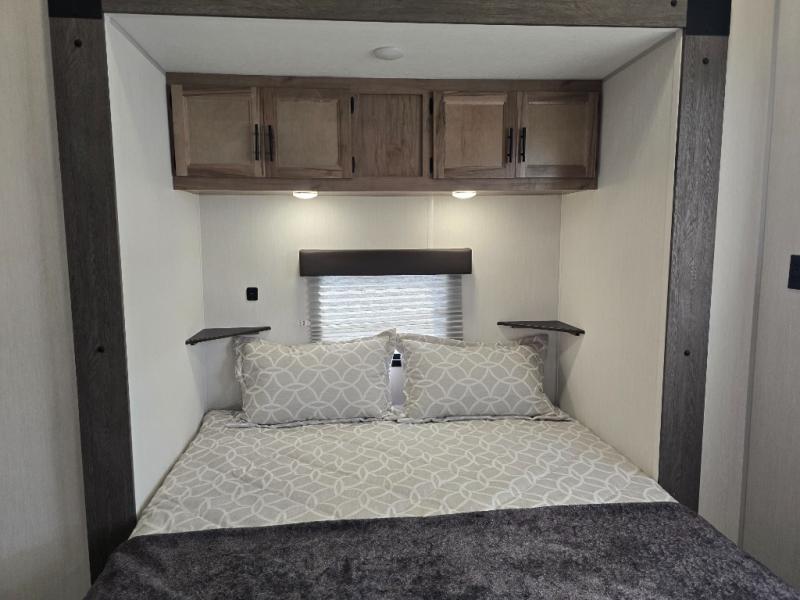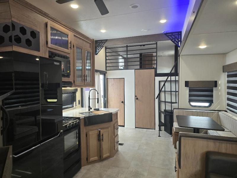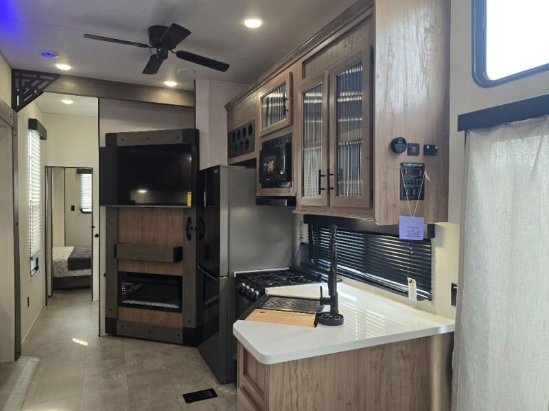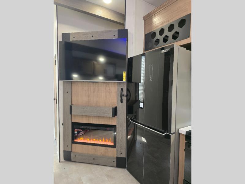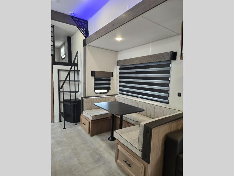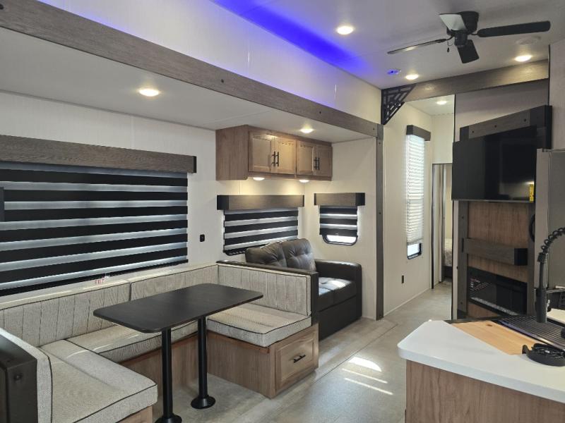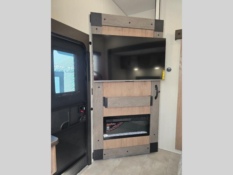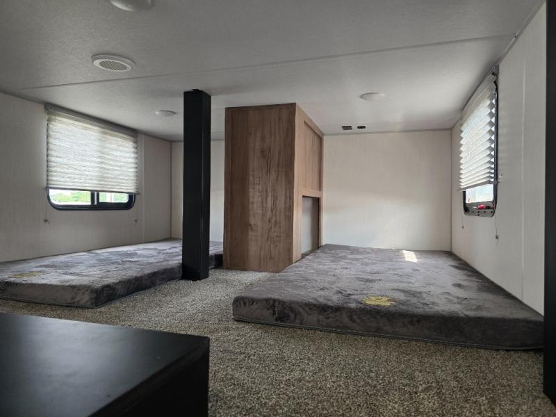 Ten can easily sleep in this destination travel trailer featuring a bunkhouse, large slide in the living area which creates a wide open space for a U-shaped dinette and sofa where you can enjoy the entertainment center with a fireplace. The kitchen is fully equipped with everything needed to create meals and snacks for your whole crew, and the walk-in pantry is great for storing all of your non-perishables. This space also features optional washer/dryer prep. In the very back, the bunkhouse features comfortable sleeping with double bunks on one side and double bunks with a hinged platform along the opposite side that the kids are sure to love. Up front, a side aisle bath featuring a shower with a seat, a vanity with medicine cabinet, and a toilet. You will also love the outside TV mount and 18' power awning space to create a nice size outdoor living area to enjoy on sunny days or pleasant evenings.