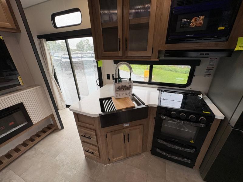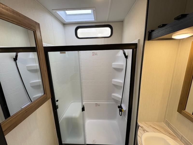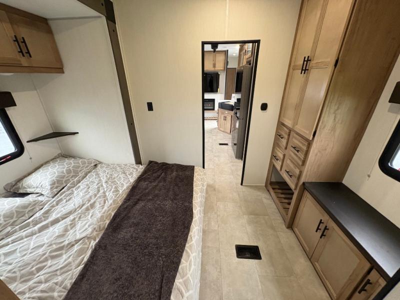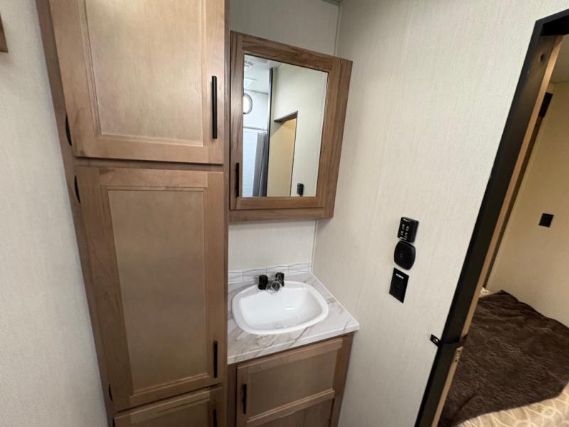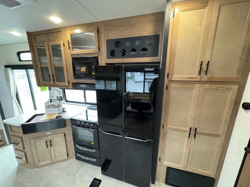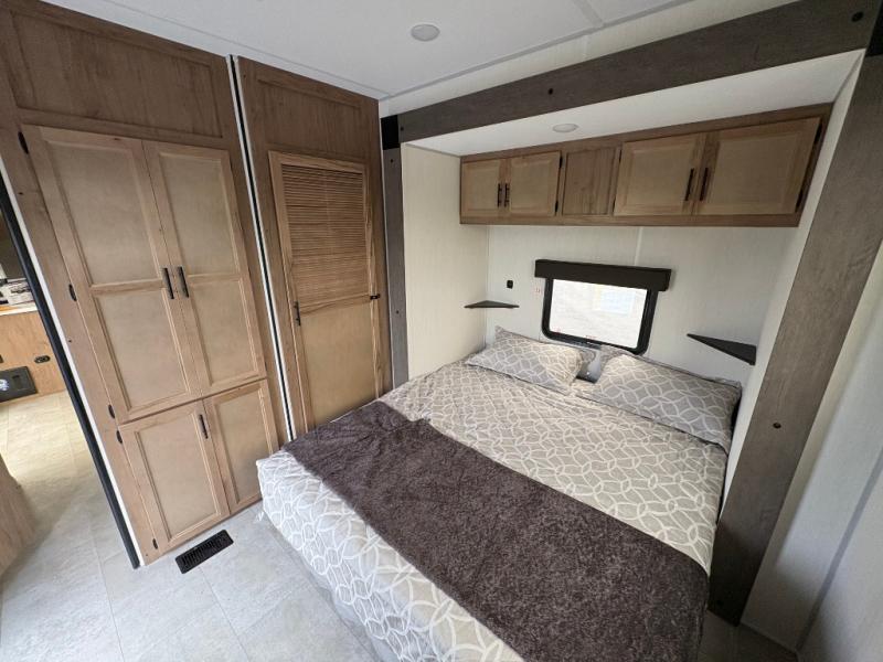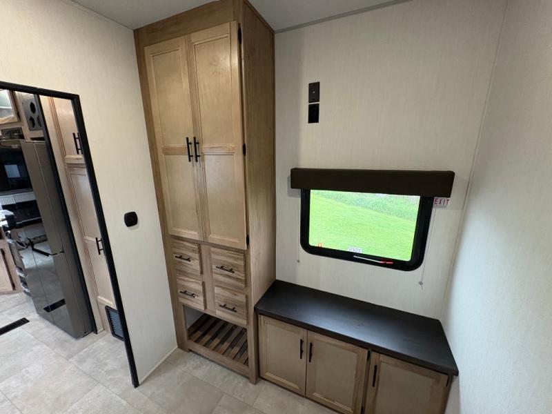 Spacious and comfortable is how you will describe this destination travel trailer featuring triple slides, two full baths, and a spacious combined kitchen and living area thanks to the large slide here featuring a free standing dinette and sofa. The kitchen includes everything you need to comfortably cook while you are away, and allows you to make meals for your family just like at home. There is a large pantry where you can keep plenty of snacks and dry goods for your trip. In the rear of the coach, there is a private bedroom featuring a queen bed slide for added space, comfortable sleeping, as well as ample storage between a dresser and wardrobe for your clothing. In the very back, a master suite bath featuring a vanity with sink, a shower with a seat, and linen storage for your towels and toiletries. This front bedroom also features a king bed slide!