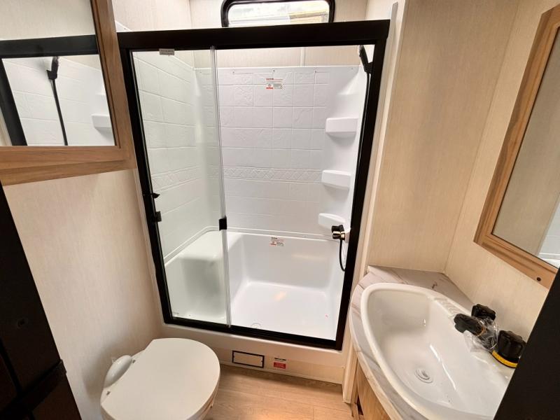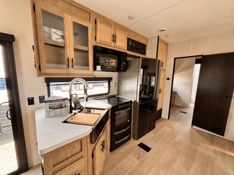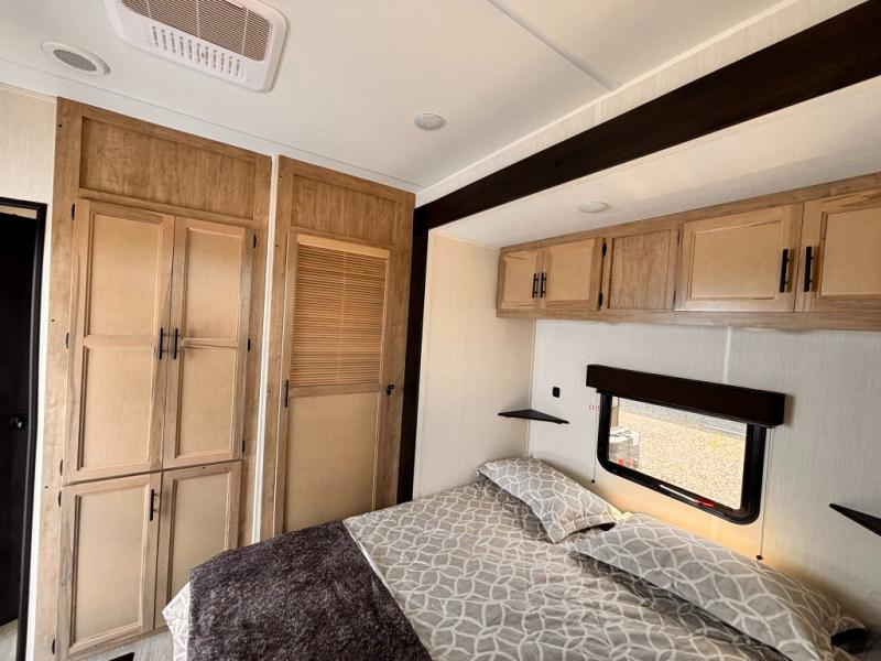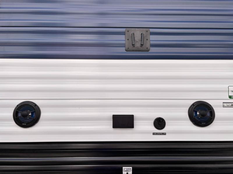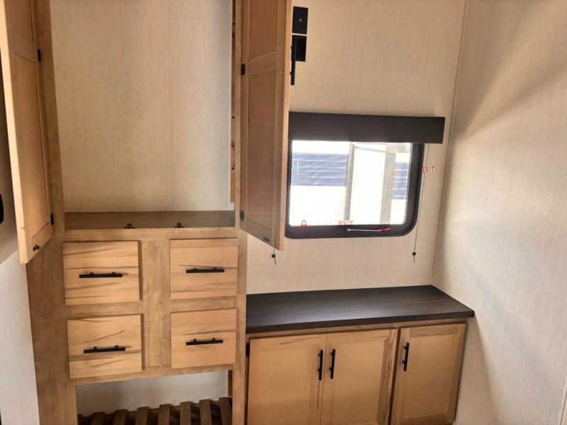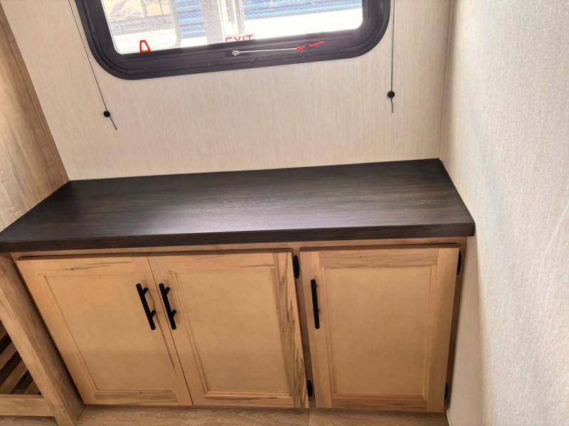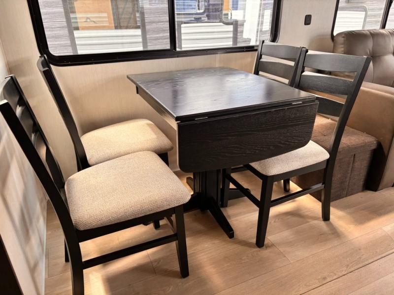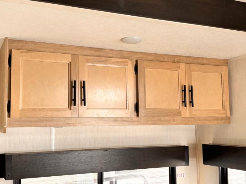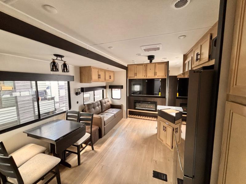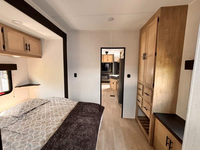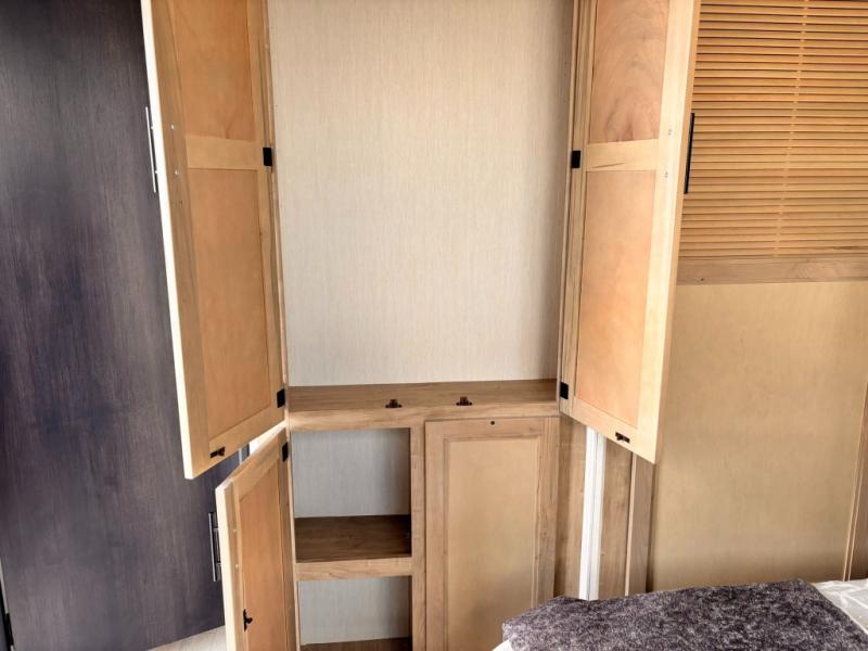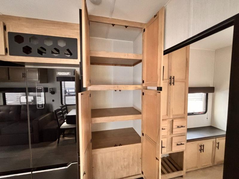 Spacious and comfortable is how you will describe this destination travel trailer featuring triple slides, two full baths, and a spacious combined kitchen and living area thanks to the large slide here featuring a free standing dinette and sofa. The kitchen includes everything you need to comfortably cook while you are away, and allows you to make meals for your family just like at home. There is a large pantry where you can keep plenty of snacks and dry goods for your trip. In the rear of the coach, there is a private bedroom featuring a queen bed slide for added space, comfortable sleeping, as well as ample storage between a dresser and wardrobe for your clothing. In the very back, a master suite bath featuring a vanity with sink, a shower with a seat, and linen storage for your towels and toiletries. This front bedroom also features a king bed slide!