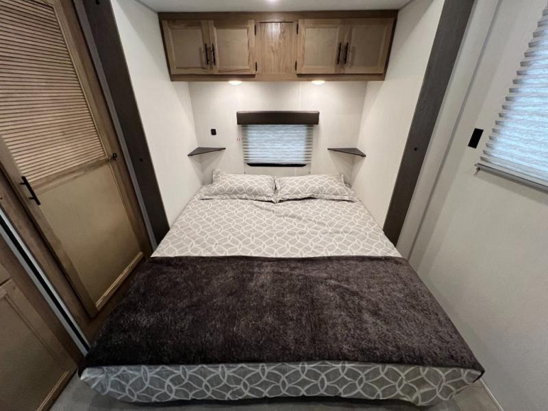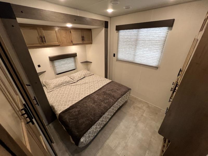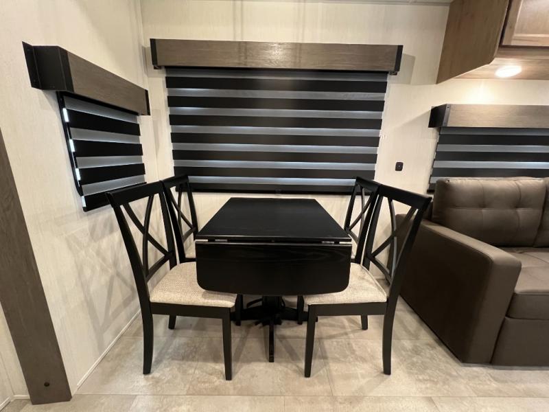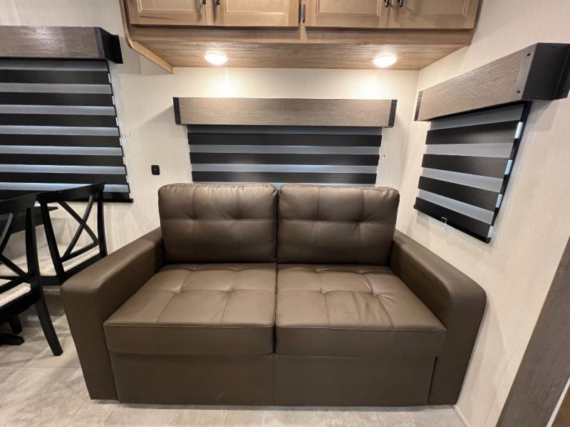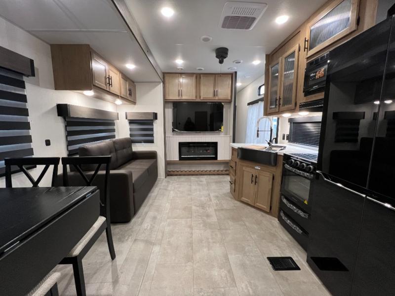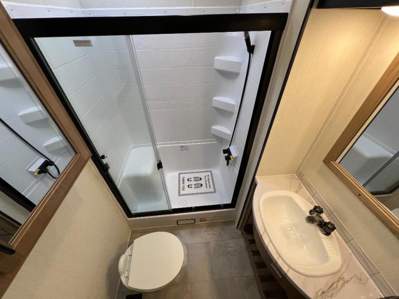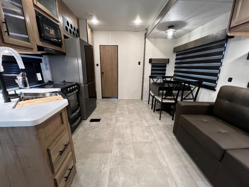 Spacious and comfortable is how you will describe this destination travel trailer featuring triple slides, two full baths, and a spacious combined kitchen and living area thanks to the large slide here featuring a free standing dinette and sofa. The kitchen includes everything you need to comfortably cook while you are away, and allows you to make meals for your family just like at home. There is a large pantry where you can keep plenty of snacks and dry goods for your trip. In the rear of the coach, there is a private bedroom featuring a queen bed slide for added space, comfortable sleeping, as well as ample storage between a dresser and wardrobe for your clothing. In the very back, a master suite bath featuring a vanity with sink, a shower with a seat, and linen storage for your towels and toiletries. This front bedroom also features a king bed slide!