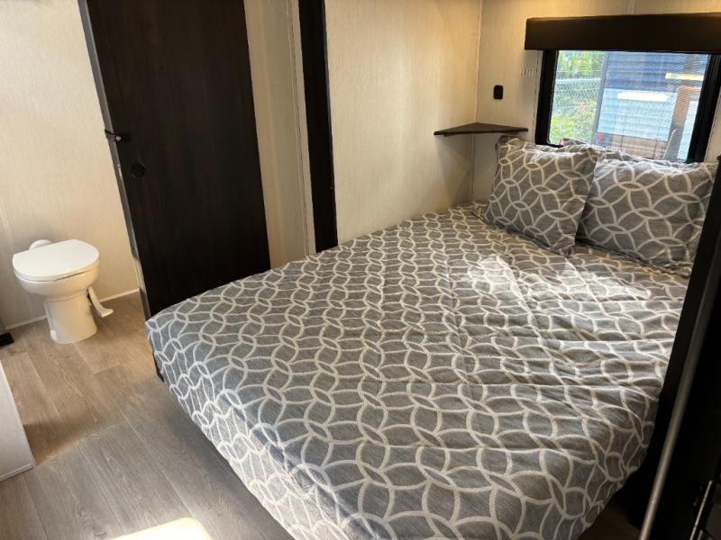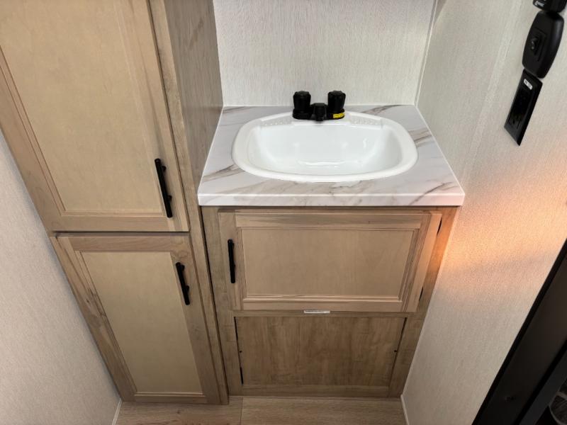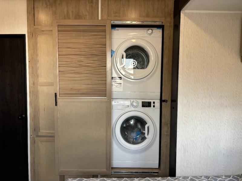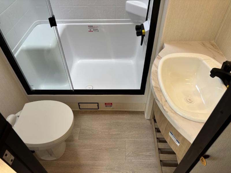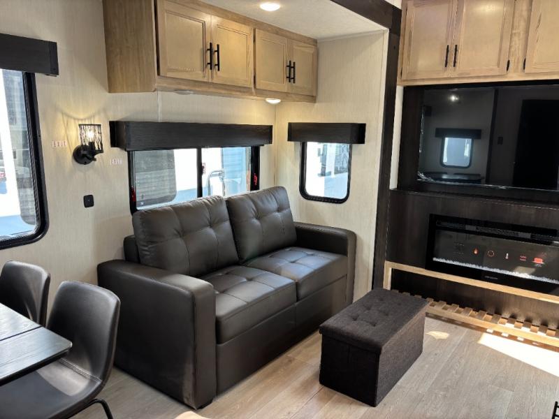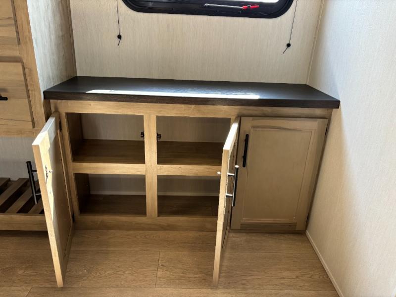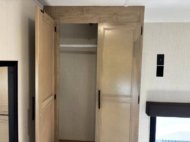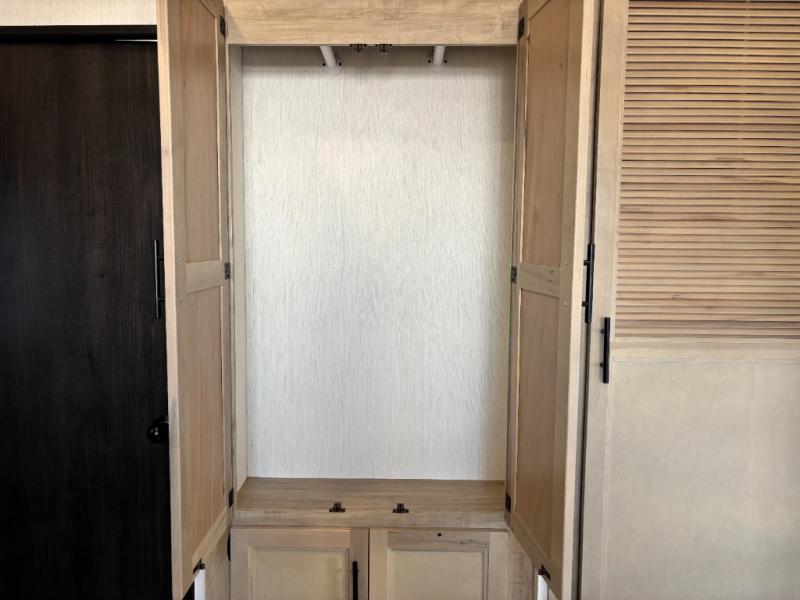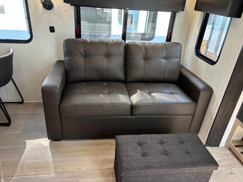 Spacious and comfortable is how you will describe this destination travel trailer featuring triple slides, two full baths, and a spacious combined kitchen and living area thanks to the large slide here featuring a free standing dinette and sofa. The kitchen includes everything you need to comfortably cook while you are away, and allows you to make meals for your family just like at home. There is a large pantry where you can keep plenty of snacks and dry goods for your trip. In the rear of the coach, there is a private bedroom featuring a queen bed slide for added space, comfortable sleeping, as well as ample storage between a dresser and wardrobe for your clothing. In the very back, a master suite bath featuring a vanity with sink, a shower with a seat, and linen storage for your towels and toiletries. This front bedroom also features a king bed slide!