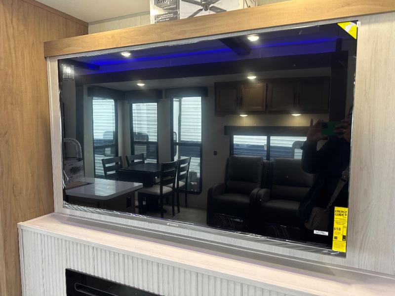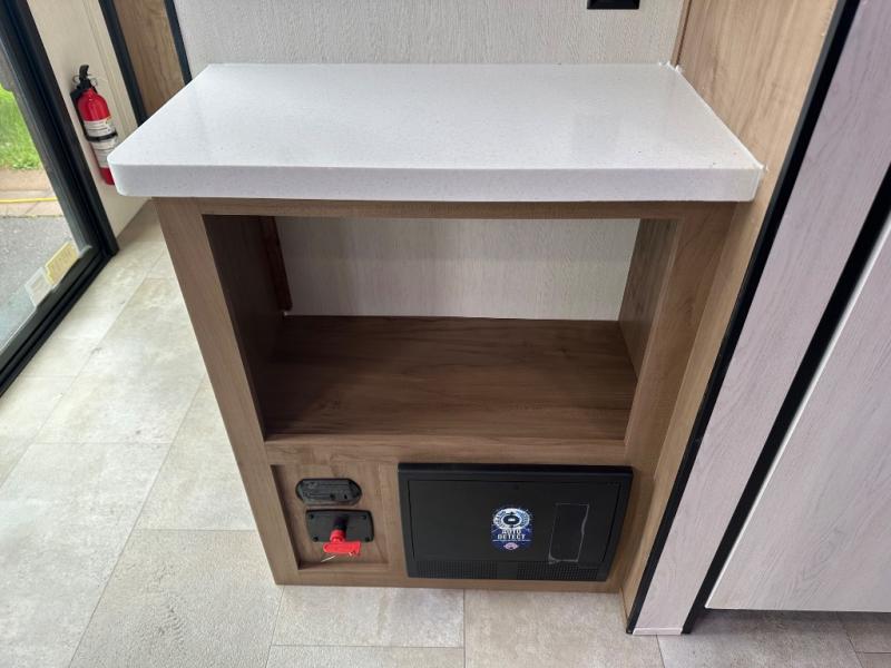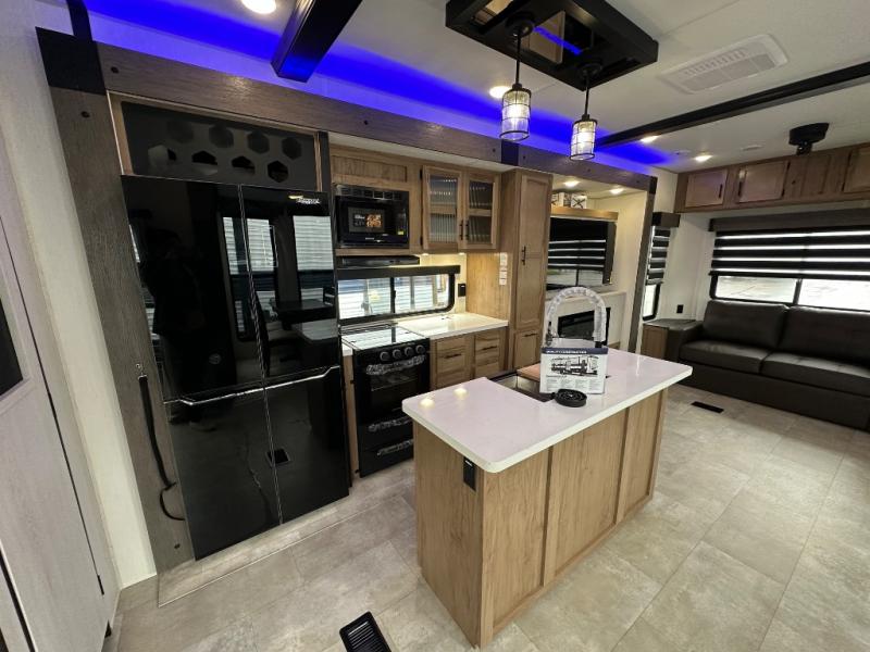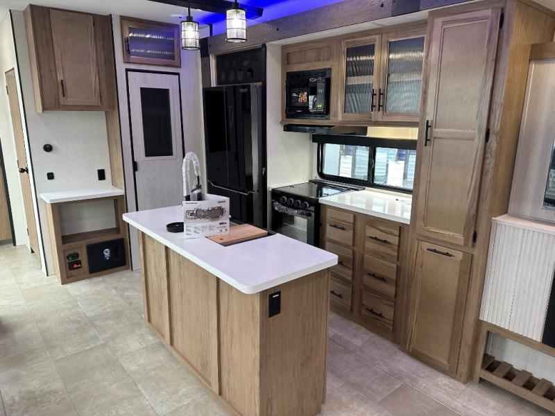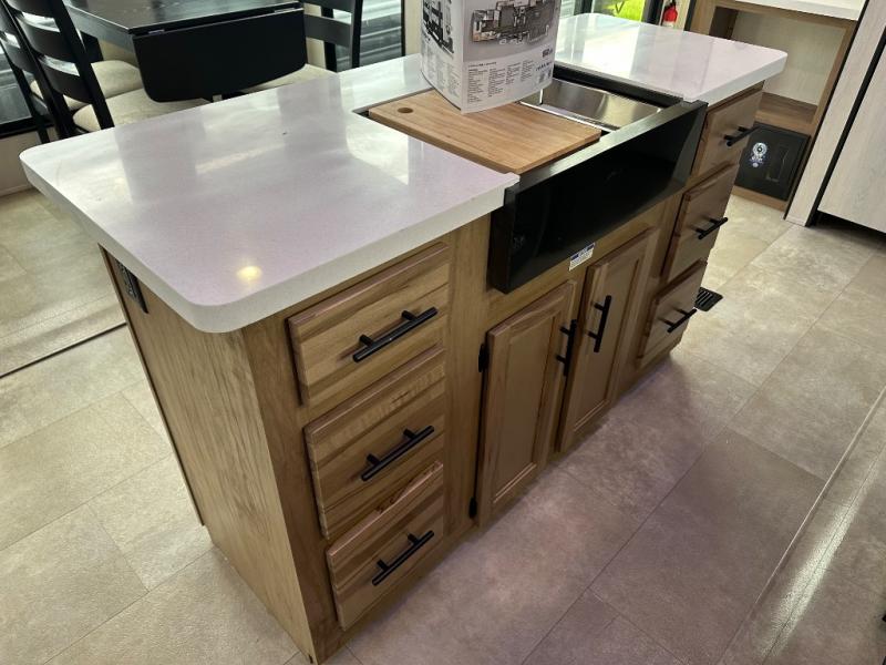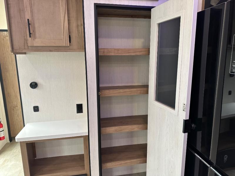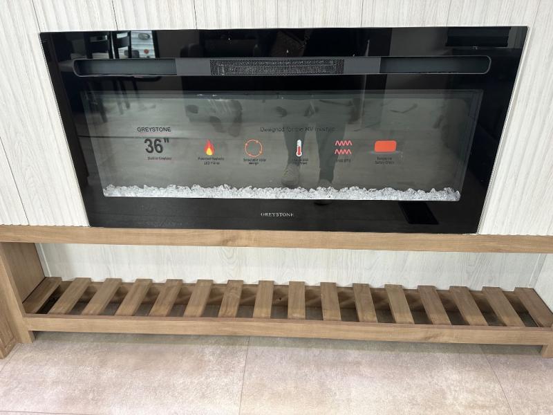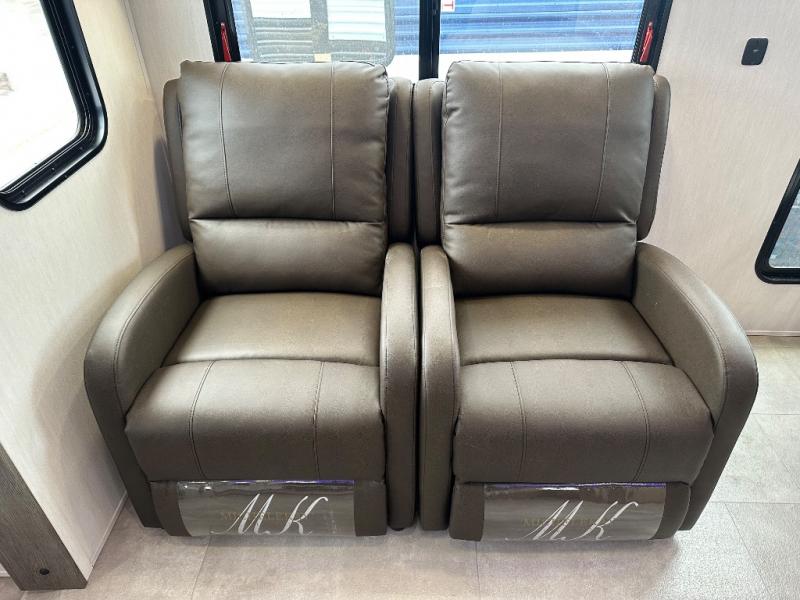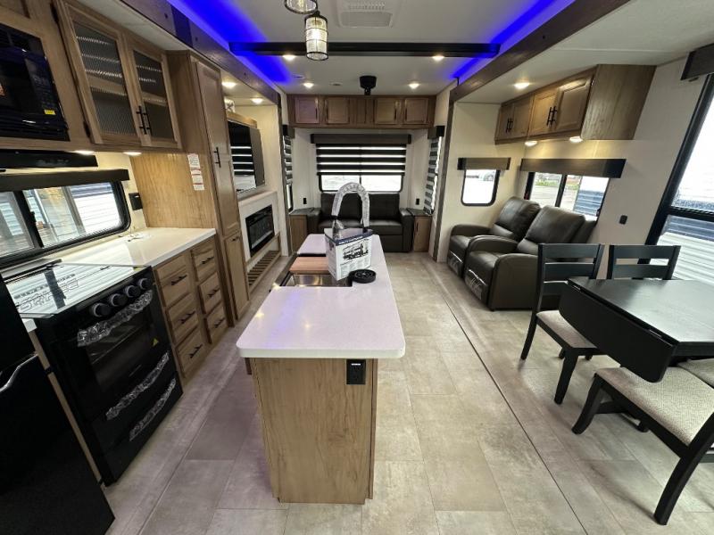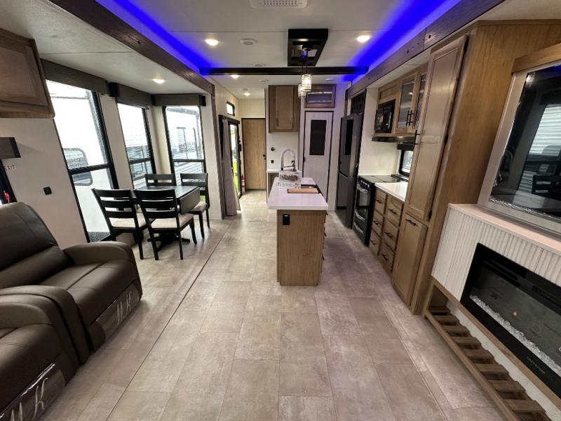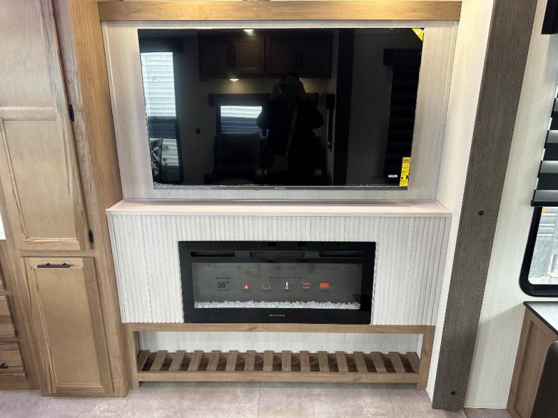 Spacious and comfortable describe this destination travel trailer featuring triple slides with dual opposing slides in the living area which creates a wide open space for a dining table and four chairs, two lounge chairs, an entertainment center with a fireplace, and a hide-a-bed sofa along the very front wall. The roadside slide also houses the kitchen appliances which include a refrigerator, stove and microwave oven. There is a pantry and a hutch adjacent to the slide, and a kitchen island for more food prep space, and this is where your sink is located so you can be facing all of the seating areas in the room while prepping meals and doing the dishes. A centrally located half bath is convenient just inside the main patio door entry. Towards the rear of the coach, a private bedroom featuring a king bed slide along with storage space for your clothing. In the very back, a master suite bath featuring a vanity with dual sinks, a shower with a seat, linen storage, and a wardrobe that has been prepped for a washer and dryer if you choose to add. You will love the outside TV mount and 21' covered awning space to create a nice size outdoor living area to enjoy on sunny days or pleasant evenings.