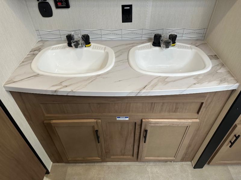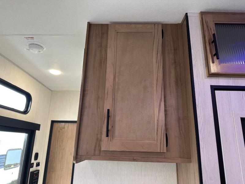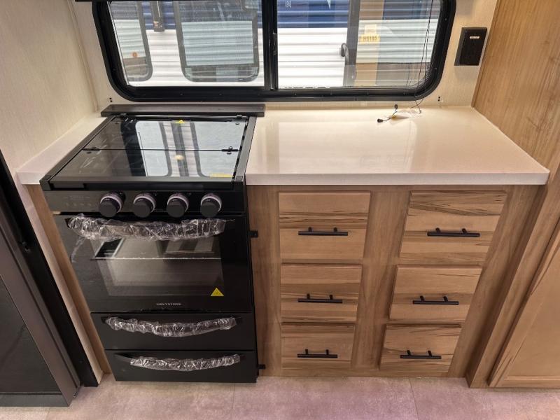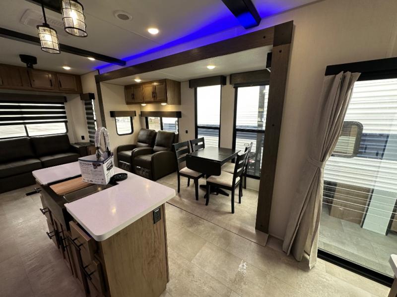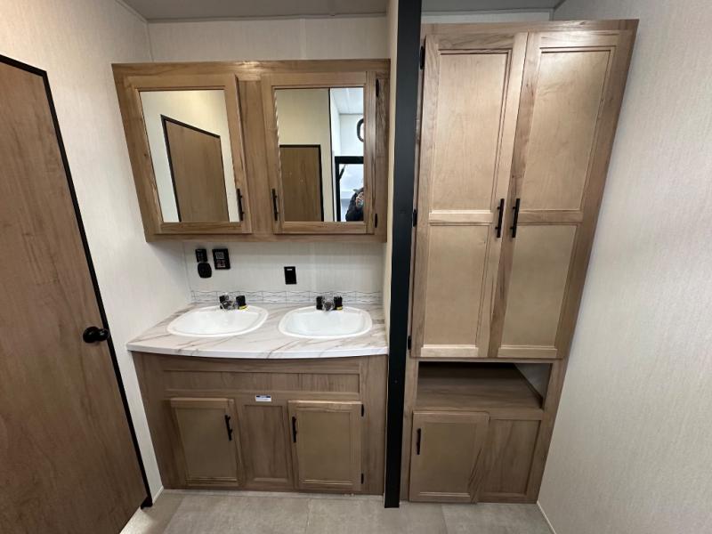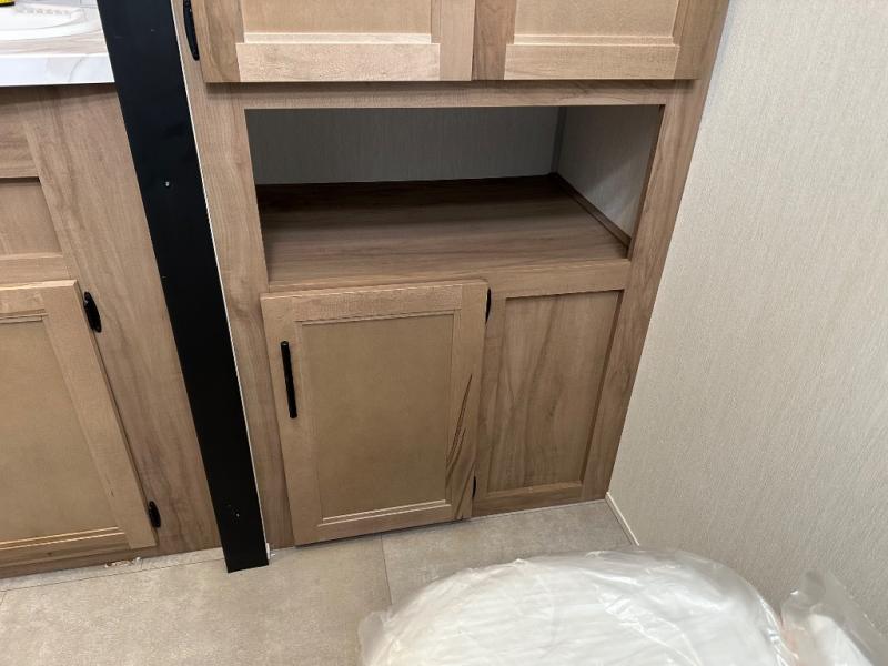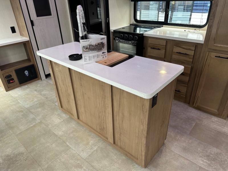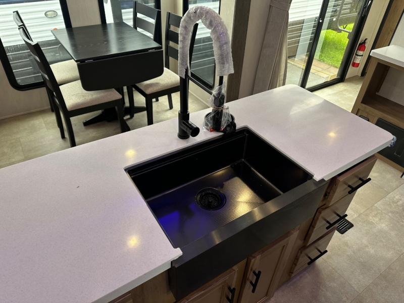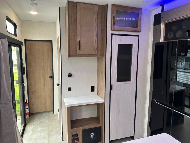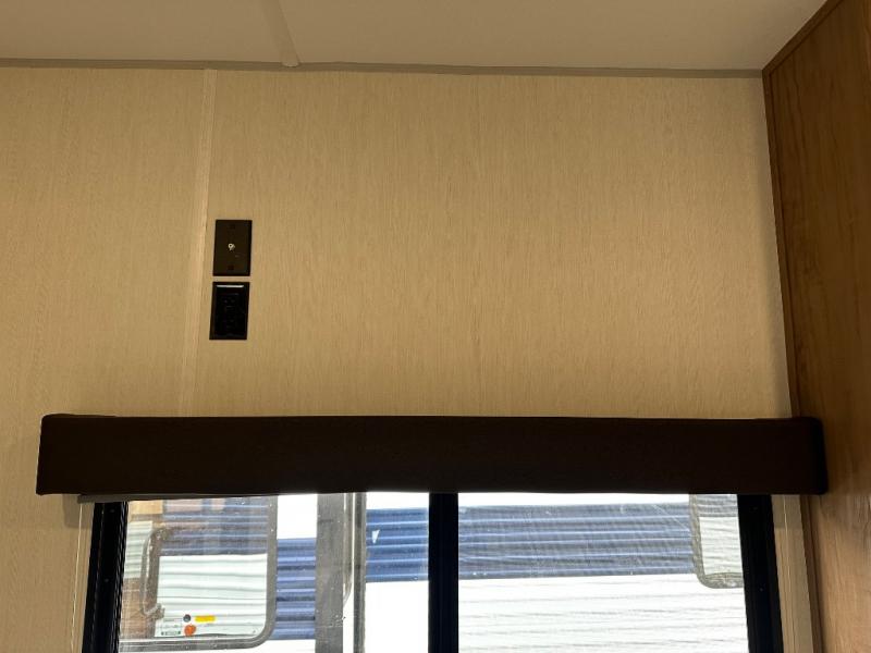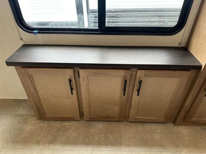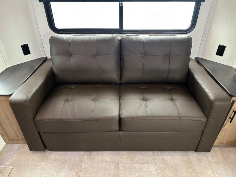 Spacious and comfortable describe this destination travel trailer featuring triple slides with dual opposing slides in the living area which creates a wide open space for a dining table and four chairs, two lounge chairs, an entertainment center with a fireplace, and a hide-a-bed sofa along the very front wall. The roadside slide also houses the kitchen appliances which include a refrigerator, stove and microwave oven. There is a pantry and a hutch adjacent to the slide, and a kitchen island for more food prep space, and this is where your sink is located so you can be facing all of the seating areas in the room while prepping meals and doing the dishes. A centrally located half bath is convenient just inside the main patio door entry. Towards the rear of the coach, a private bedroom featuring a king bed slide along with storage space for your clothing. In the very back, a master suite bath featuring a vanity with dual sinks, a shower with a seat, linen storage, and a wardrobe that has been prepped for a washer and dryer if you choose to add. You will love the outside TV mount and 21' covered awning space to create a nice size outdoor living area to enjoy on sunny days or pleasant evenings.