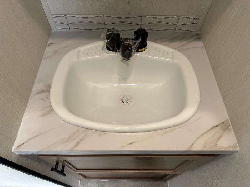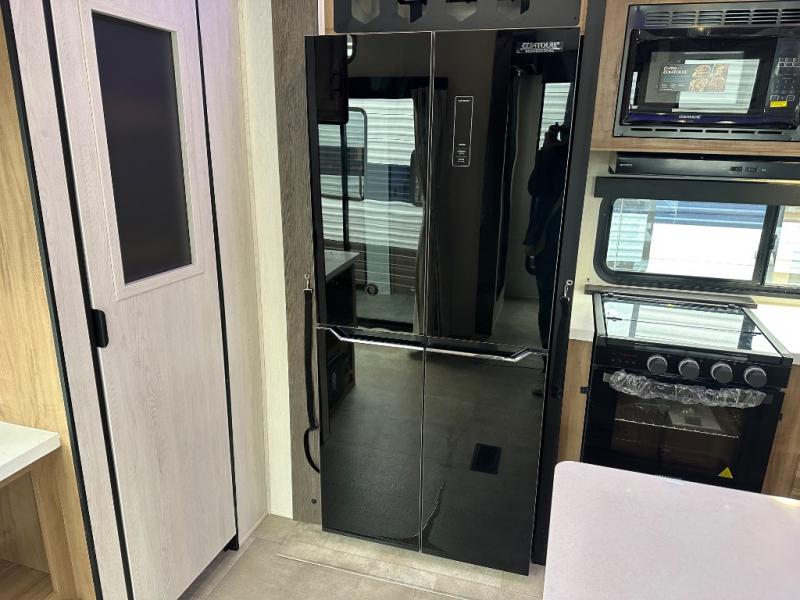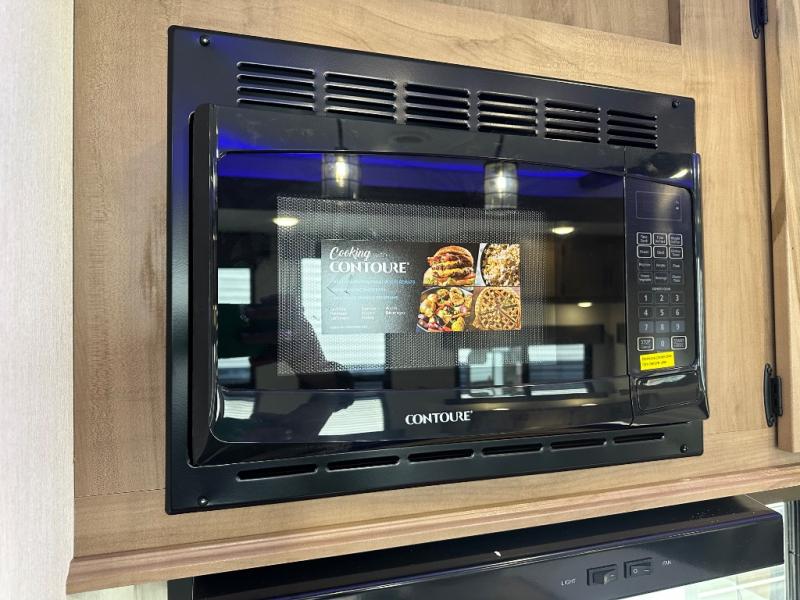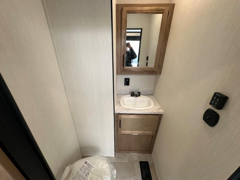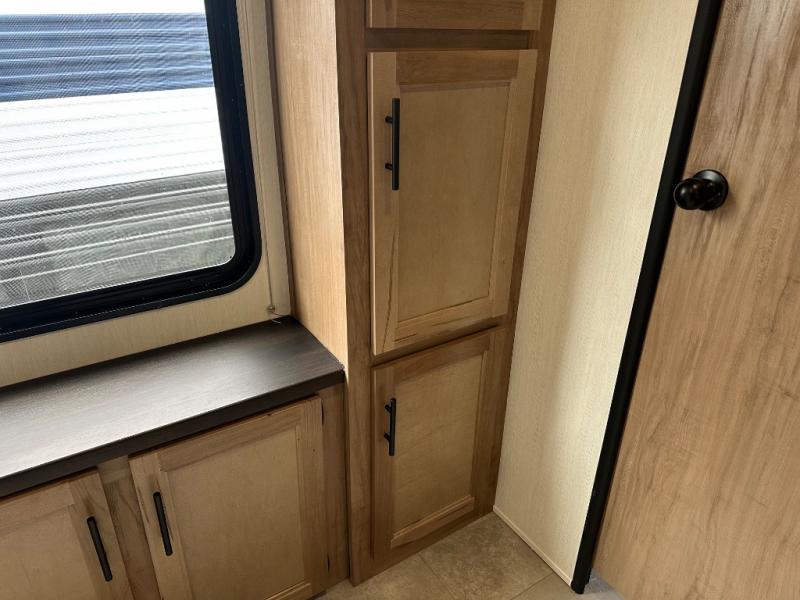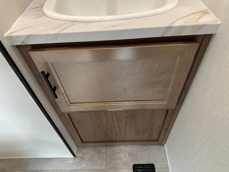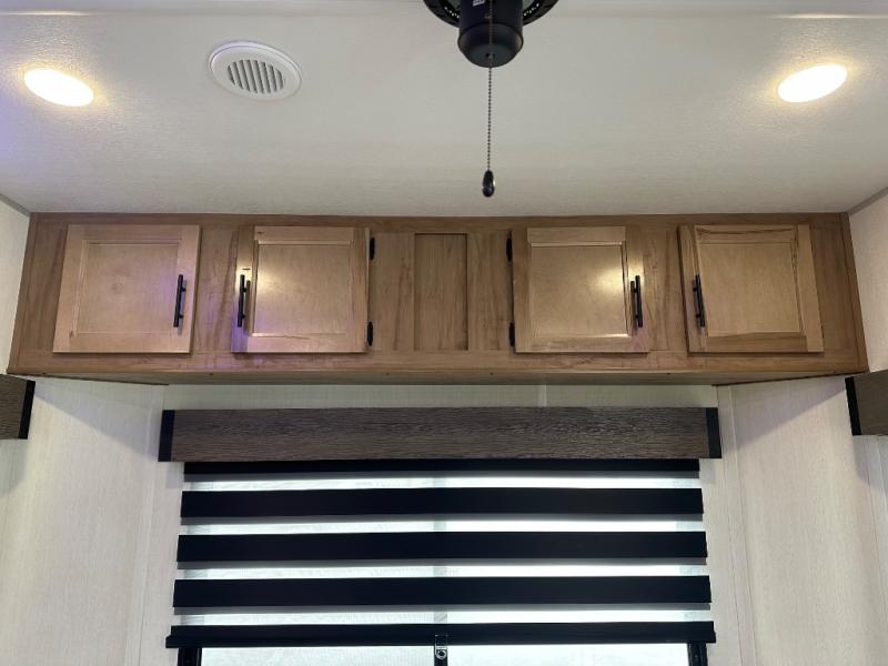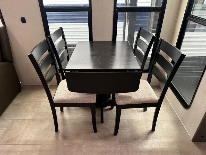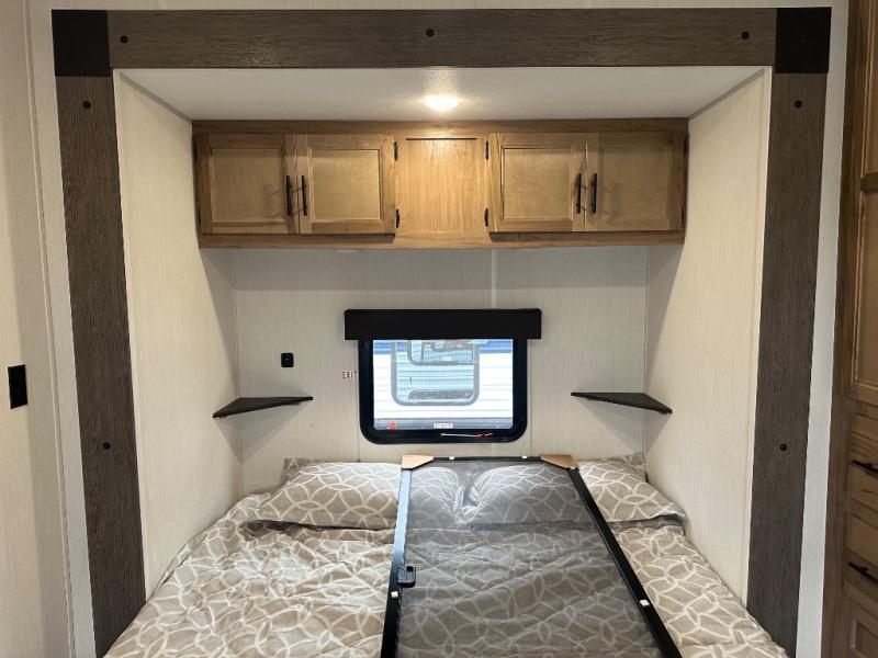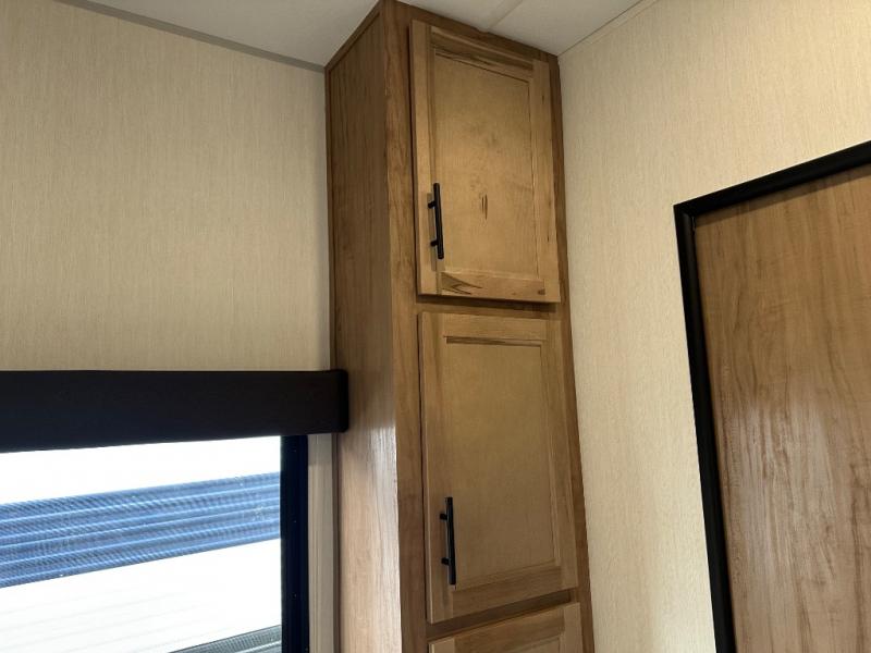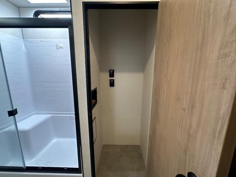 Spacious and comfortable describe this destination travel trailer featuring triple slides with dual opposing slides in the living area which creates a wide open space for a dining table and four chairs, two lounge chairs, an entertainment center with a fireplace, and a hide-a-bed sofa along the very front wall. The roadside slide also houses the kitchen appliances which include a refrigerator, stove and microwave oven. There is a pantry and a hutch adjacent to the slide, and a kitchen island for more food prep space, and this is where your sink is located so you can be facing all of the seating areas in the room while prepping meals and doing the dishes. A centrally located half bath is convenient just inside the main patio door entry. Towards the rear of the coach, a private bedroom featuring a king bed slide along with storage space for your clothing. In the very back, a master suite bath featuring a vanity with dual sinks, a shower with a seat, linen storage, and a wardrobe that has been prepped for a washer and dryer if you choose to add. You will love the outside TV mount and 21' covered awning space to create a nice size outdoor living area to enjoy on sunny days or pleasant evenings.