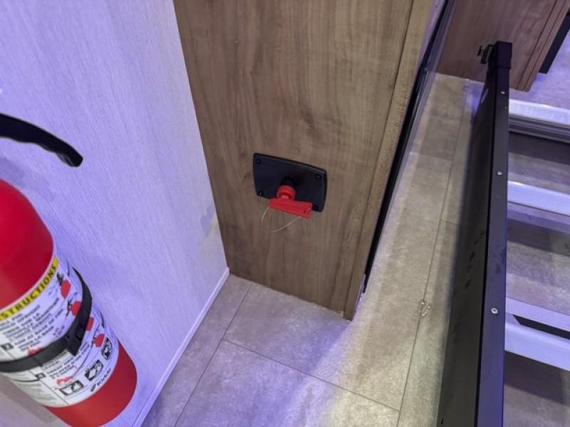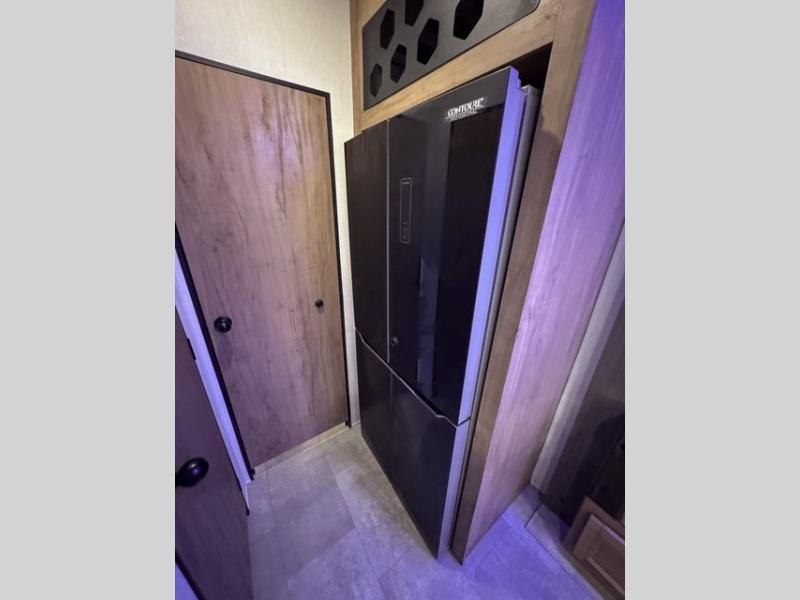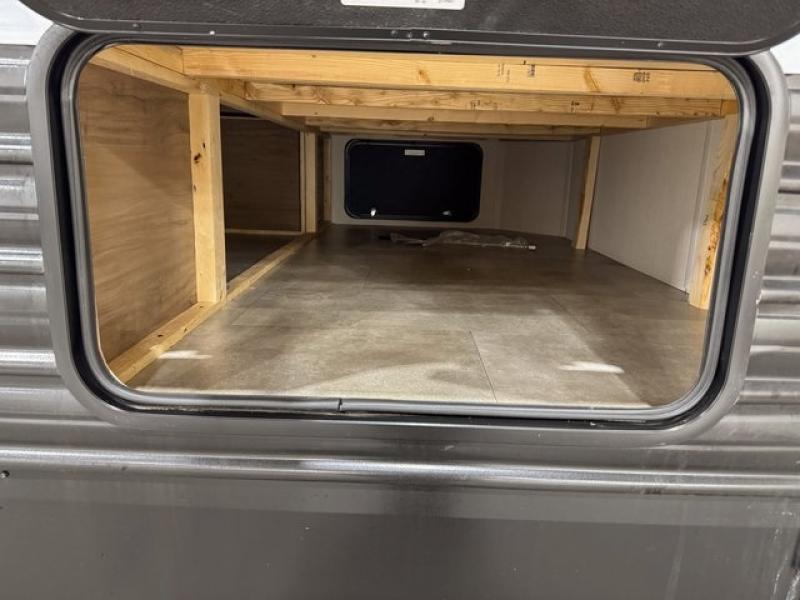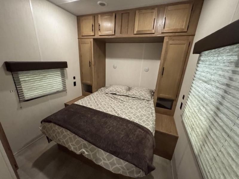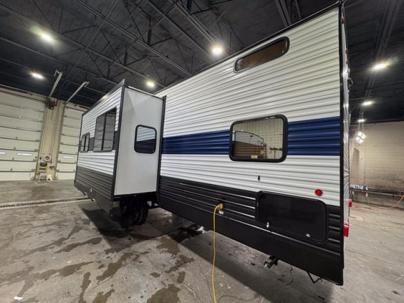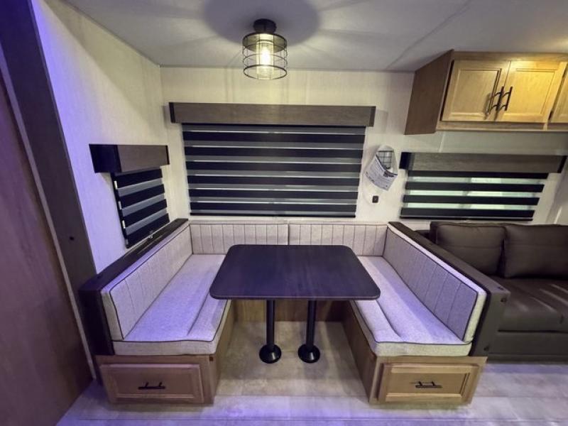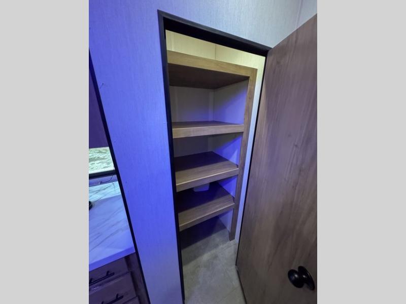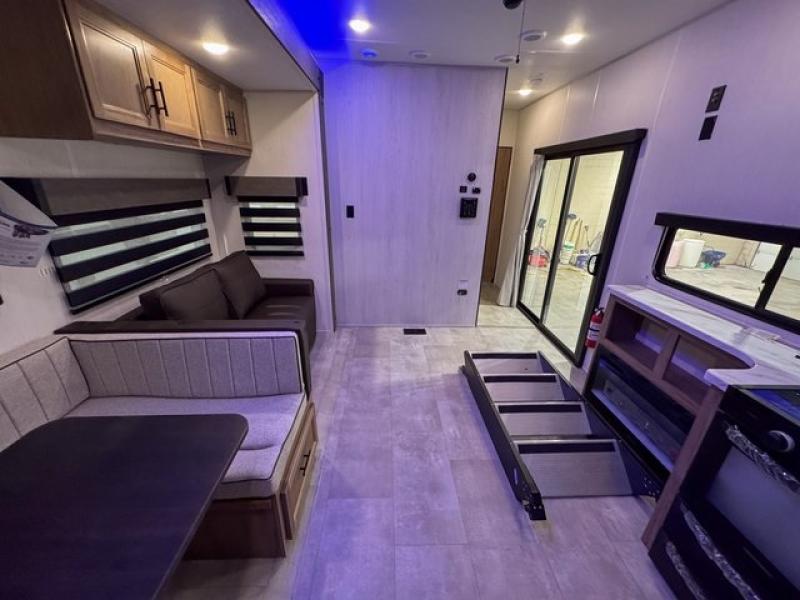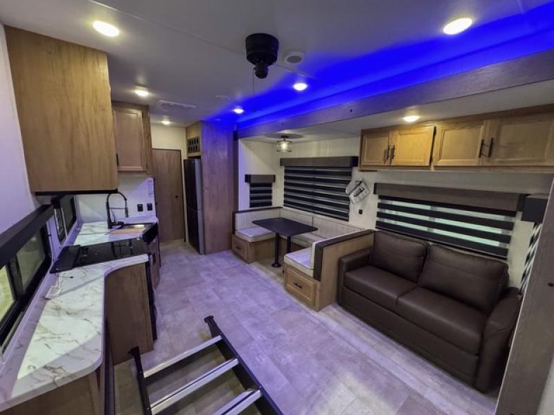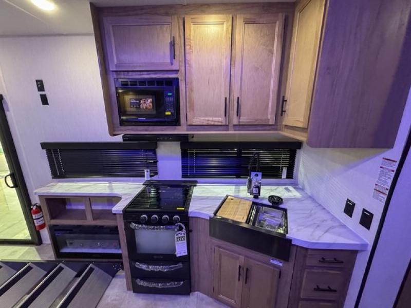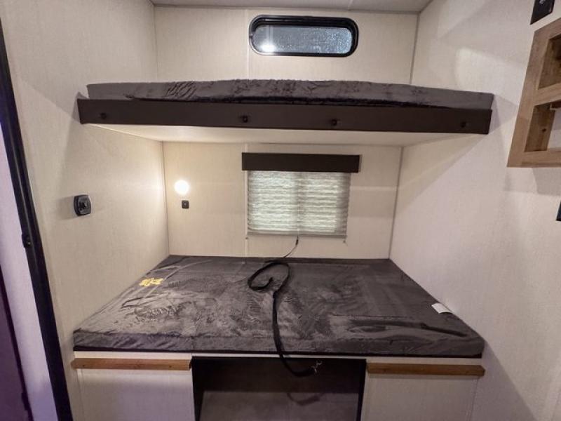 Ten can easily sleep in this destination travel trailer featuring a bunkhouse, large slide in the living area which creates a wide open space for a U-shaped dinette and sofa where you can enjoy the entertainment center with a fireplace. The kitchen is fully equipped with everything needed to create meals and snacks for your whole crew, and the walk-in pantry is great for storing all of your non-perishables. This space also features optional washer/dryer prep. In the very back, the bunkhouse features comfortable sleeping with double bunks on one side and double bunks with a hinged platform along the opposite side that the kids are sure to love. Up front, a side aisle bath featuring a shower with a seat, a vanity with medicine cabinet, and a toilet. You will also love the outside TV mount and 18' power awning space to create a nice size outdoor living area to enjoy on sunny days or pleasant evenings.