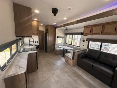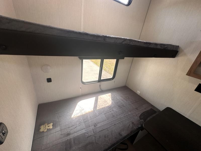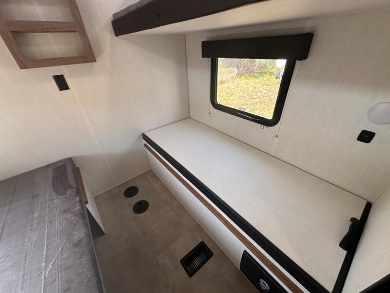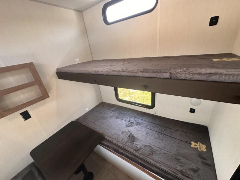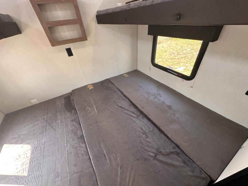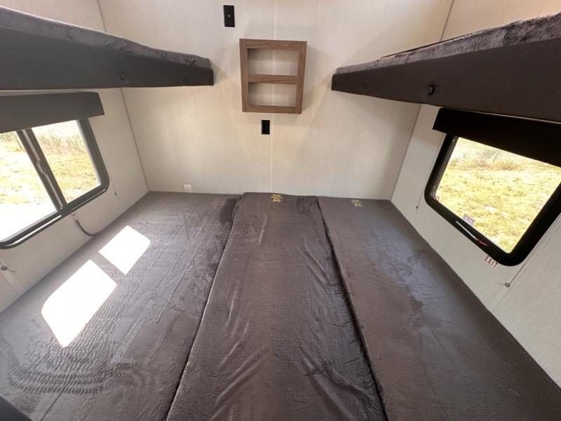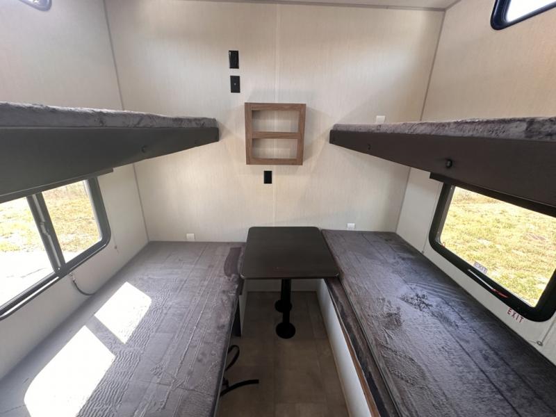 Ten can easily sleep in this destination travel trailer featuring a bunkhouse, large slide in the living area which creates a wide open space for a U-shaped dinette and sofa where you can enjoy the entertainment center with a fireplace. The kitchen is fully equipped with everything needed to create meals and snacks for your whole crew, and the walk-in pantry is great for storing all of your non-perishables. This space also features optional washer/dryer prep. In the very back, the bunkhouse features comfortable sleeping with double bunks on one side and double bunks with a hinged platform along the opposite side that the kids are sure to love. Up front, a side aisle bath featuring a shower with a seat, a vanity with medicine cabinet, and a toilet. You will also love the outside TV mount and 18' power awning space to create a nice size outdoor living area to enjoy on sunny days or pleasant evenings.