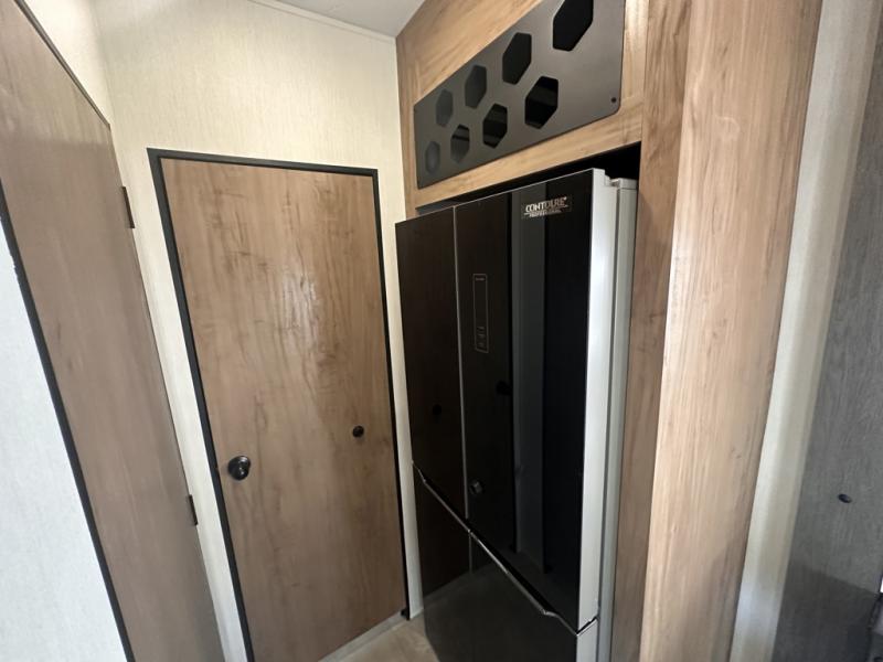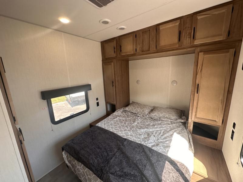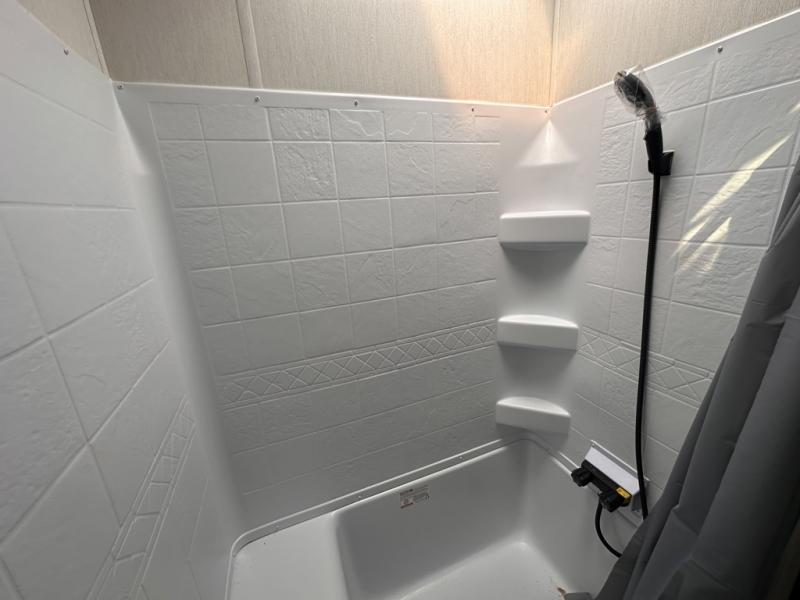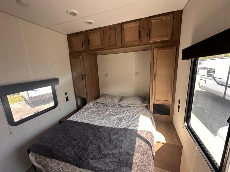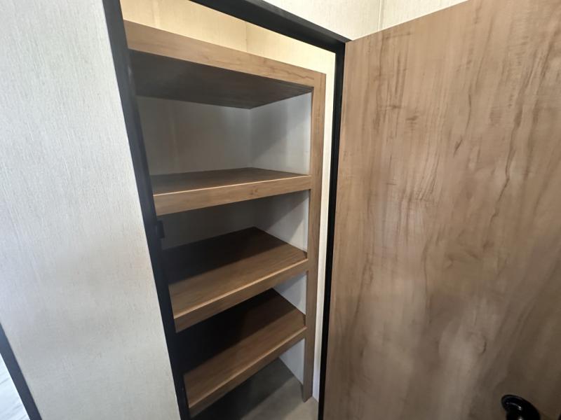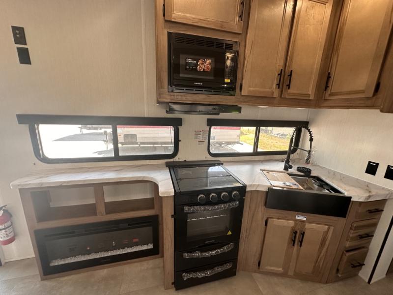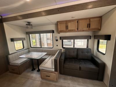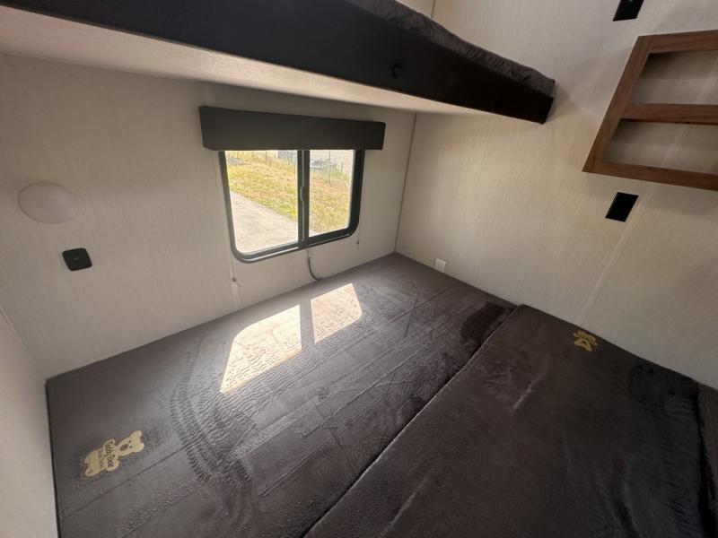 Ten can easily sleep in this destination travel trailer featuring a bunkhouse, large slide in the living area which creates a wide open space for a U-shaped dinette and sofa where you can enjoy the entertainment center with a fireplace. The kitchen is fully equipped with everything needed to create meals and snacks for your whole crew, and the walk-in pantry is great for storing all of your non-perishables. This space also features optional washer/dryer prep. In the very back, the bunkhouse features comfortable sleeping with double bunks on one side and double bunks with a hinged platform along the opposite side that the kids are sure to love. Up front, a side aisle bath featuring a shower with a seat, a vanity with medicine cabinet, and a toilet. You will also love the outside TV mount and 18' power awning space to create a nice size outdoor living area to enjoy on sunny days or pleasant evenings.