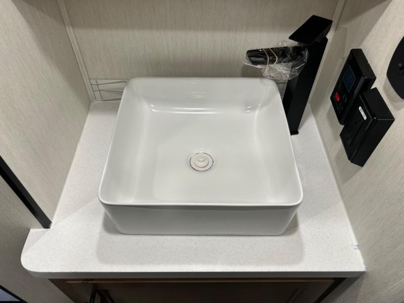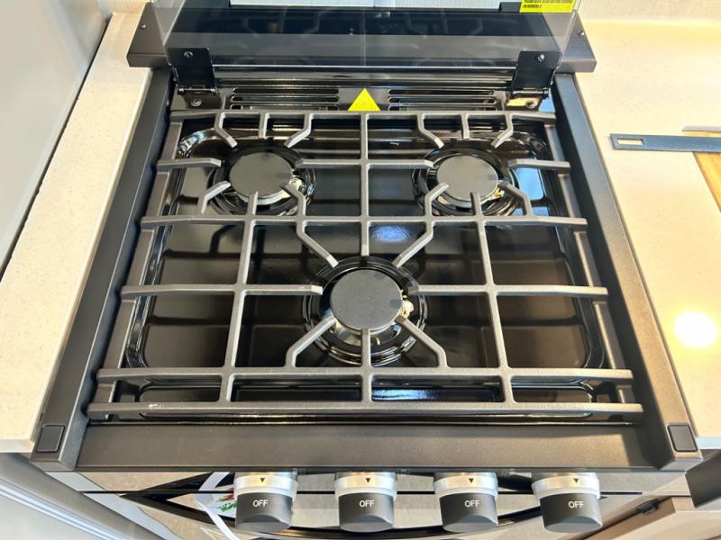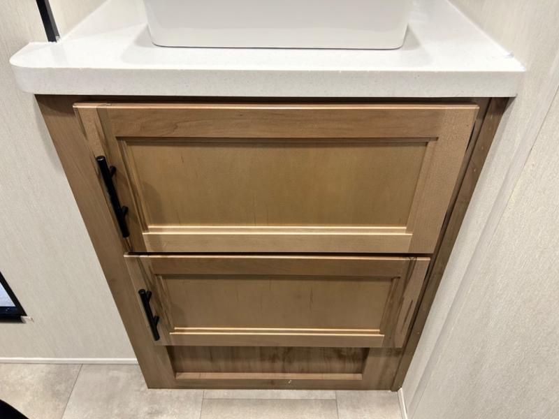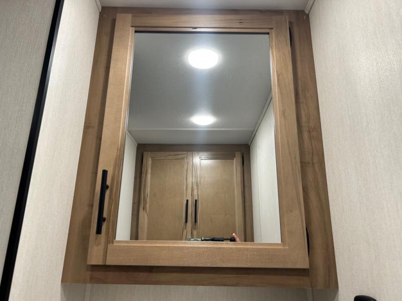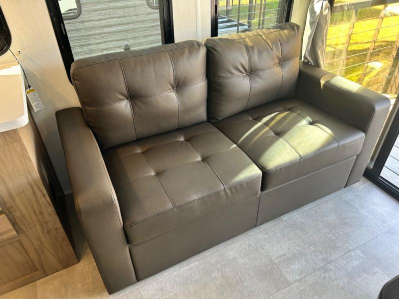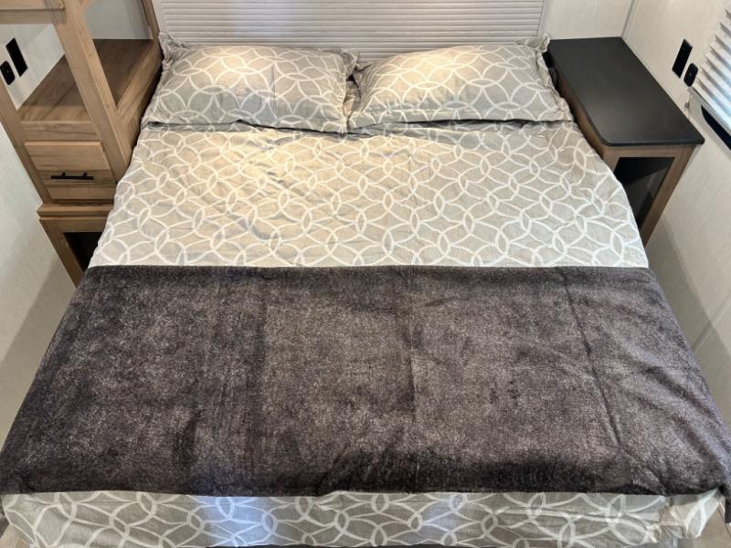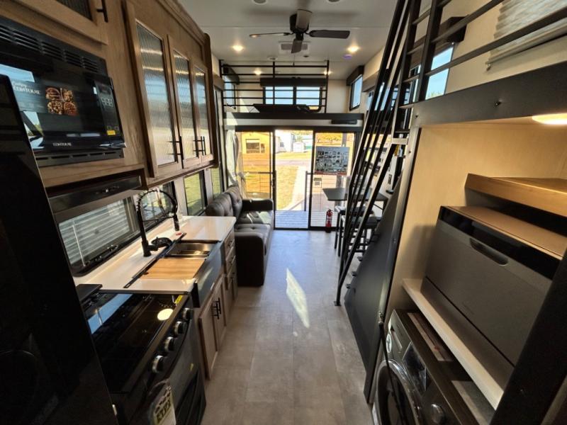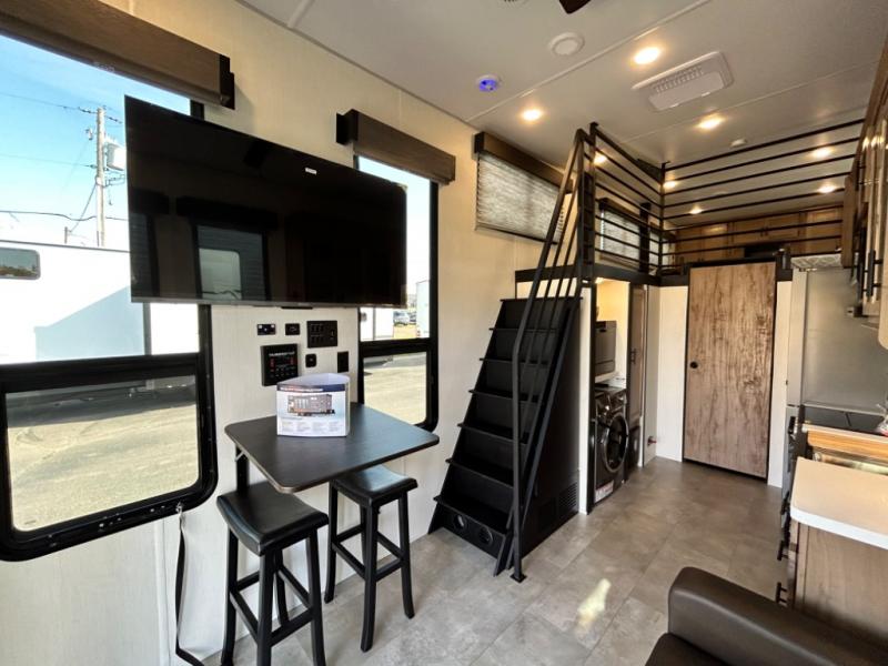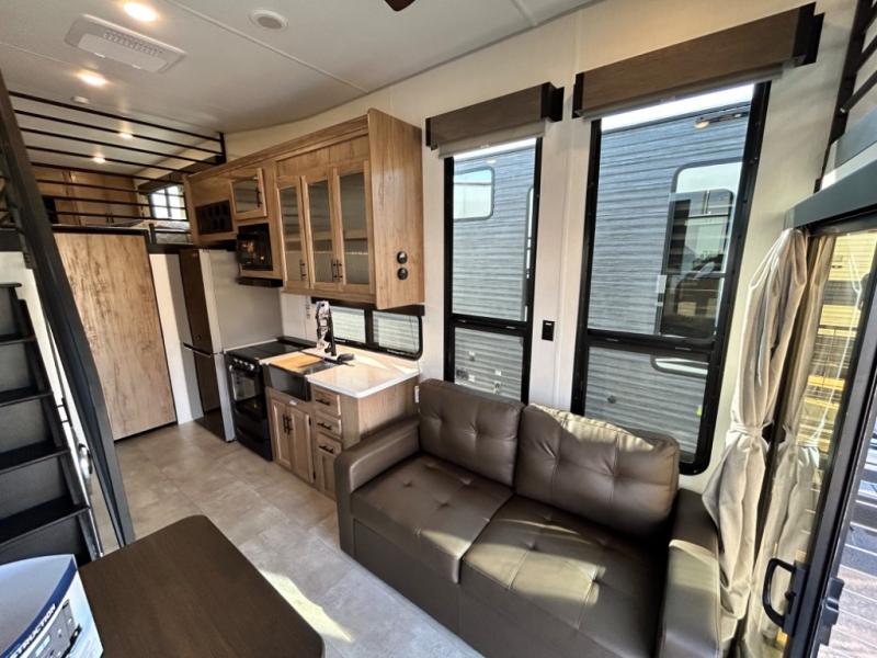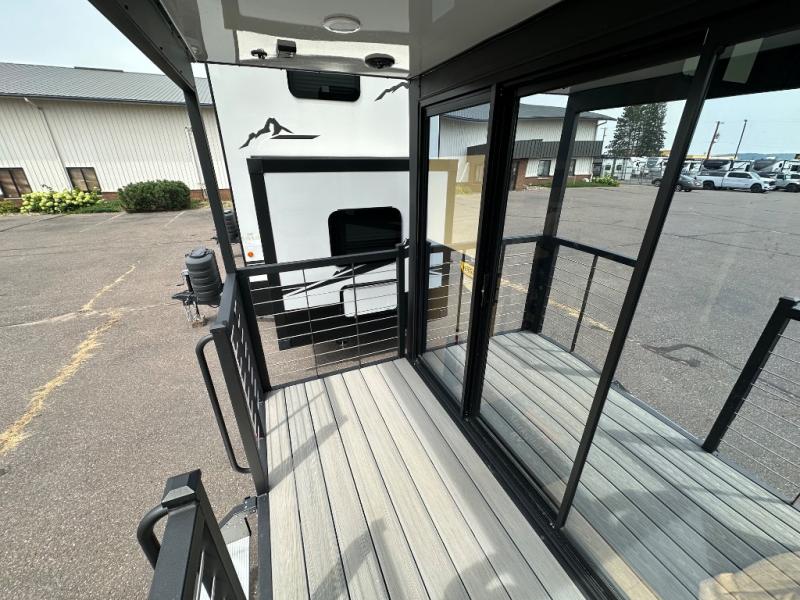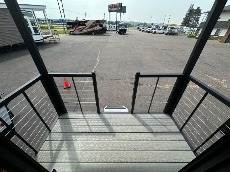 This model is similar to 16MLBL but larger! A bigger bathroom, king bed in the lower master, and a queen bed plus a twin bunk mat in the front loft. There is an 18 cu. ft. refrigerator so you can stock up for a week long vacation, a hide-a-bed sofa that can transform into added sleeping for guests, and a high top table with two stools to dine at. A ladder allows access into the upper front loft that is over the covered patio. The bathroom below is split with a shower on one side, and a private toilet area and sink opposite. And the view is amazing from just about anywhere inside.