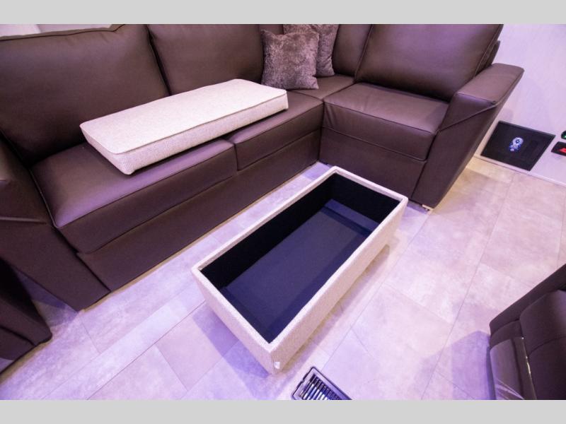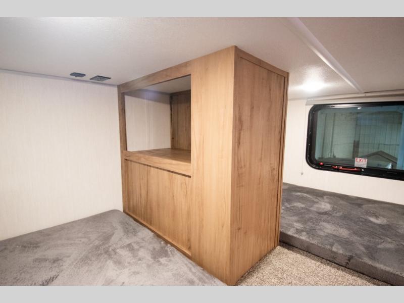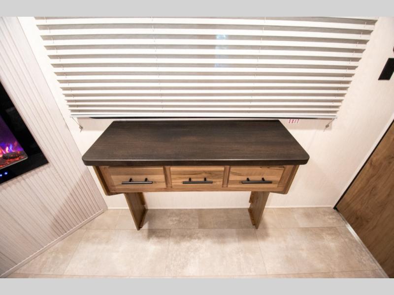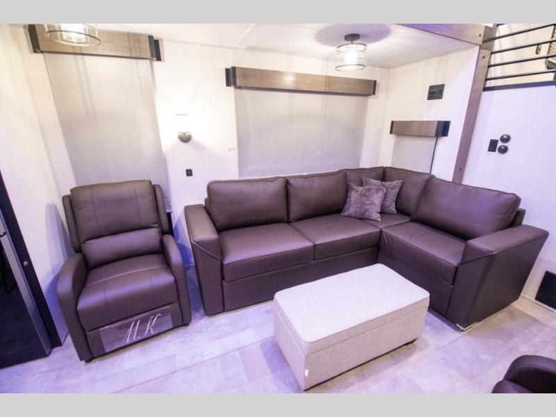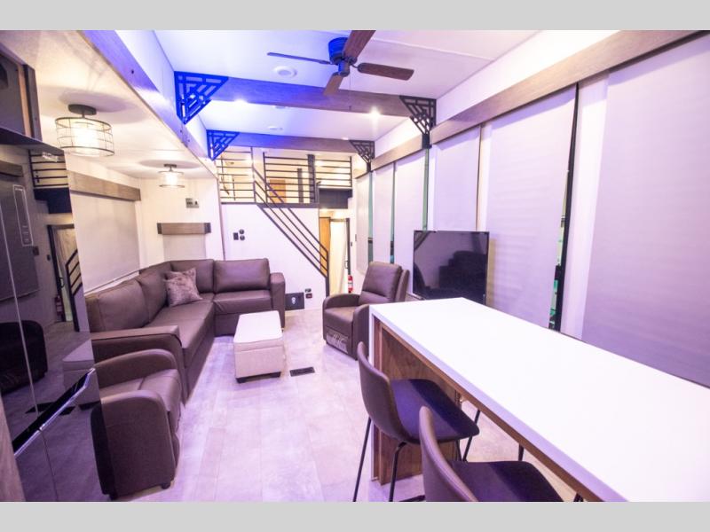 Time spent in this destination trailer will be time well spent! You will appreciate dual entry doors for maximum convenience, plus a spacious full bath that is close by the front private bedroom! Your crew can relax in the middle living area on the L-shaped hide-a-bed sofa or on the two lounge chairs. The rear kitchen will be any chef's dream with its island with six stools and all the appliances to create meals each day. This model also features triple slides so you can enjoy more space to relax. The front bedroom includes a king bed slide out, a desk with drawers, and a bedroom fireplace. And above this room is where you'll find the spacious loft with two bunk mats, storage, and space for the little ones to play!