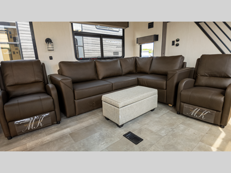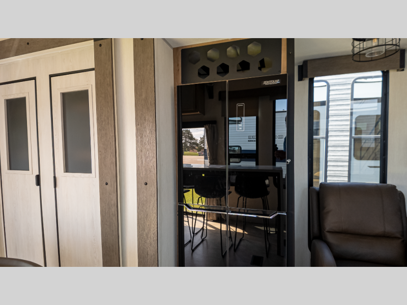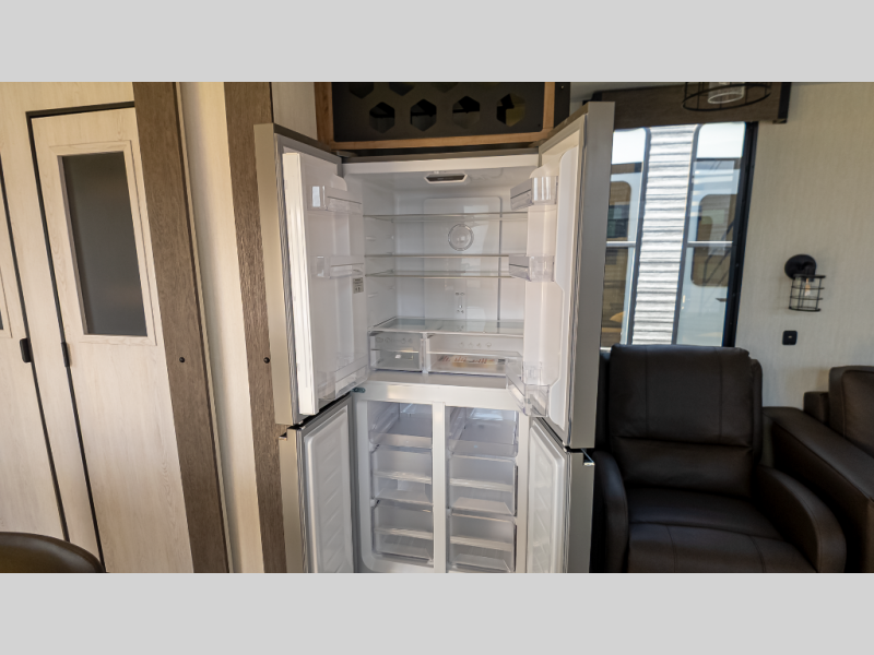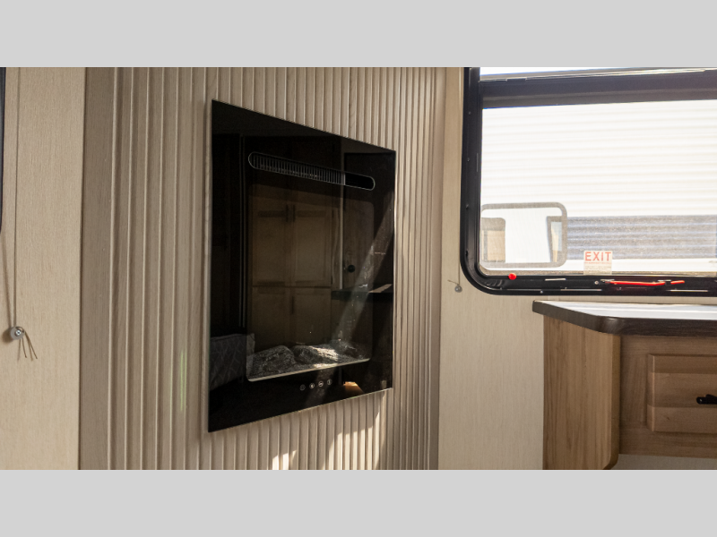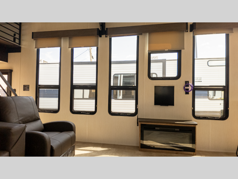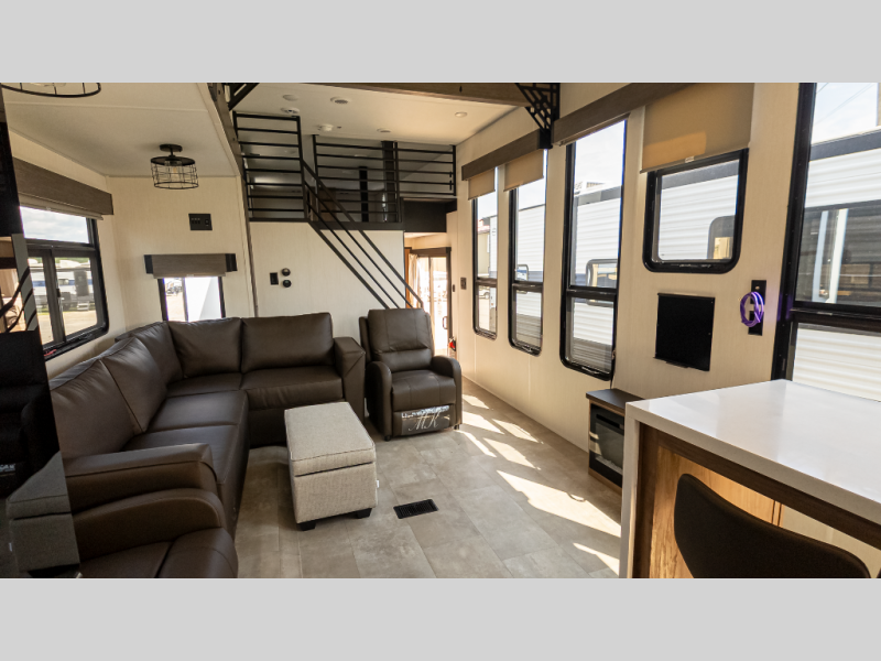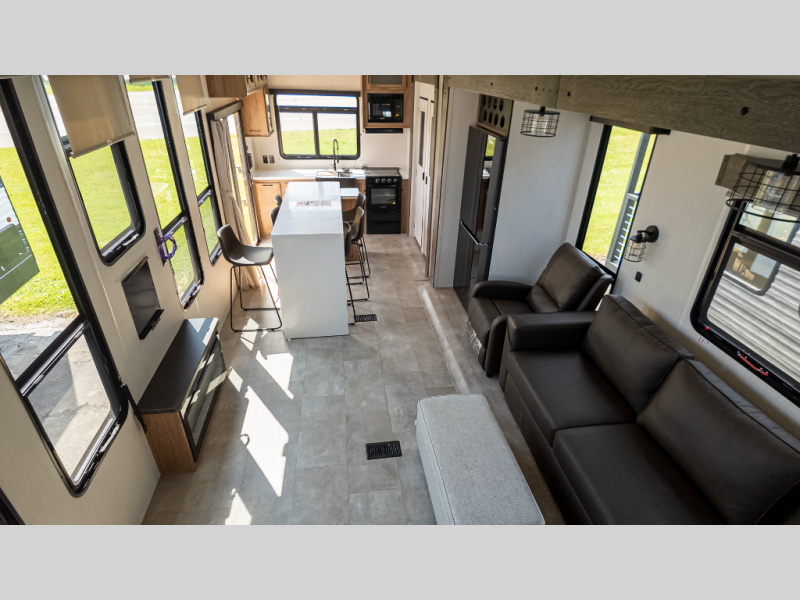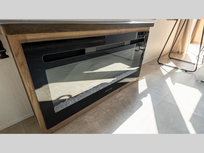 - Key Features: Rear gourmet kitchen with island & residential fridge, L-shaped hide-a-bed sofa, triple-entry doors, king front slide suite, dual lofts, spacious bathroom with seat, tankless water heater, supersized central A/C, Power Gear frame & armored underbelly, frameless solar-reflective windows, USB-C ports, fireplace
