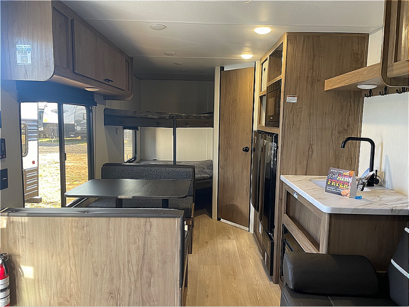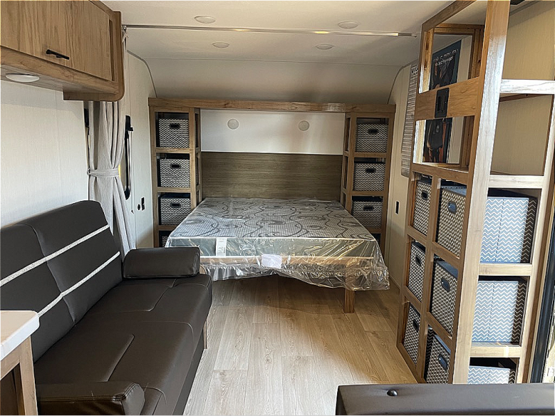 Enjoy family adventures in this all-electric bunk model which features sleeping for eight to ten depending on size with a queen bed up front, double bed bunks in the rear curbside corner, and you could even convert the booth dinette and sofa to sleep more. Inside, you will find ample storage with overhead cabinets and a large shelf above the queen bed, plus more shelves next to the entry door, as well as a pantry and storage on either side of the bed. You will appreciate the full bath with tub/shower, toilet, and sink so you can skip the campground facilities. On the outside, you will also find a 12' awning for added outdoor living, and outside storage for your camping gear, plus more!