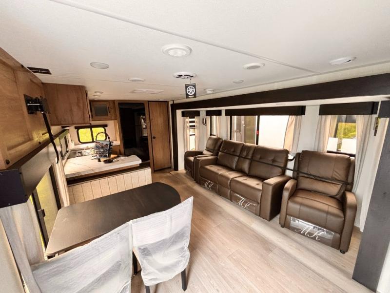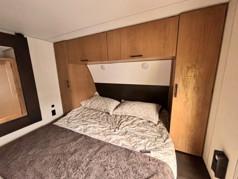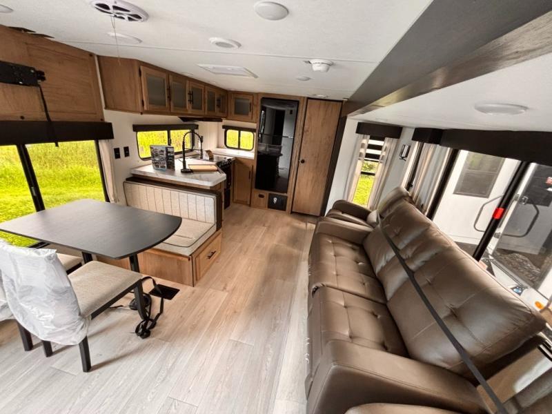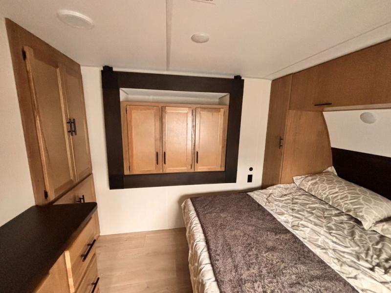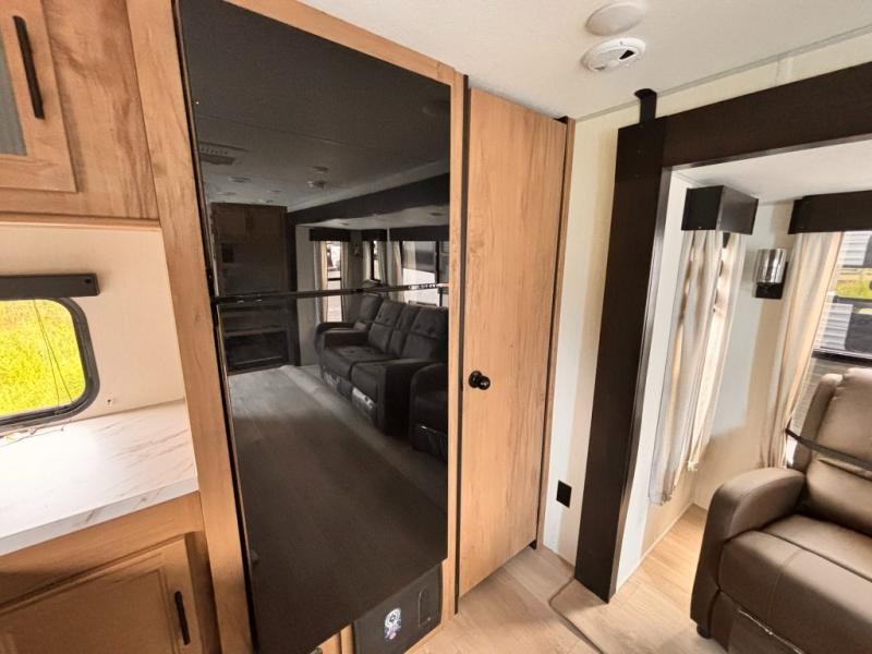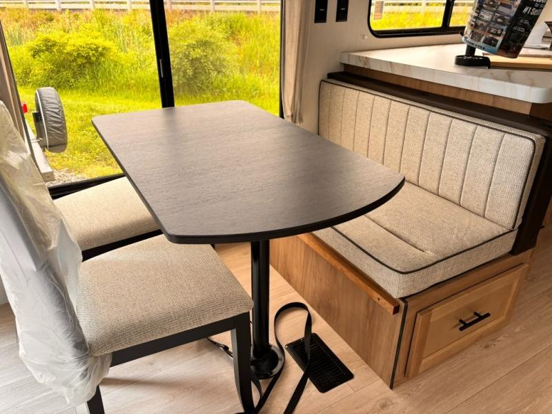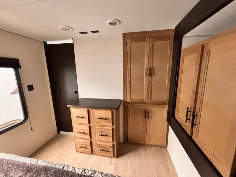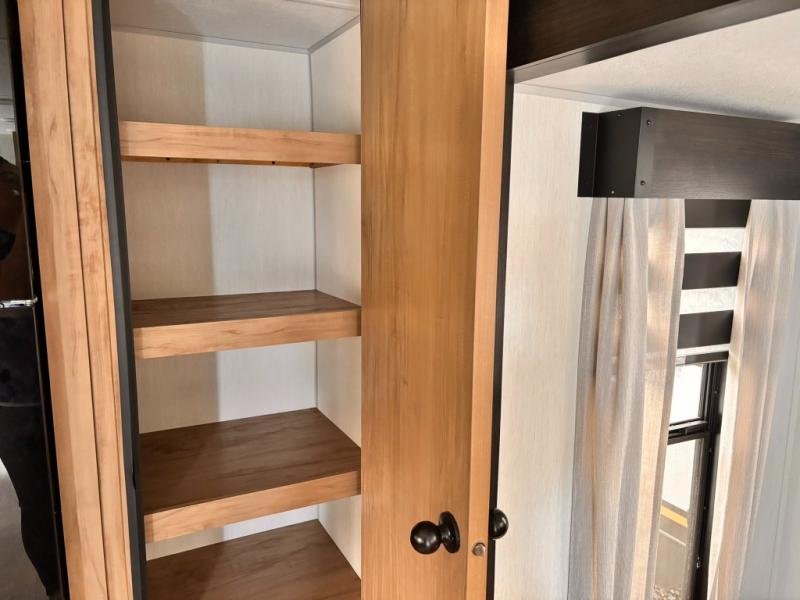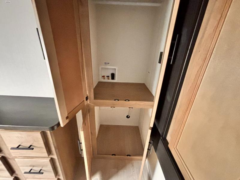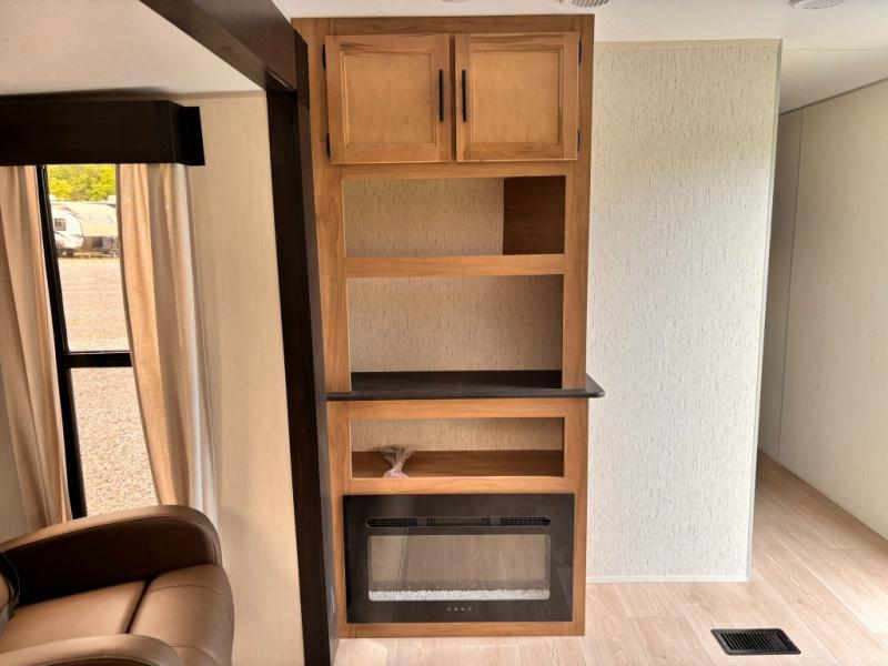Camping trips to the lake just got sweeter in this spacious travel trailer. You will wake up feeling refreshed each morning after sleeping on the RV king bed. There are also dual bedside wardrobes, plus a dresser and a wardrobe slide out for more space. The linen closet with the option to add a washer and dryer will be another bonus if you plan to go full-time! The chef of your group will love the rear kitchen with a spacious pantry and 12V refrigerator for food storage, plus there is an air fryer to make some crispy chicken. The dinette with bench seating on one side and two chairs on the other will provide a place to dine together, or you can take your plate outdoors to sit under the 15' power awning. The sofa and dual lounge chairs within the living room slide will make you feel right at home, especially with the fireplace close by!