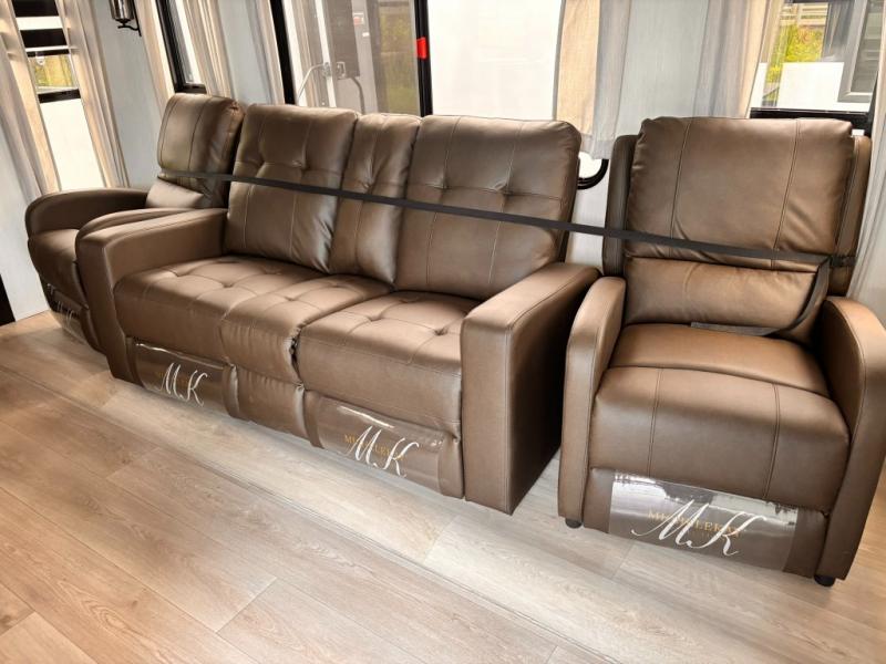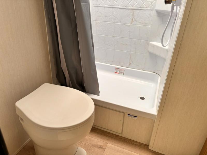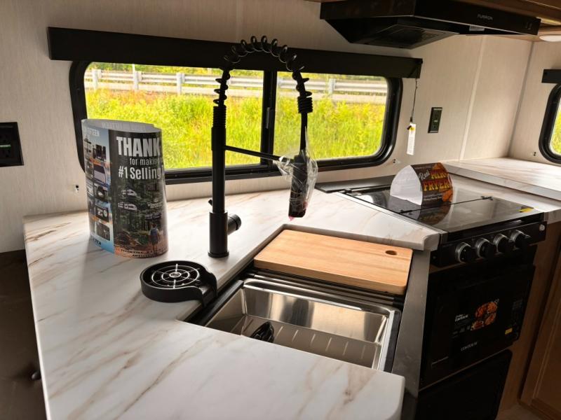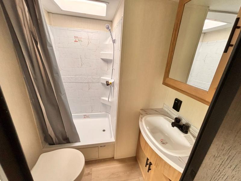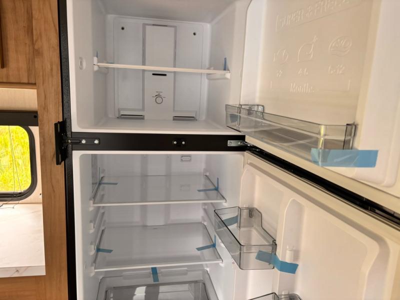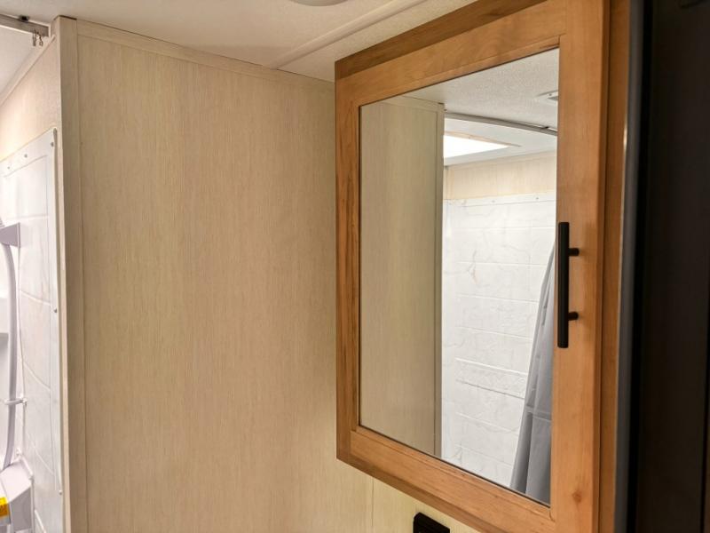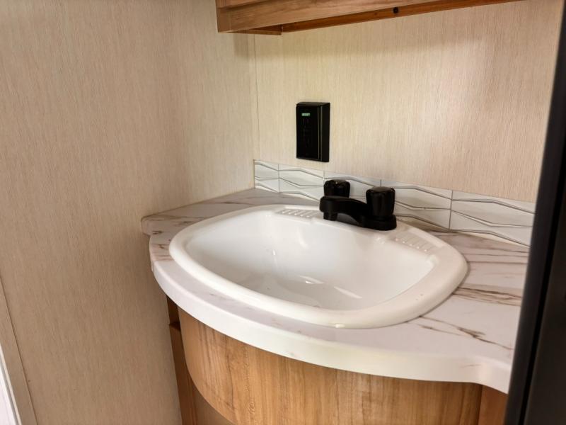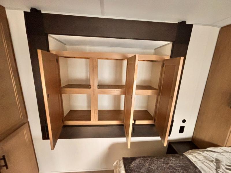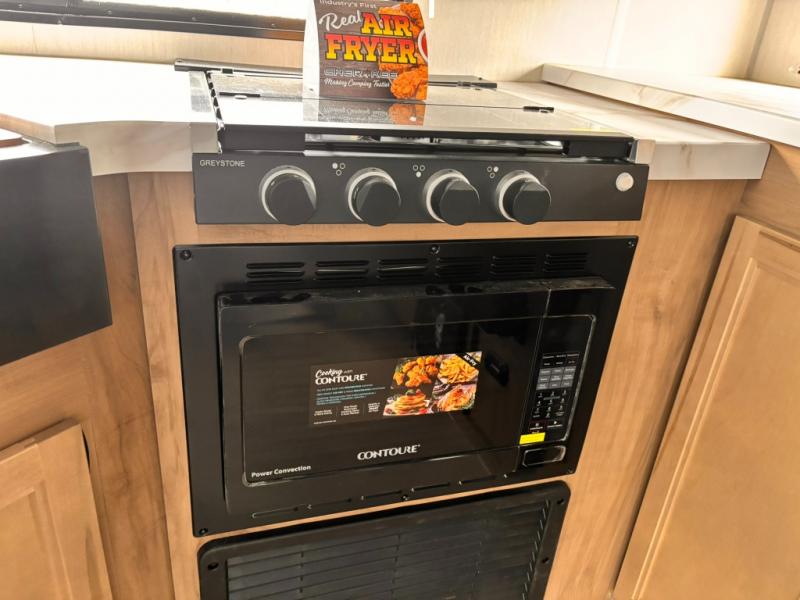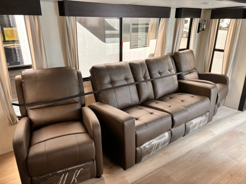 Camping trips to the lake just got sweeter in this spacious travel trailer. You will wake up feeling refreshed each morning after sleeping on the RV king bed. There are also dual bedside wardrobes, plus a dresser and a wardrobe slide out for more space. The linen closet with the option to add a washer and dryer will be another bonus if you plan to go full-time! The chef of your group will love the rear kitchen with a spacious pantry and 12V refrigerator for food storage, plus there is an air fryer to make some crispy chicken. The dinette with bench seating on one side and two chairs on the other will provide a place to dine together, or you can take your plate outdoors to sit under the 15' power awning. The sofa and dual lounge chairs within the living room slide will make you feel right at home, especially with the fireplace close by!