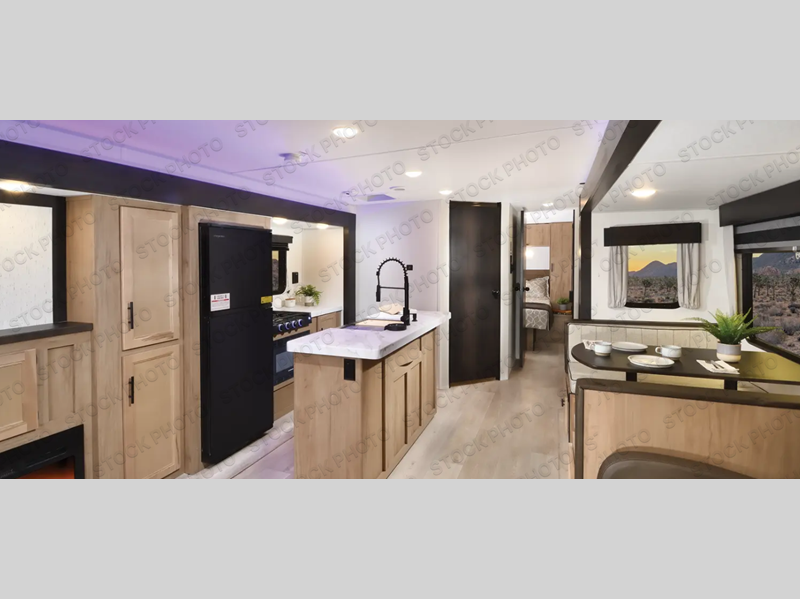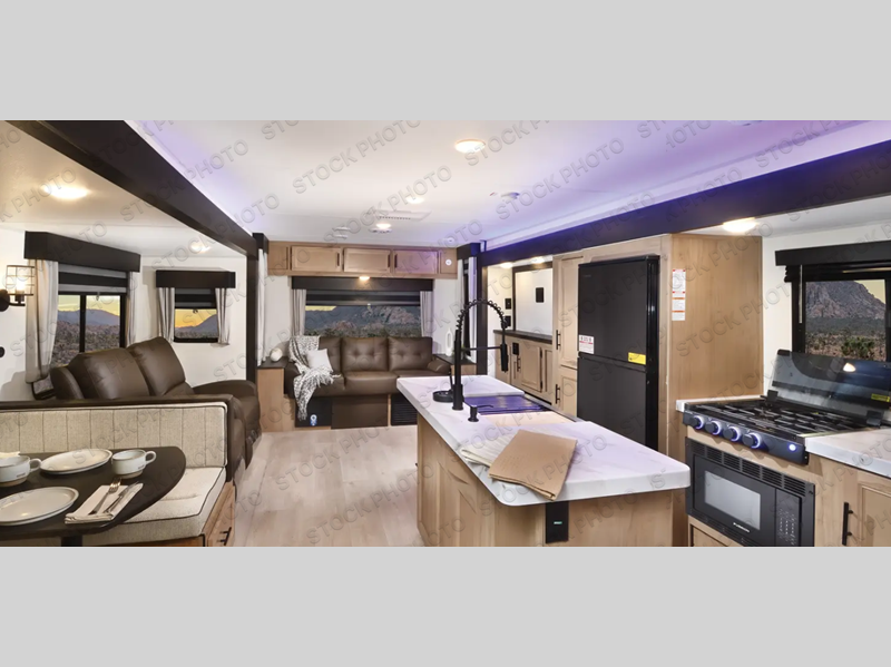 With two large slides opposing each other, you will have plenty of interior space in this travel trailer! The rear living area has a sofa with end tables to set your drink on and two recliner chairs across from the fireplace with a TV mount above it. Meal prepping will be easier with the kitchen island and you can enjoy your meals at the booth dinette then play a card game or two. The front private bedroom has a walk around RV king bed to lay your head on at night with wardrobes on either side to hang your clothes and an entrance into the dual entry bathroom which has a neo-angled shower to freshen up in each morning!