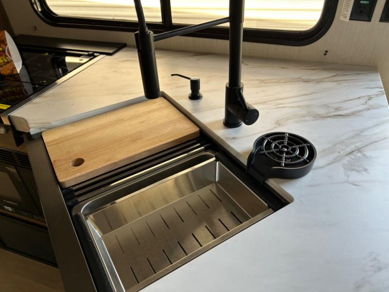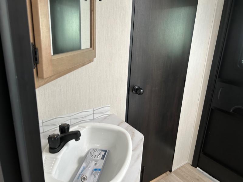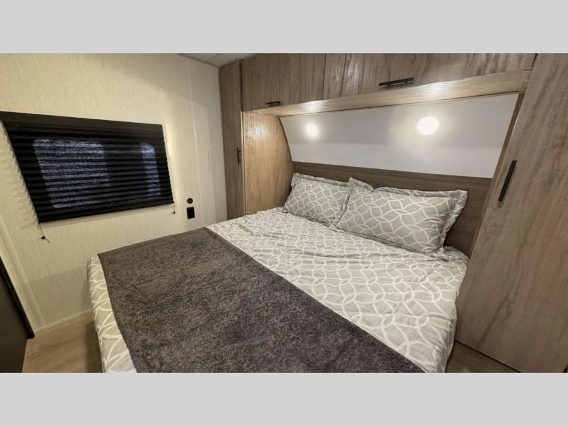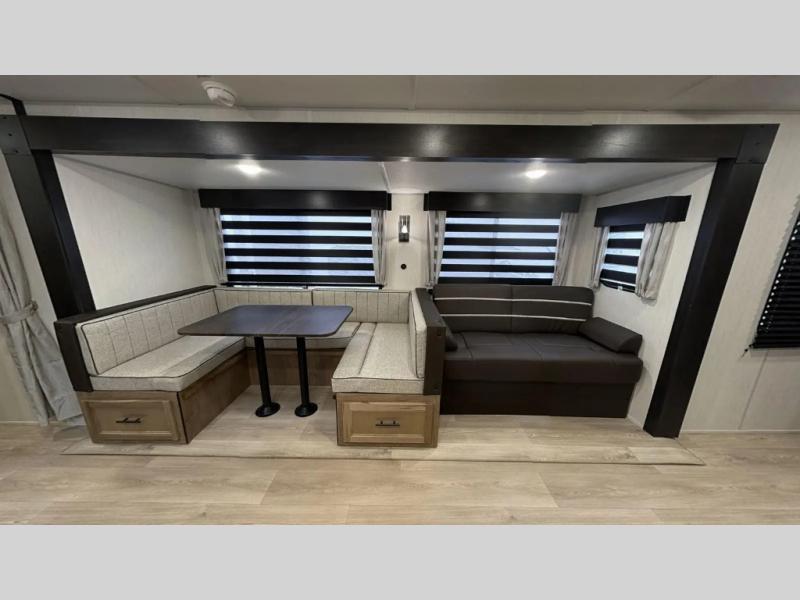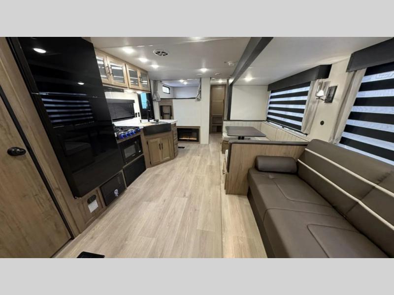 Escape your ordinary life with this innovative travel trailer! It features 64" top bunk bed above a 36" bottom bunk with wardrobes on either side of them, plus there is a wall at the foot of the beds with a fireplace on the other side. You will have your own privacy with the front private bedroom that has a walk-around RV king bed with wardrobes on either side and an entrance into the dual entry bathroom which has a neo-angled shower to freshen up in each morning plus one of the dual entry doors to the unit. The sofa and U-shaped dinette can also transform into extra sleeping spaces when you aren't using them to enjoy a meal or relax in front of the TV mount. The outdoor bar and grill comes with a 5.6 cu. ft. outdoor refrigerator and everything you need to prepare delicious meals outdoors. You even have a rear storage rack and outside storage areas to store your outdoor gear!