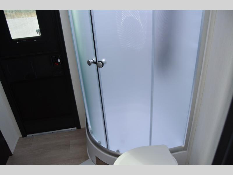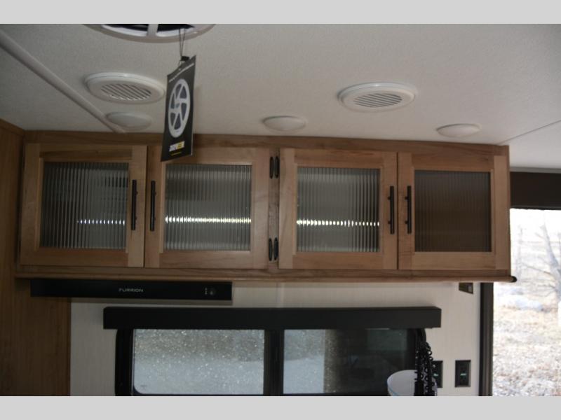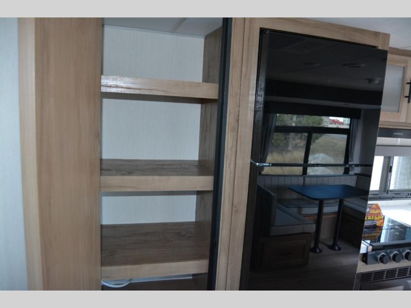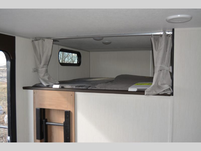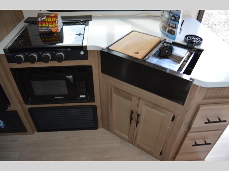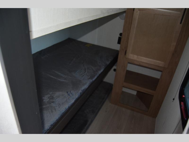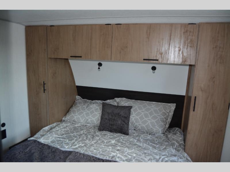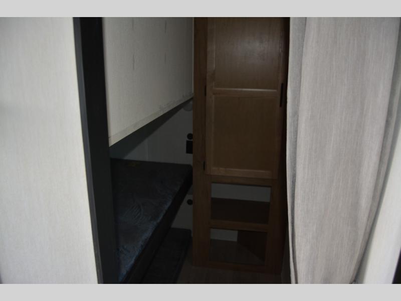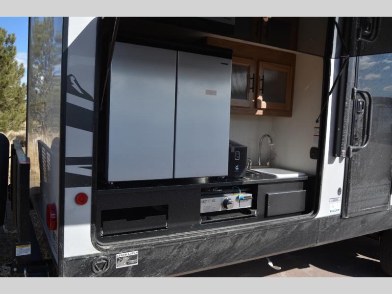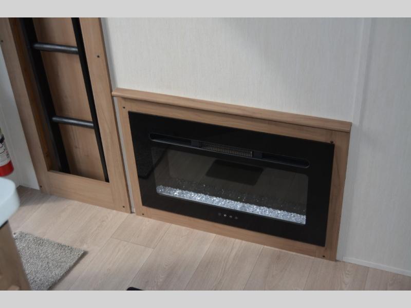 How does having a master bedroom for yourself and a private bunkhouse for your guests sound? This innovated design gives everyone their own space at night with a full queen loft bed, a 36" bunk bed and a walk-around queen bed, plus the U-shaped dinette and sofa provide more sleeping space. Everyone will enjoy the fireplace on chilly nights and the cook will love all the kitchen appliances including the large pantry and farm sink. The outdoor bar and grill with a 5.6 cu. ft. refrigerator and a pull-out cooktop, a sink and large storage areas are a must have when you love to be outside.