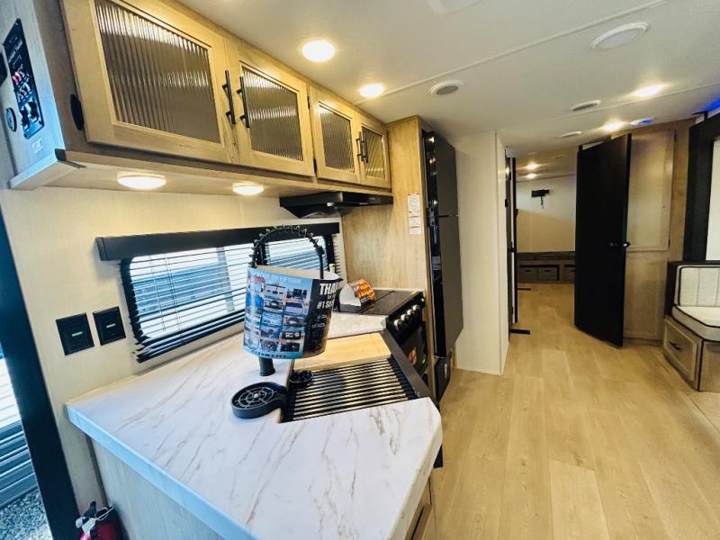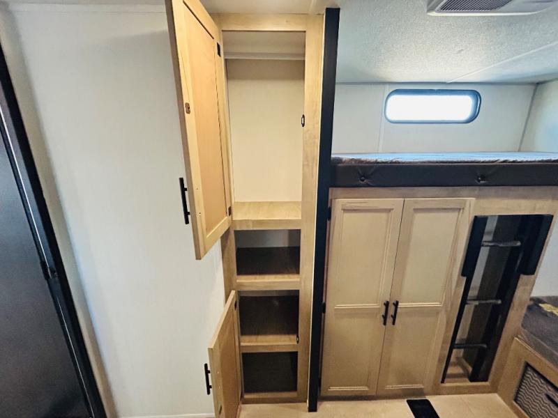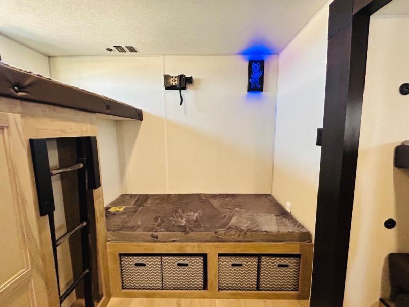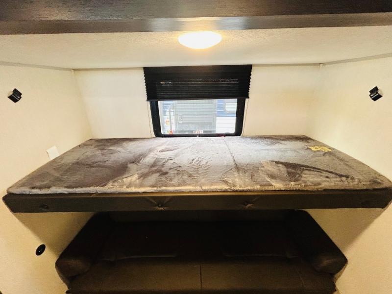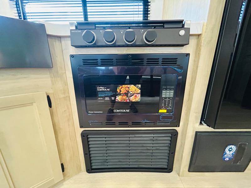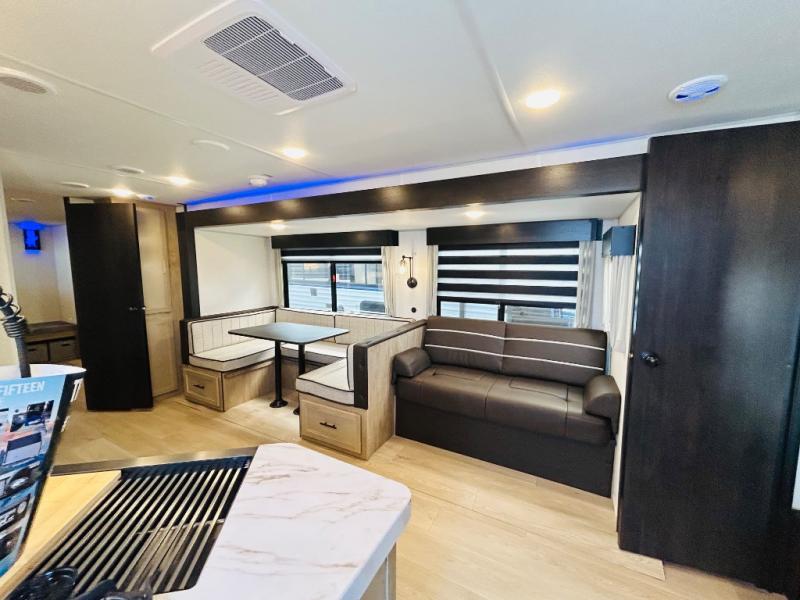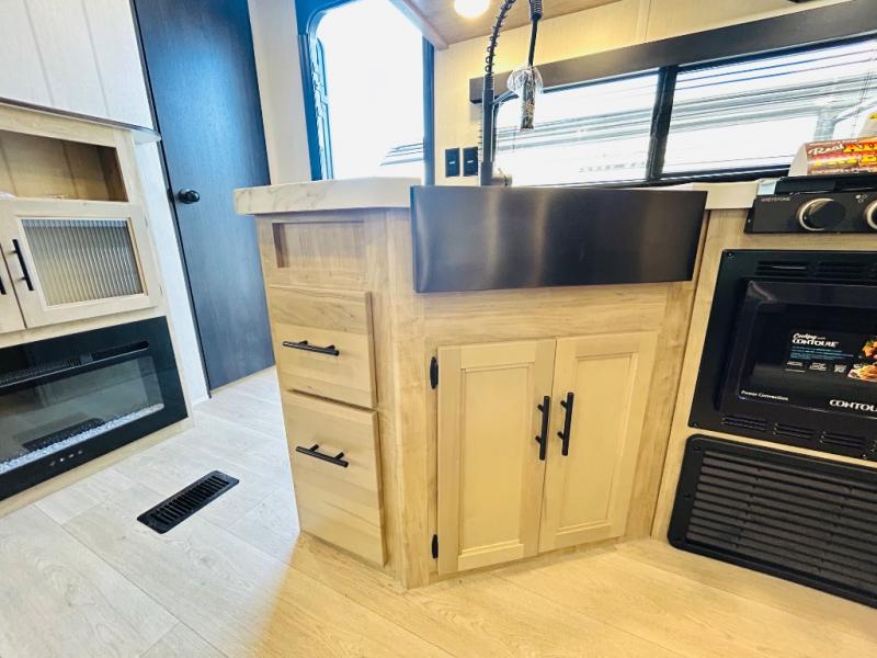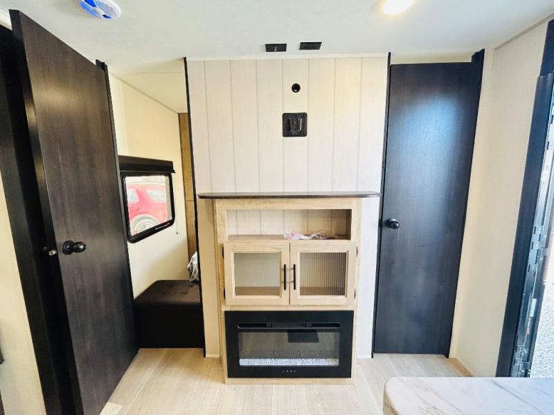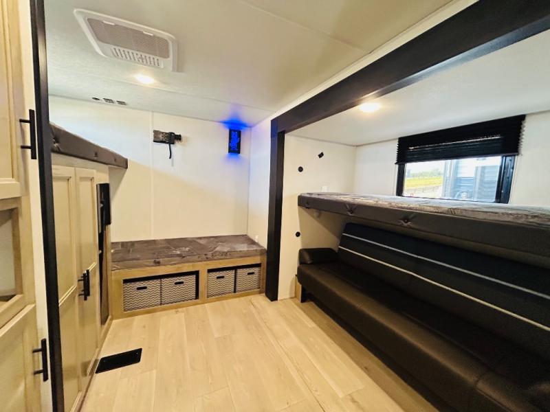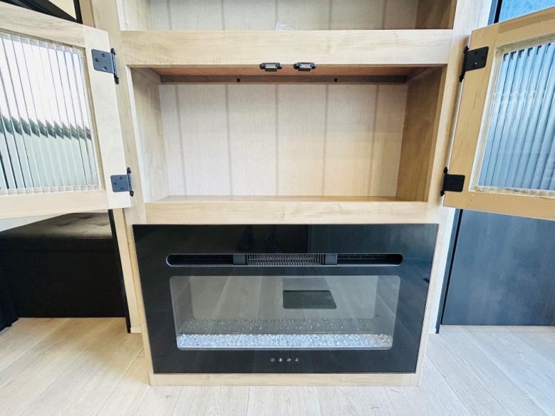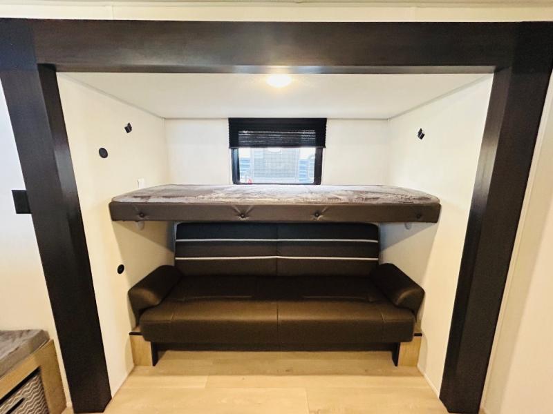 Double slides create spacious living areas in this travel trailer! The chef can prepare their best meals either indoors with the three burner cooktop and air fryer microwave, or at the outdoor kitchen. The kids or guests can sleep in the rear private bunkhouse with a bunk, double bunk, and flip-up bunk above a sofa. The front private bedroom has a walk around RV king bed for a great night's rest plus dual closets to keep your things organized. In the morning, everyone can meet in the combined kitchen and living room around the U-shaped dinette and sofa, and the fireplace here will make it feel more like home.