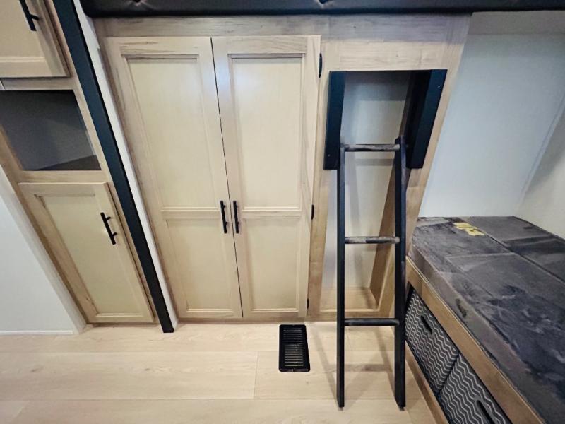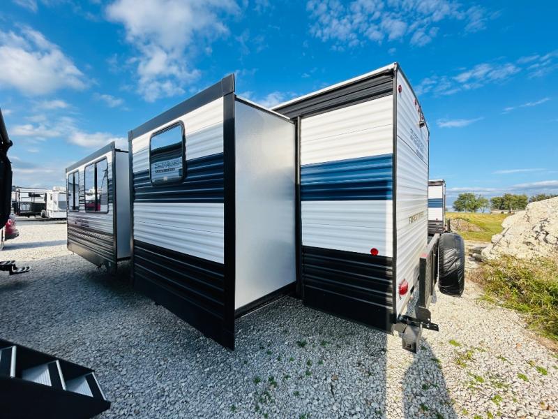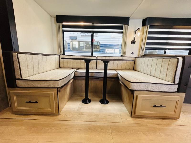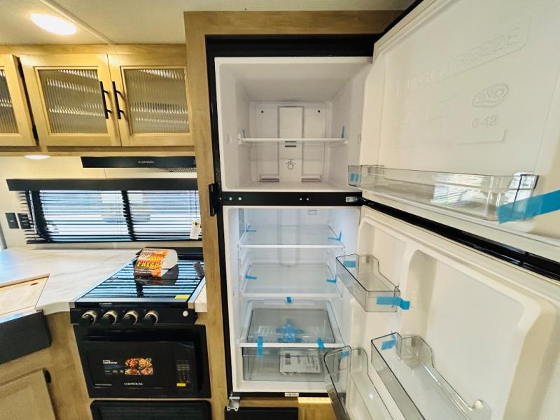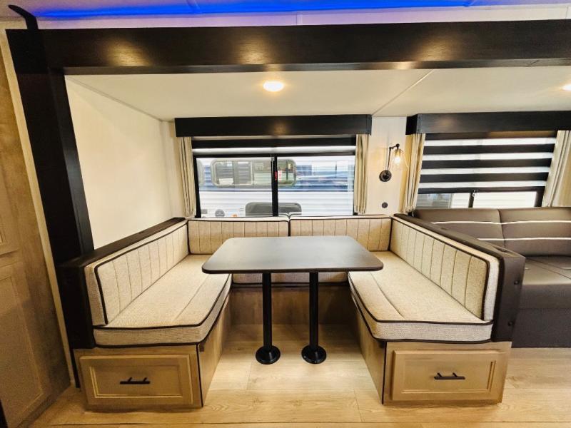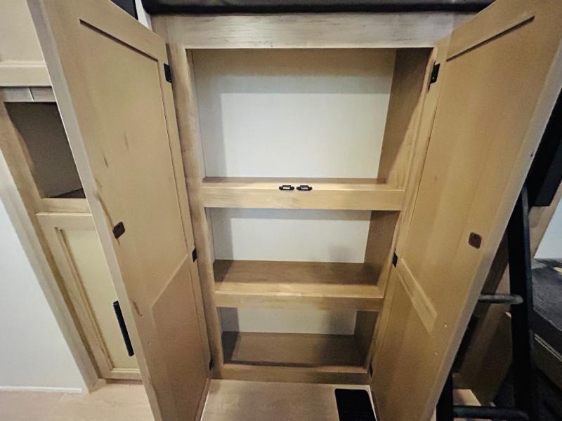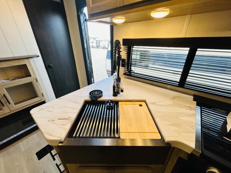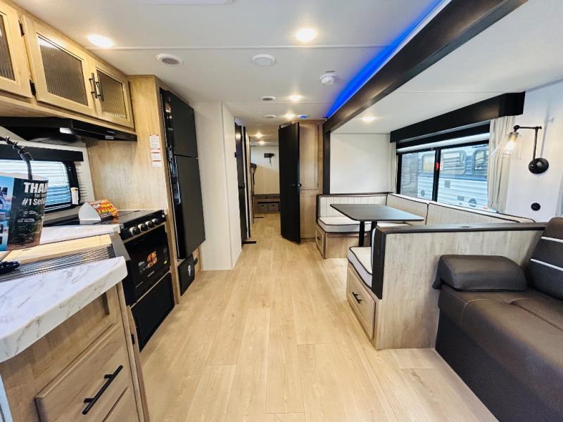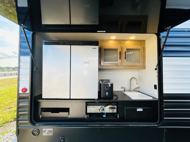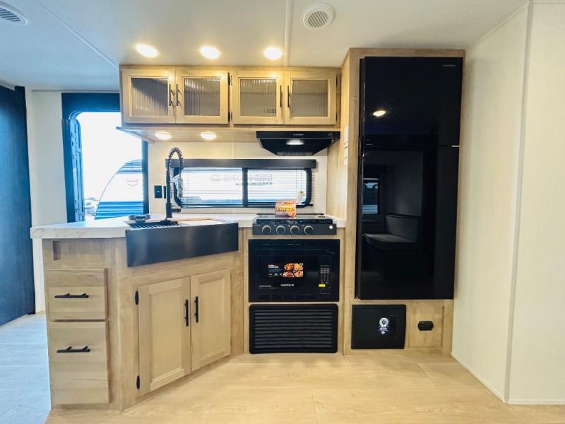 Double slides create spacious living areas in this travel trailer! The chef can prepare their best meals either indoors with the three burner cooktop and air fryer microwave, or at the outdoor kitchen. The kids or guests can sleep in the rear private bunkhouse with a bunk, double bunk, and flip-up bunk above a sofa. The front private bedroom has a walk around RV king bed for a great night's rest plus dual closets to keep your things organized. In the morning, everyone can meet in the combined kitchen and living room around the U-shaped dinette and sofa, and the fireplace here will make it feel more like home.