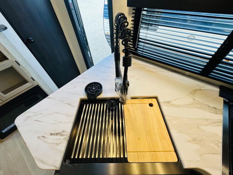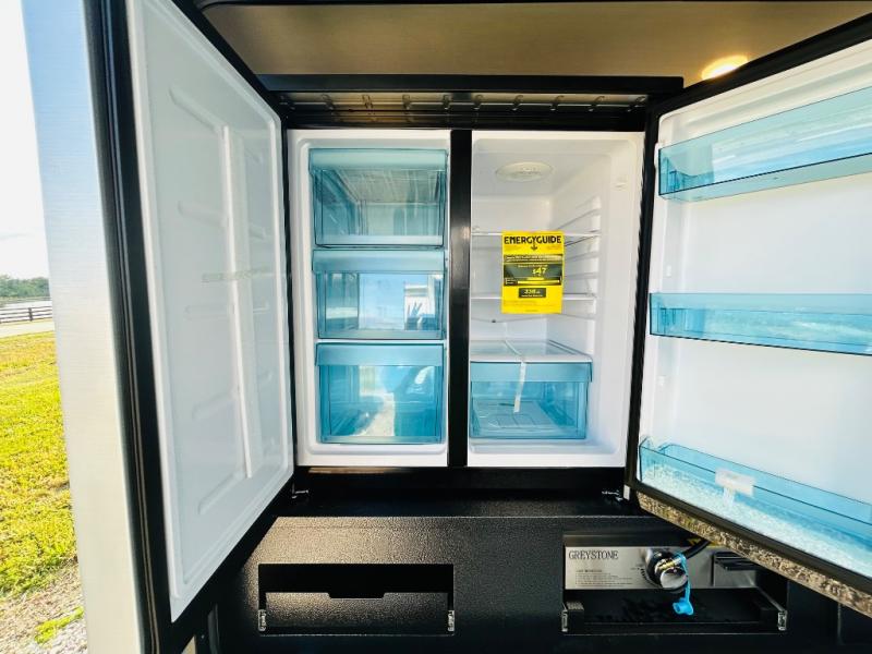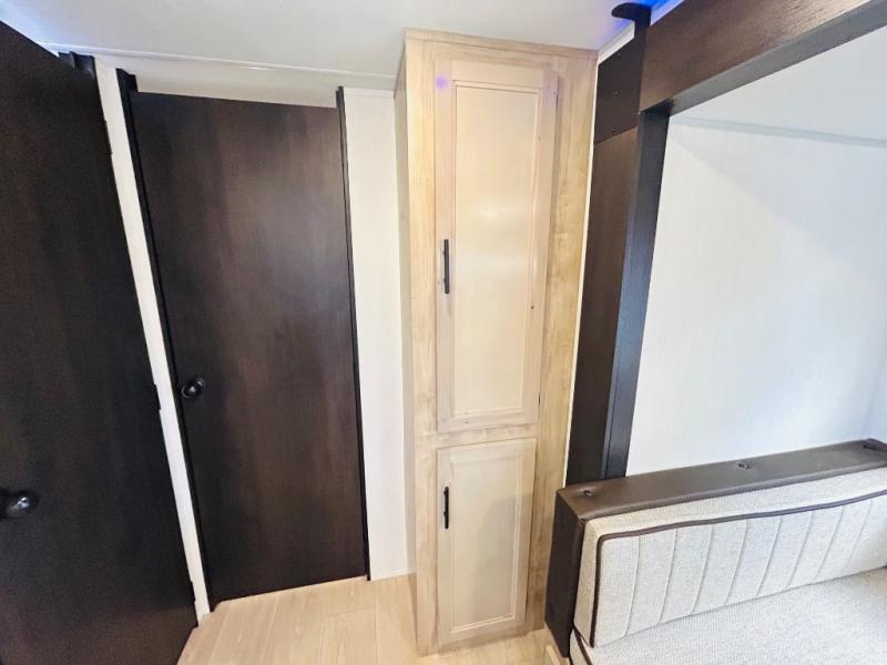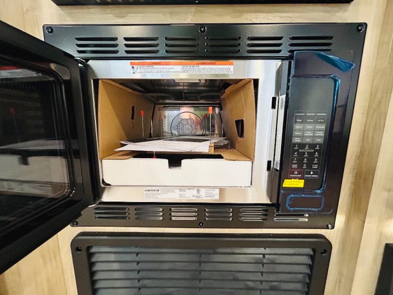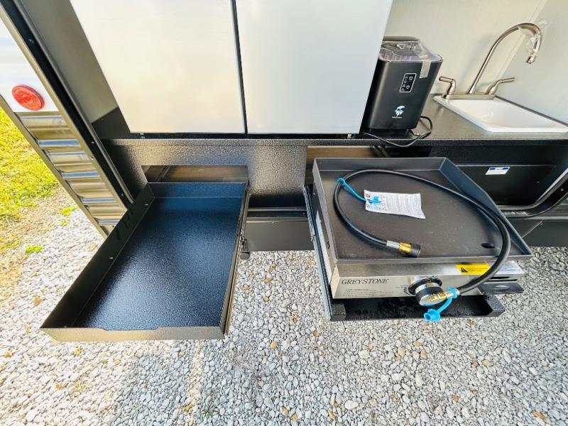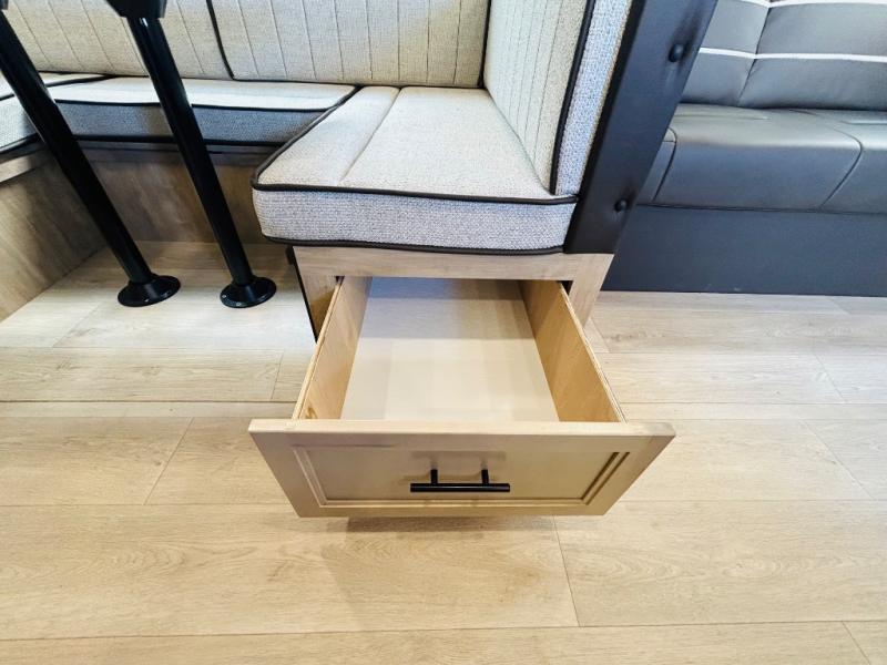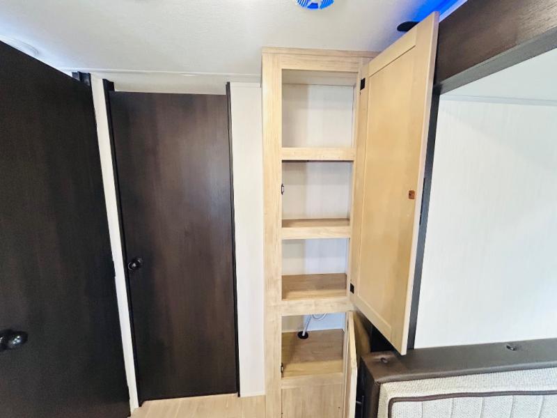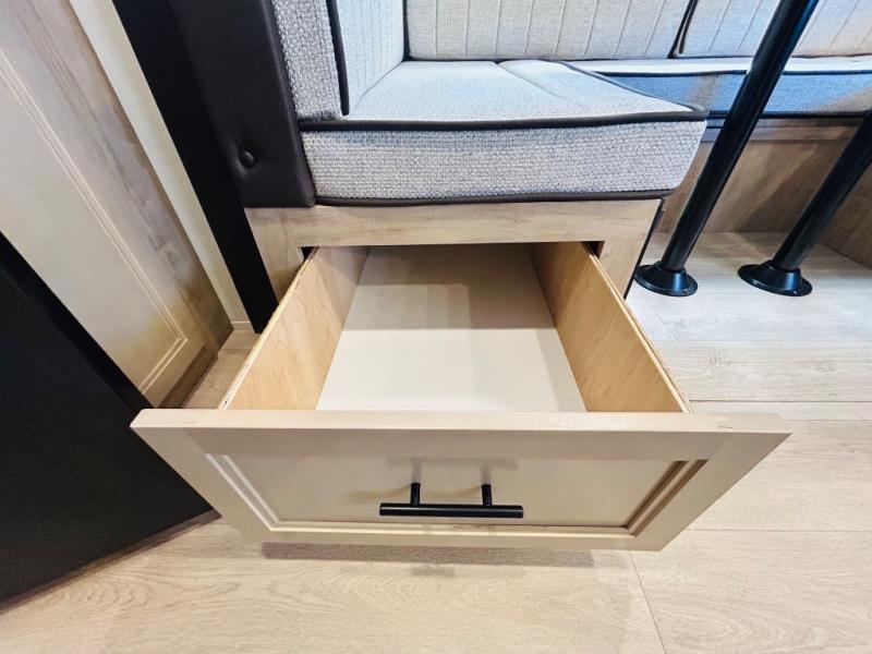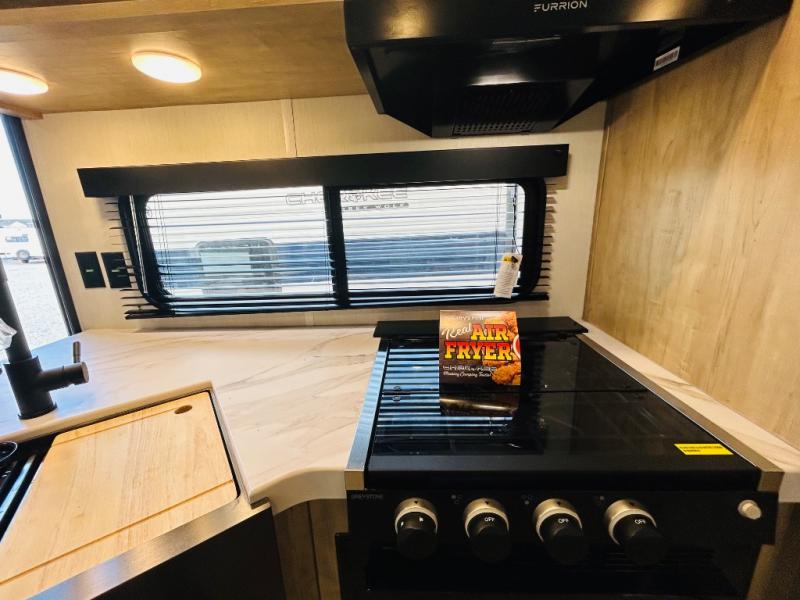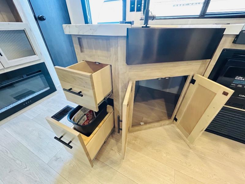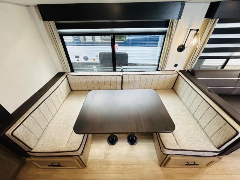Double slides create spacious living areas in this travel trailer! The chef can prepare their best meals either indoors with the three burner cooktop and air fryer microwave, or at the outdoor kitchen. The kids or guests can sleep in the rear private bunkhouse with a bunk, double bunk, and flip-up bunk above a sofa. The front private bedroom has a walk around RV king bed for a great night's rest plus dual closets to keep your things organized. In the morning, everyone can meet in the combined kitchen and living room around the U-shaped dinette and sofa, and the fireplace here will make it feel more like home.