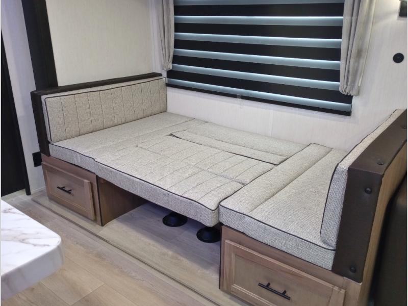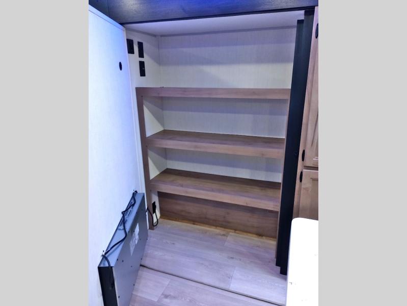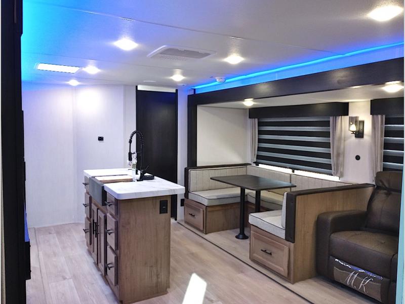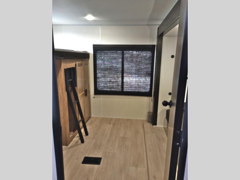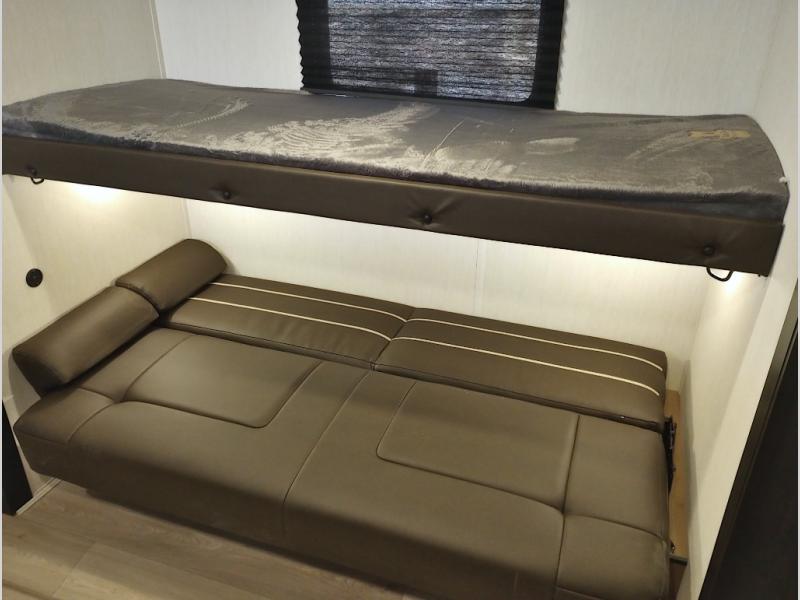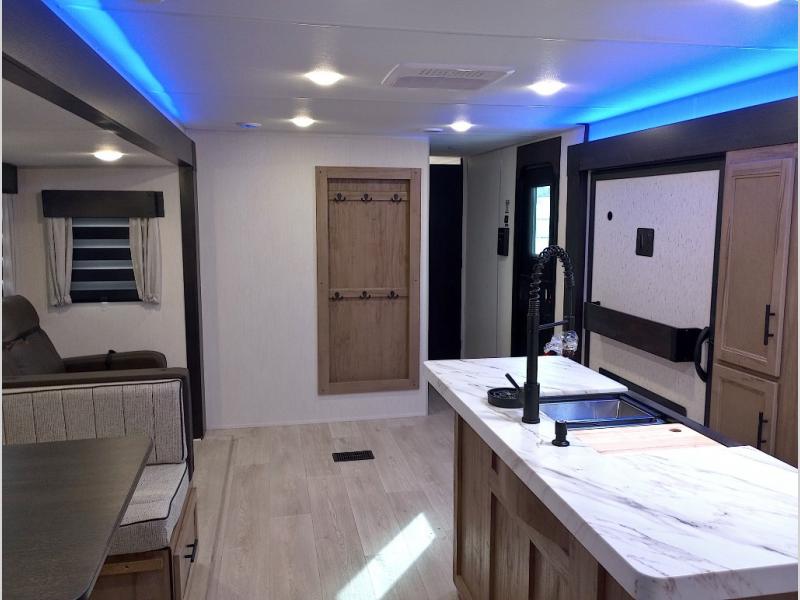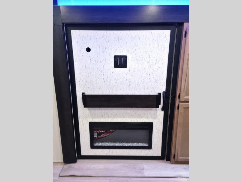 The whole gang will love this travel trailer with triple slides for more space. Your guests or the kids are sure to claim the rear private bunkhouse with a double bunk plus a flip-up bunk above a sofa and a TV mount if you want to add a television here. You'll have the front private bedroom with an RV king bed all to yourselves, and the full bath is close by for easy nighttime use. The middle combined kitchen and living area features dual opposing slides, a kitchen island, plus a U-shaped dinette and sofa. There is also an entertainment center with a fireplace and a hidden pantry behind for movies, snacks and more. Outside, two power awnings, exterior storage, and an outside kitchen makes it easier to spend more time outdoors!