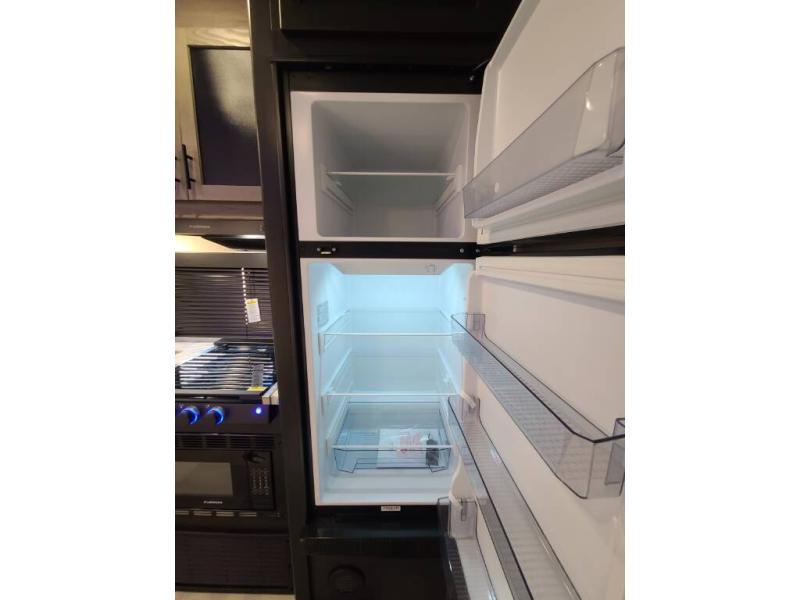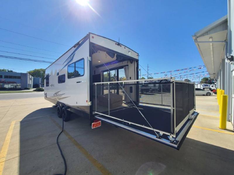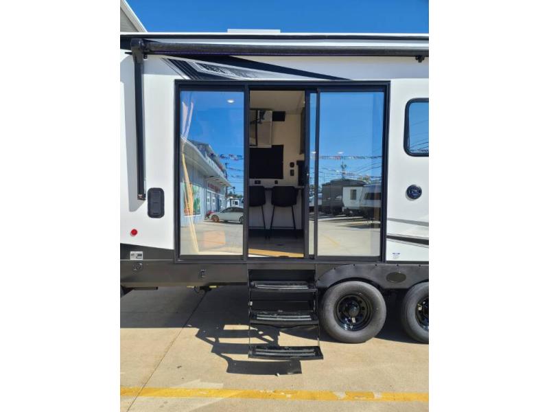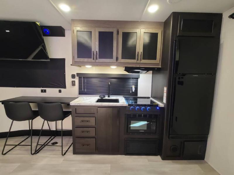 You can't go wrong when you have this toy hauler in tow! There is 14' 5" of cargo space for your toys, and an optional ramp door patio deck railing can be added if you want to turn the door into a patio. The three burner cooktop will allow you to make meals each day, and the flip-up counter with stools provides a place to dine at. You could also take your plate outdoors to eat under the 18' power awning with LED accent lighting.