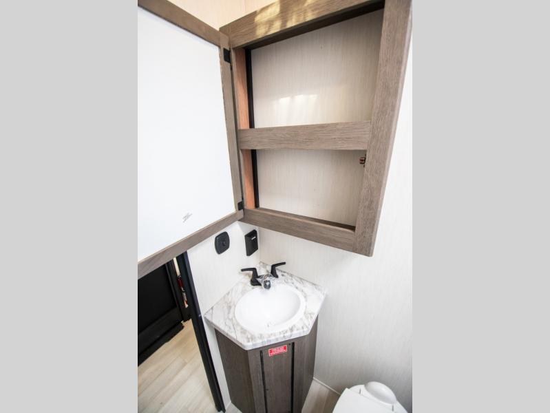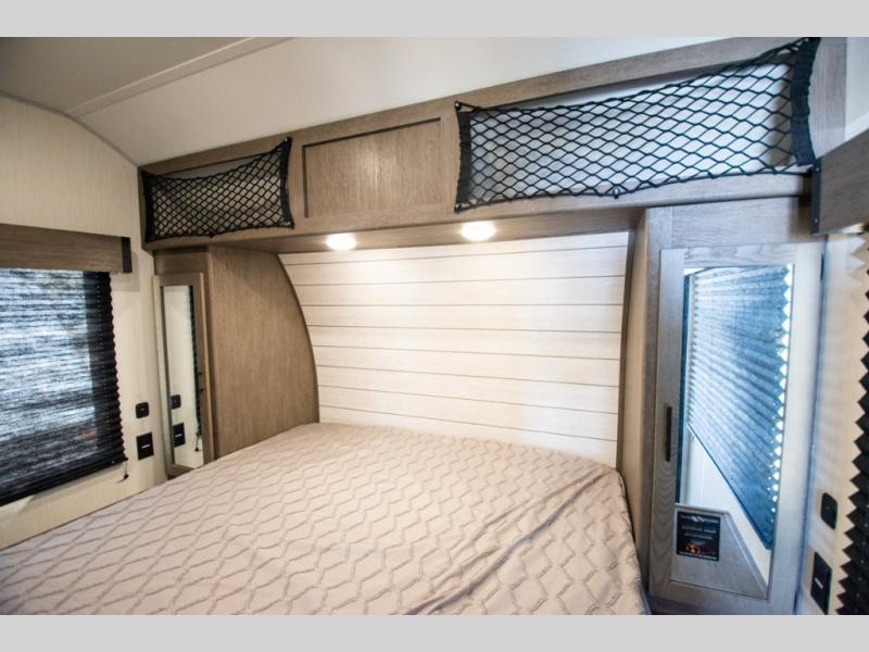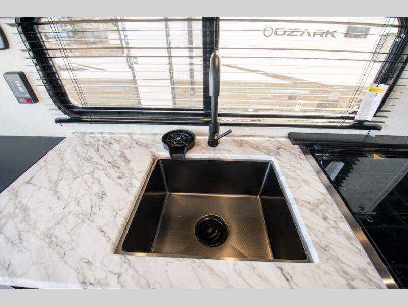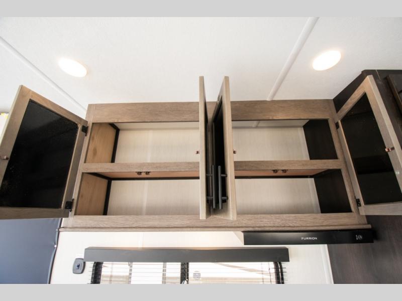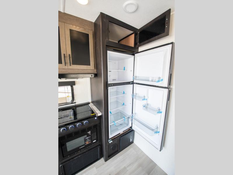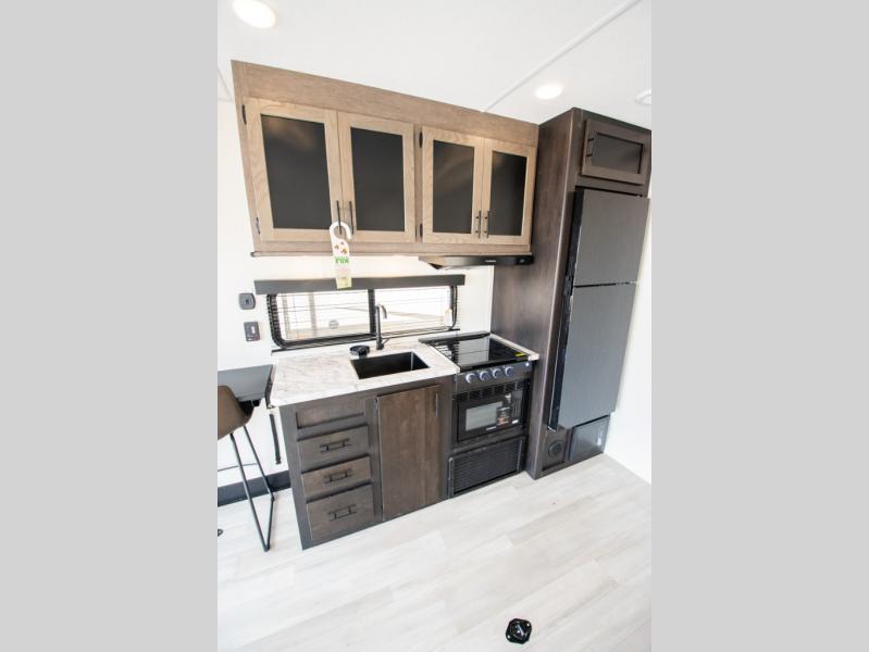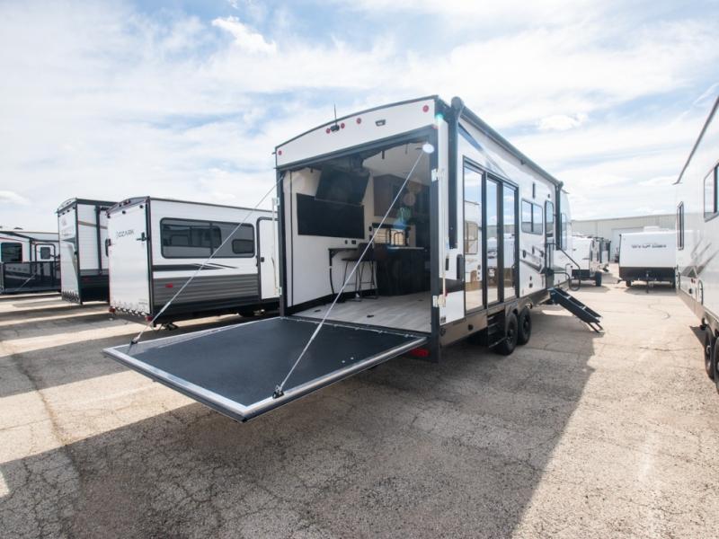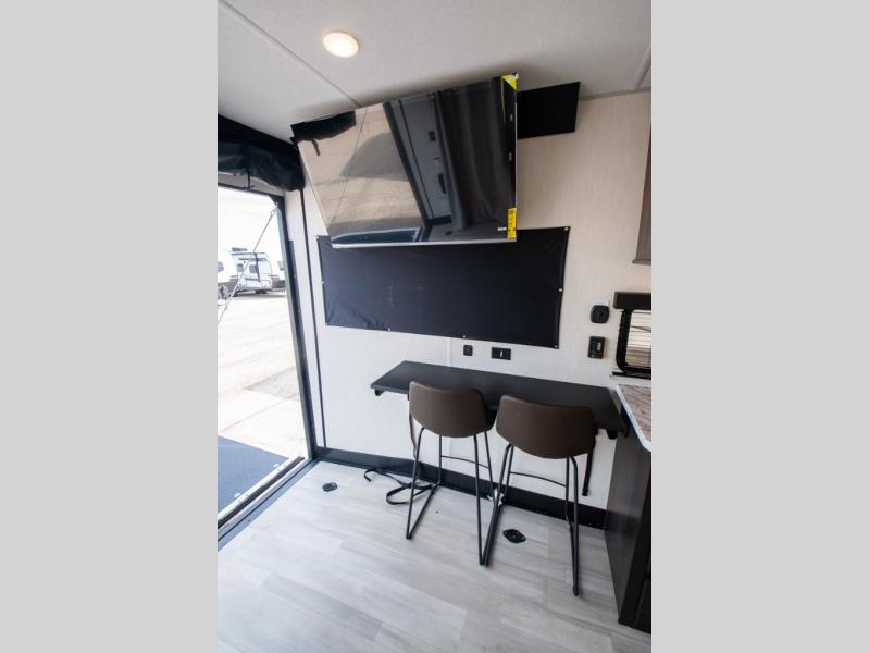 You can't go wrong when you have this toy hauler in tow! There is 14' 5" of cargo space for your toys, and an optional ramp door patio deck railing can be added if you want to turn the door into a patio. The three burner cooktop will allow you to make meals each day, and the flip-up counter with stools provides a place to dine at. You could also take your plate outdoors to eat under the 18' power awning with LED accent lighting.