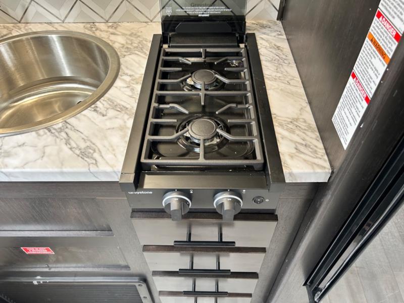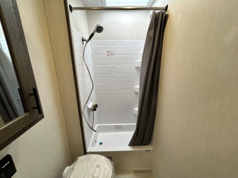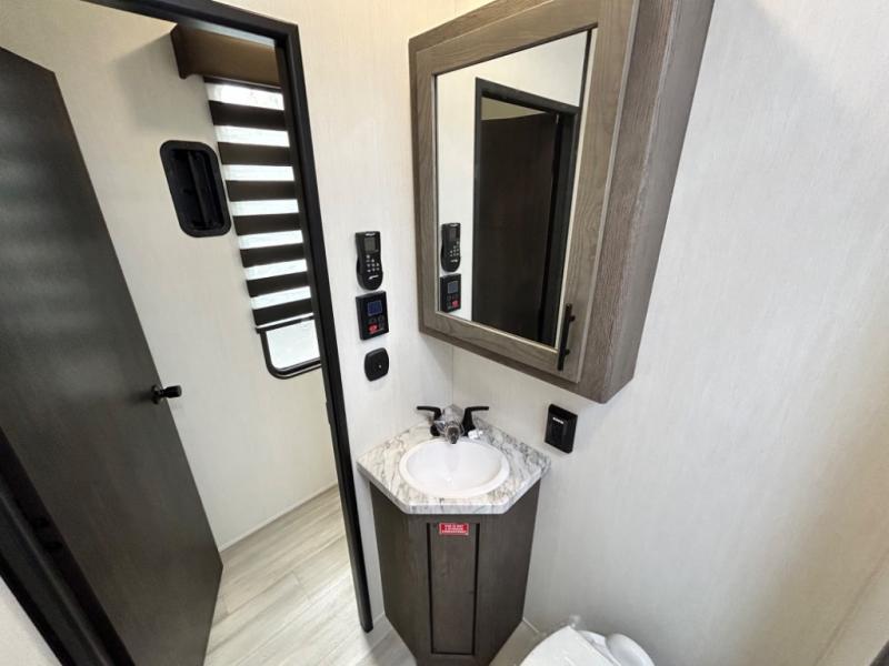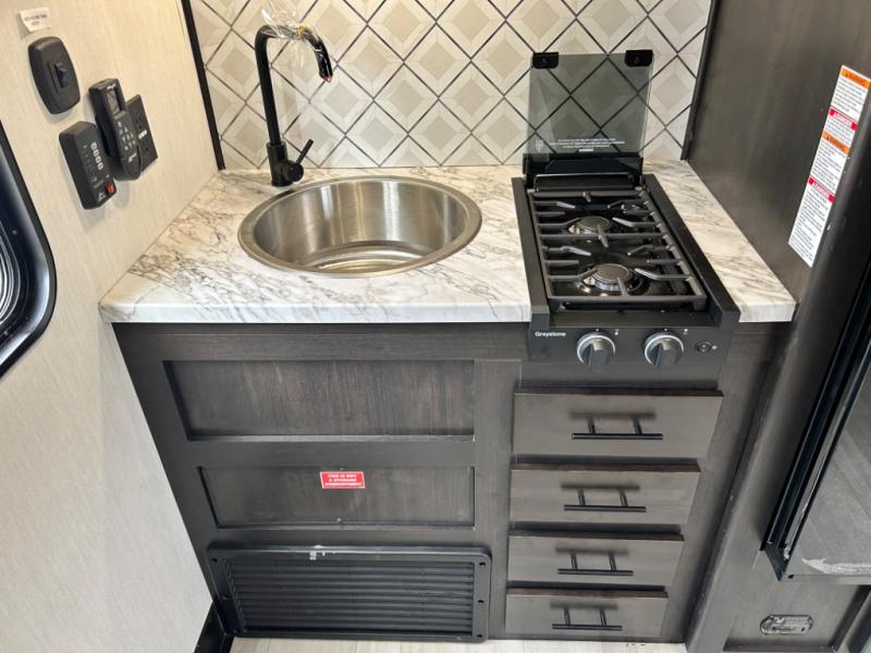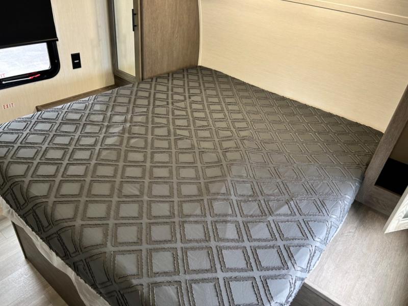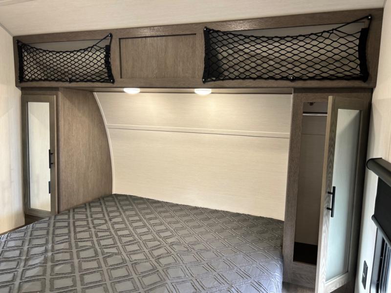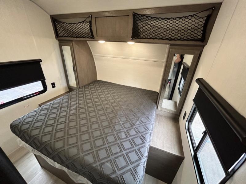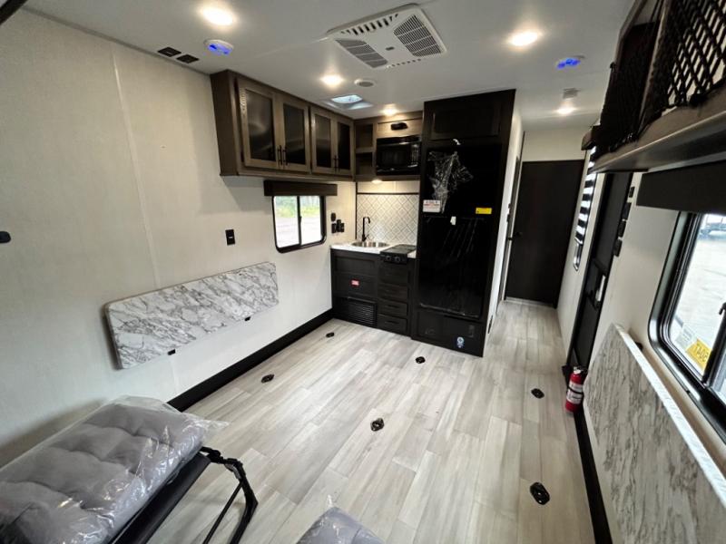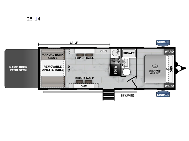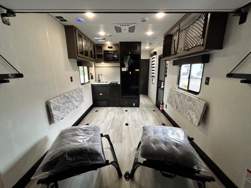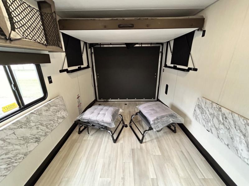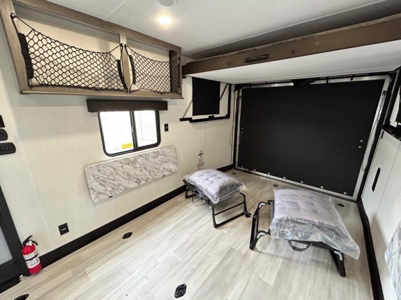 This model has a similar layout to 24-14.5, but you'll enjoy a larger exterior length and two flip-up tables instead of one! Since there is 14' 2" of total garage space, you can plan to bring along kayaks, bikes, and hiking gear galore. This model includes a removable dinette table with a manual bunk bed so your guests have a comfy place to sleep each night, while you take the Wolf Pack king bed in the front bedroom. There is also full bath and kitchen amenities so you'll have everything you need on each camping trip!